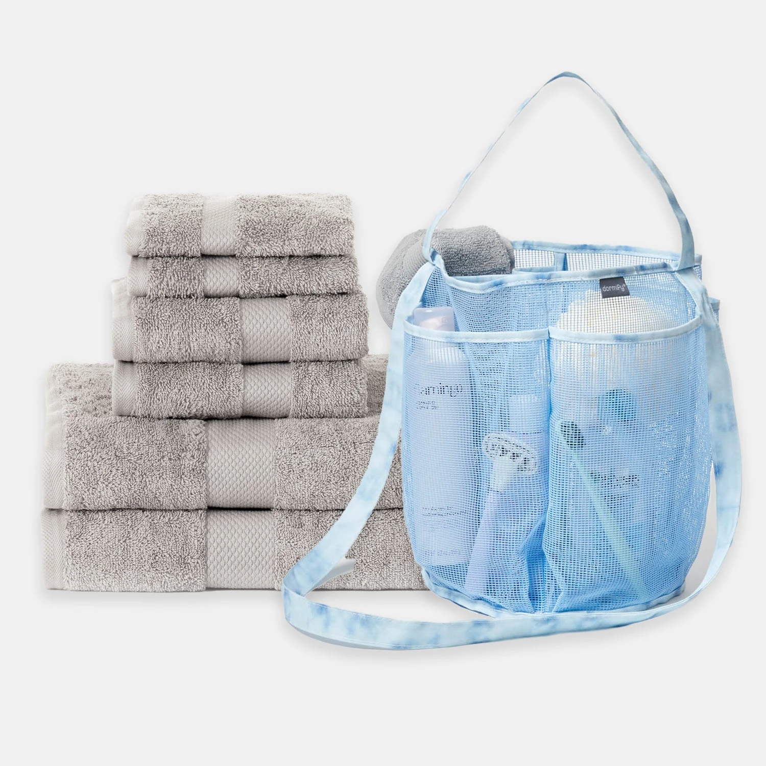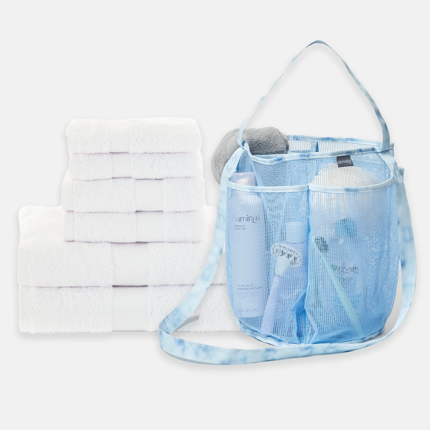 This college bath bundle is your dorm shower solution. This set includes everything you need. Keep all your shampoo, conditioner, body wash and toiletries neat and organized in your own portable mesh tote. The mesh allows for water to drain right through, and cleans easily. It’s generously sized with lots of pockets to make storing all your shower stuff neat and easy. The 6-Piece Towel Set gives you 100% cotton towels to cover all of your dorm bath and shower needs.