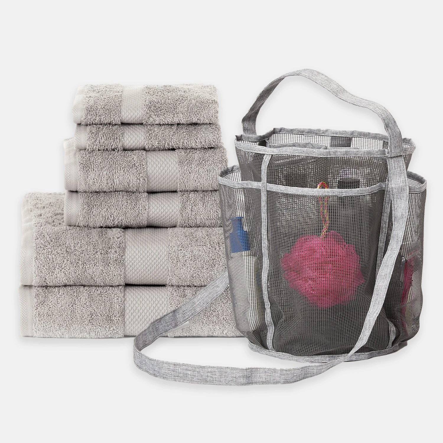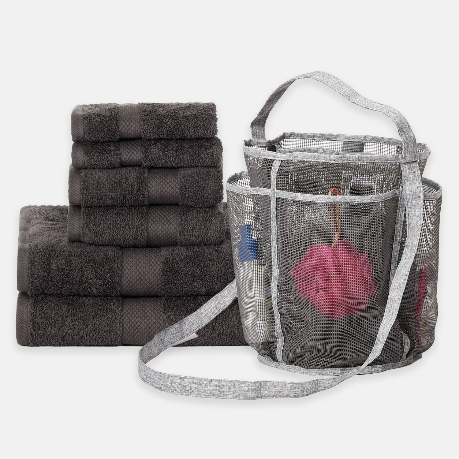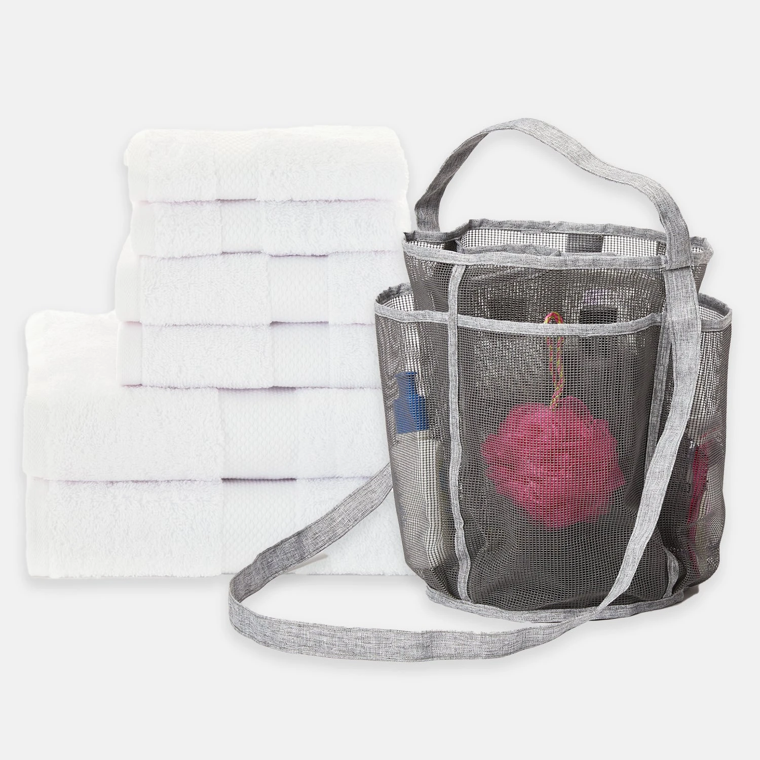 This college bath bundle is your dorm shower solution. This set includes everything you need. Keep all your shampoo, conditioner, body wash and toiletries neat and organized in your own portable mesh tote. The mesh allows for water to drain right through, and cleans easily. It’s generously sized with lots of pockets to make storing all your shower stuff neat and easy. The 6-Piece Towel Set gives you 100% cotton towels to cover all of your dorm bath and shower needs.Â