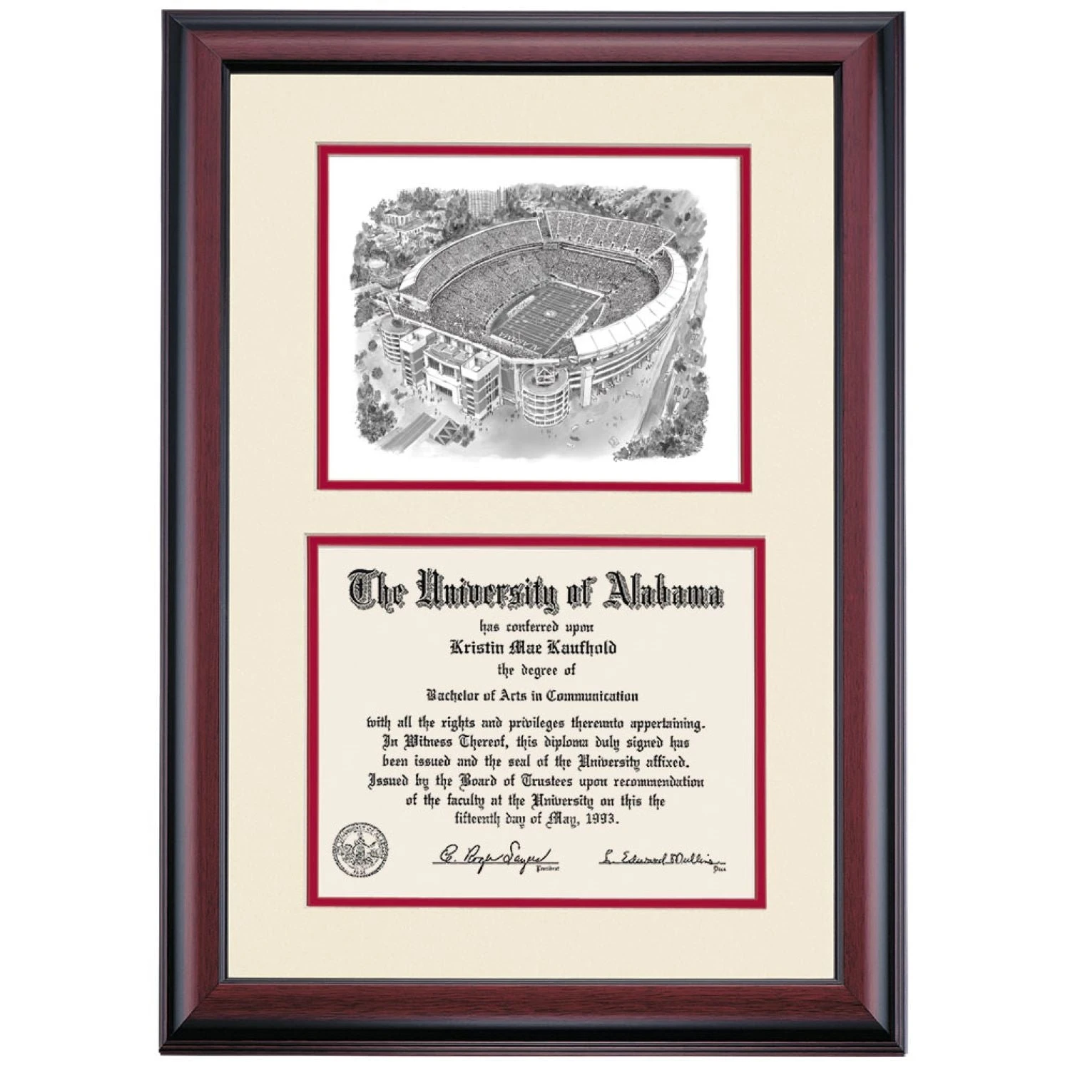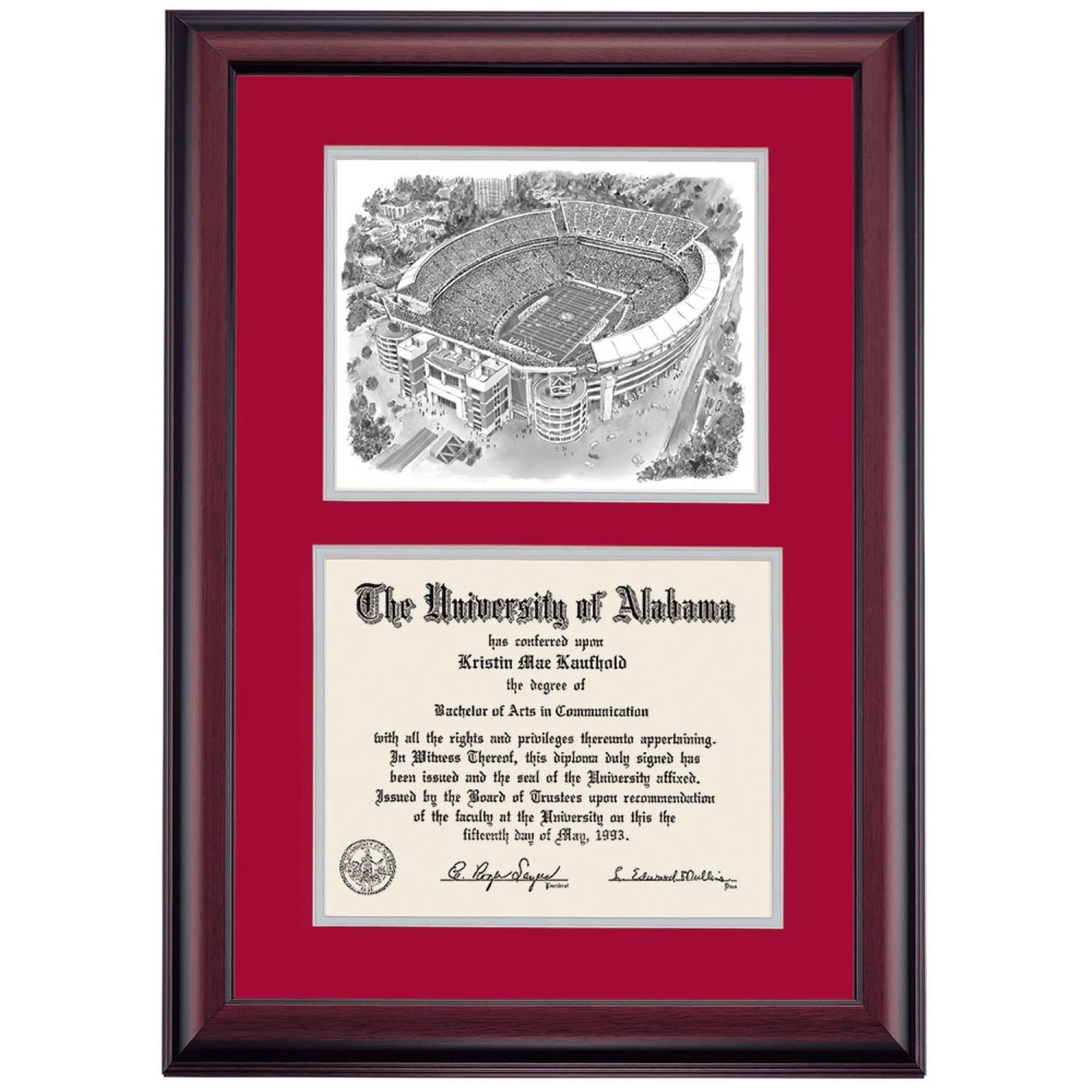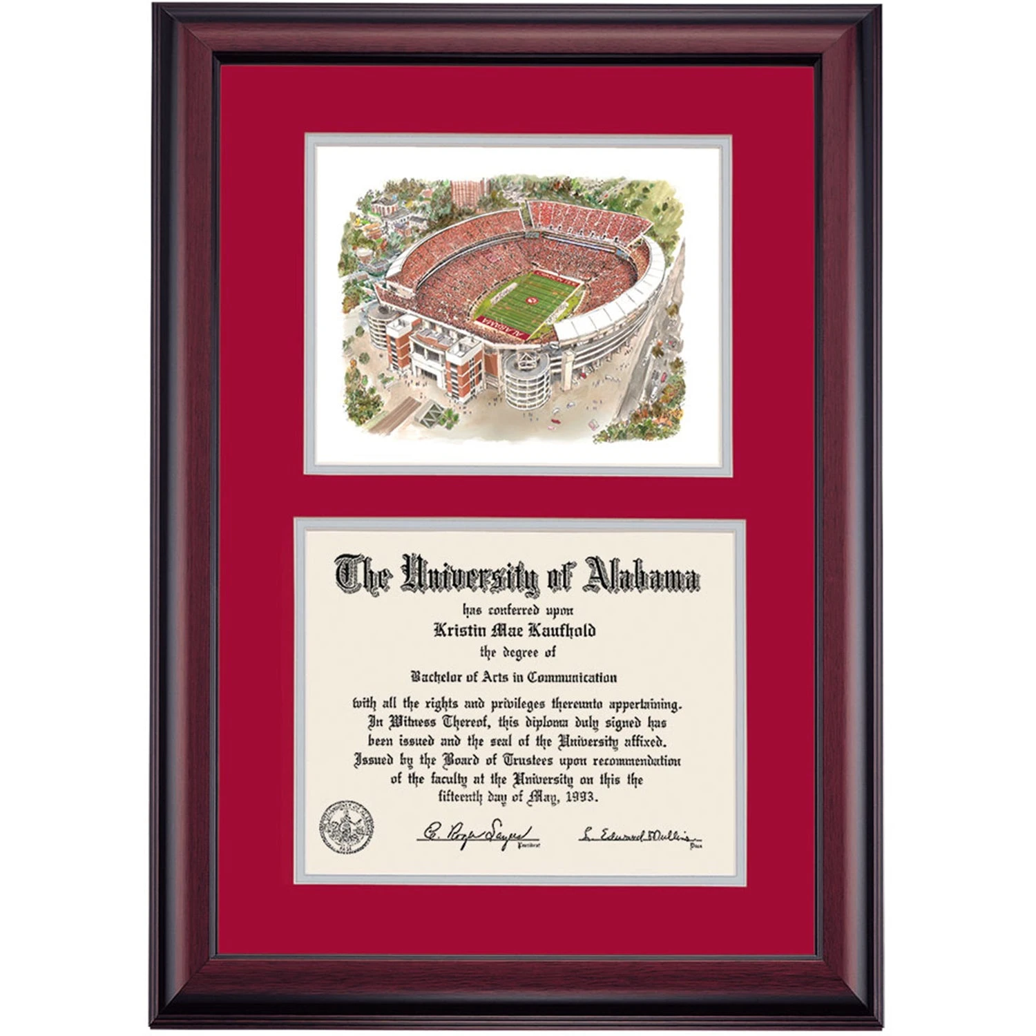 Celebrate your graduation in style with this handcrafted premier diploma frame which includes a Professional Print of Bryant–Denny Stadium. Custom crafted to fit your University of Alabama diploma, this frame features accent matting and high quality hardwood moulding.