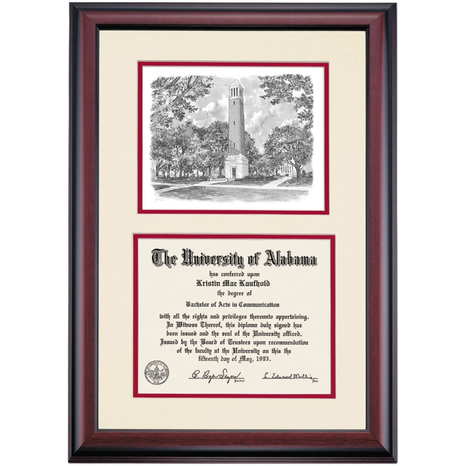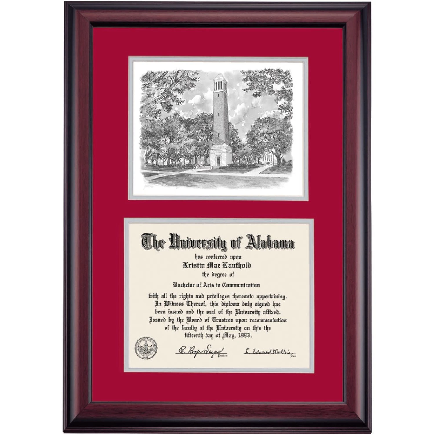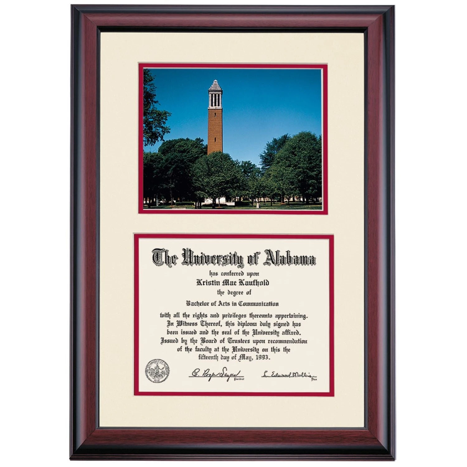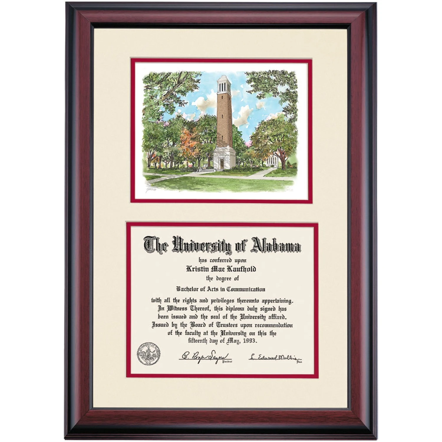 Celebrate your graduation in style with this handcrafted premier diploma frame which includes a Professional Print of Denny Chimes. Custom crafted to fit your University of Alabama diploma, this frame features accent matting and high quality hardwood moulding.