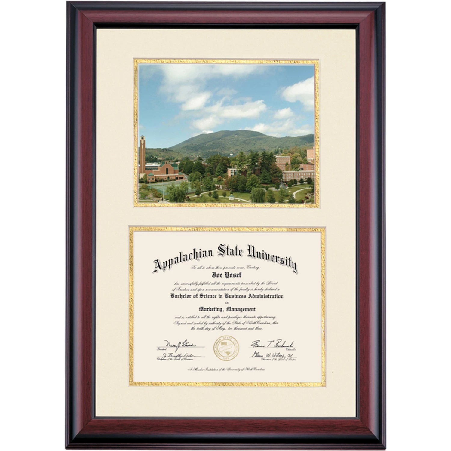 Celebrate your graduation in style with this handcrafted premier diploma frame which includes a Professional Photograph of Durham Park. Custom crafted to fit your Appalachian State University diploma, this frame features accent matting and high quality hardwood moulding.