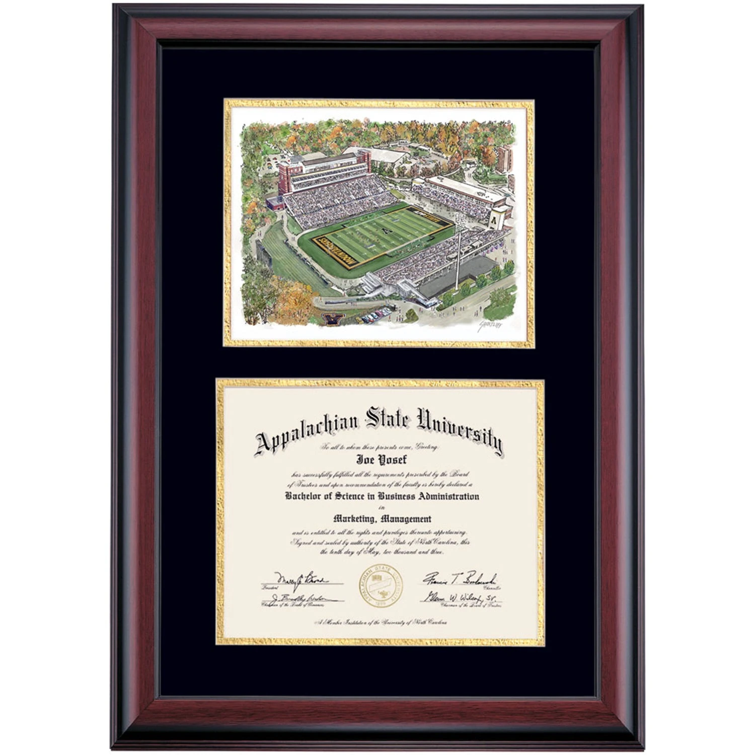 Celebrate your graduation in style with this handcrafted premier diploma frame which includes a Professional Print of the Football Stadium. Custom crafted to fit your Appalachian State University diploma, this frame features accent matting and high quality hardwood moulding.