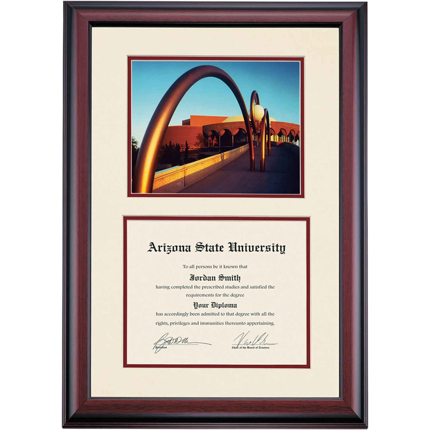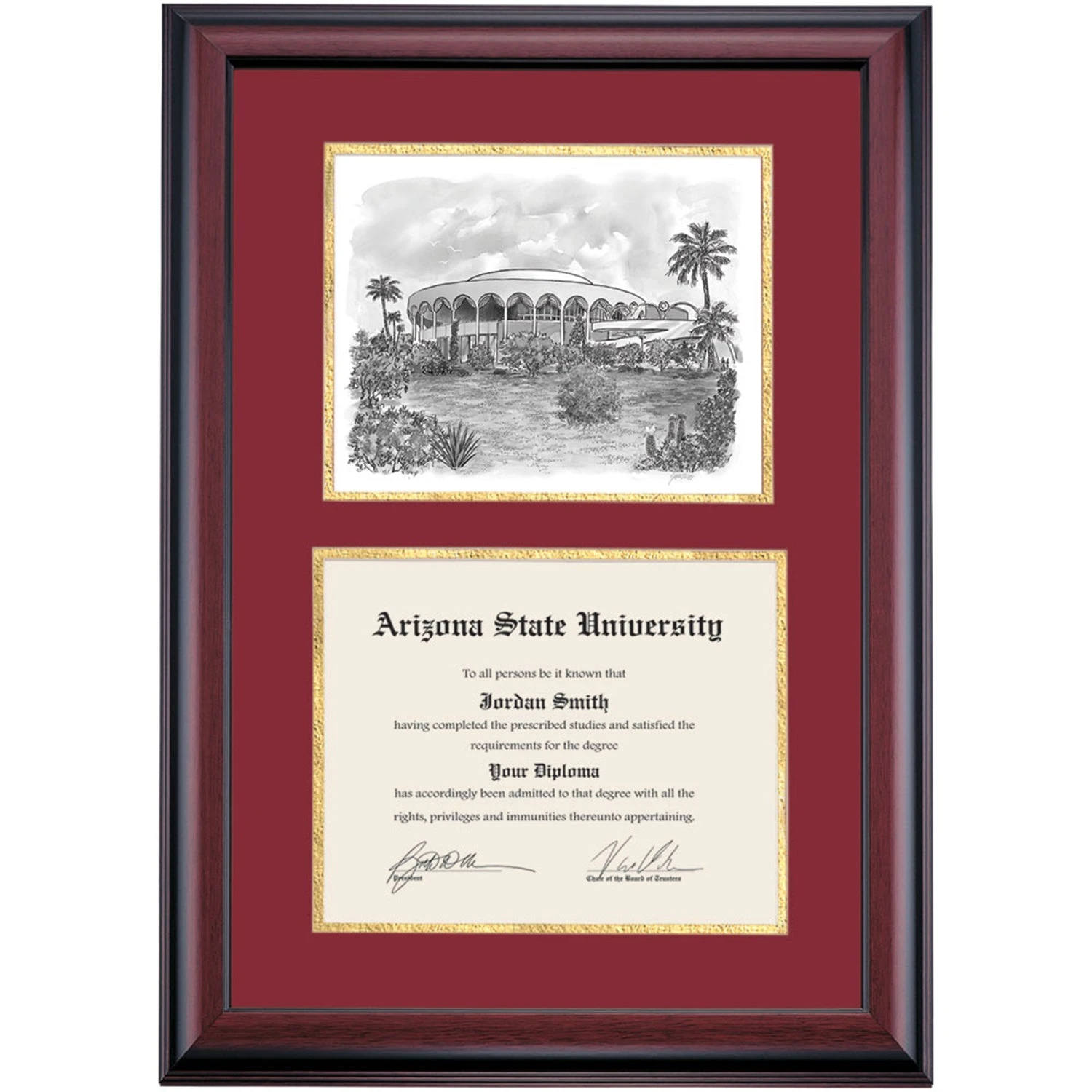 Celebrate your graduation in style with this handcrafted premier diploma frame which includes a Professional Print of Grady Gammage Auditorium. Custom crafted to fit your Arizona State University diploma, this frame features accent matting and high quality hardwood moulding.