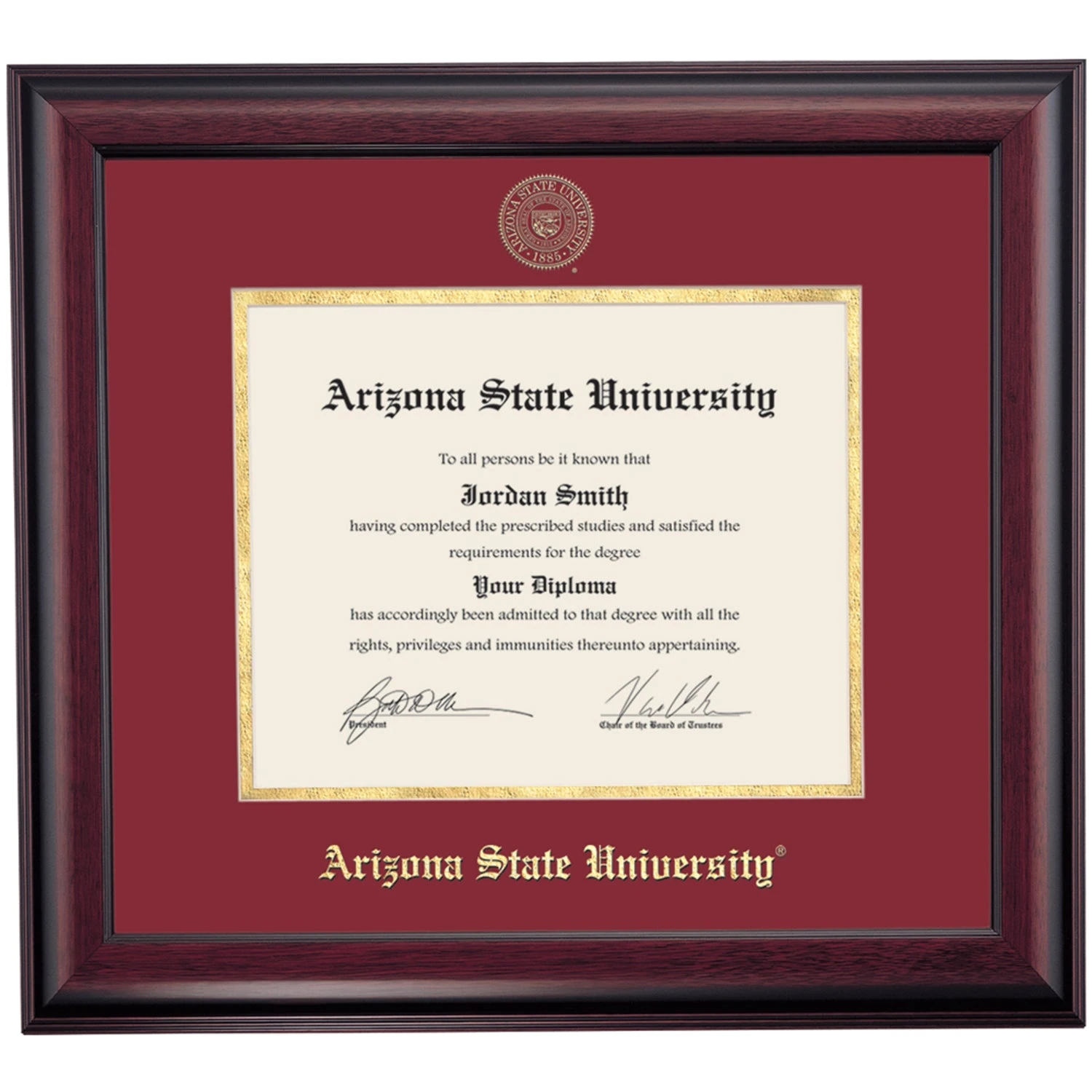 Celebrate your graduation in style with this handcrafted diploma frame. Custom crafted to fit your Arizona State University diploma, this frame is embossed with your school name and seal and features Maroon/Gold accent matting and high quality hardwood moulding.