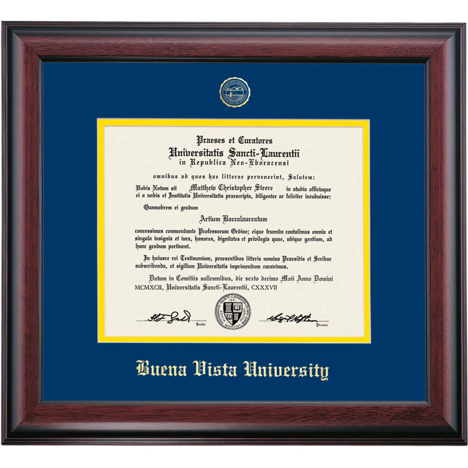 Celebrate your graduation in style with this handcrafted diploma frame. Custom crafted to fit your Buena Vista University diploma, this frame is embossed with your school name and seal and features Navy/Yellow accent matting and high quality hardwood moulding.