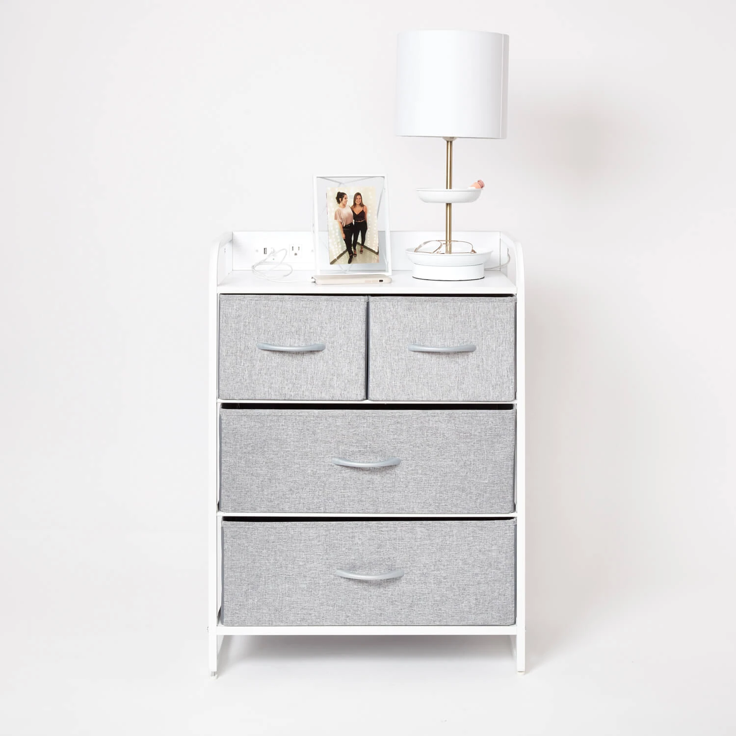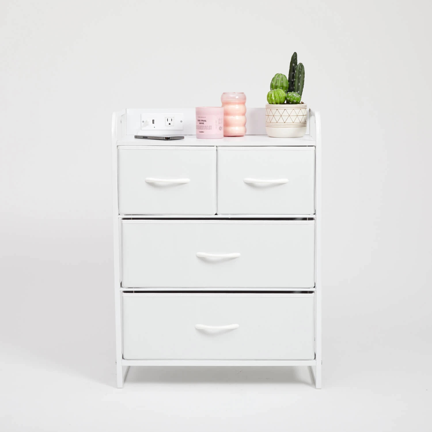 The Charging 4-Drawer Storage Unit makes a perfect oversized nightstand, provides extra storage, and features two USB ports and one outlet to charge all of your devices. Instructions and hardware are included for hassle-free and quick installation.