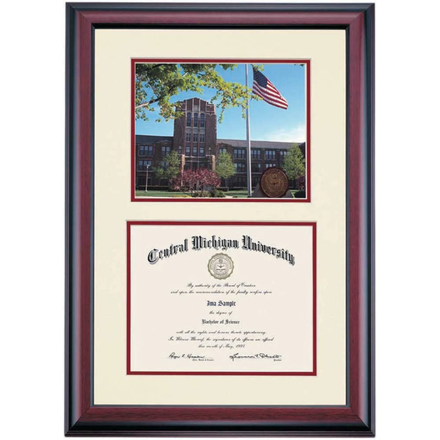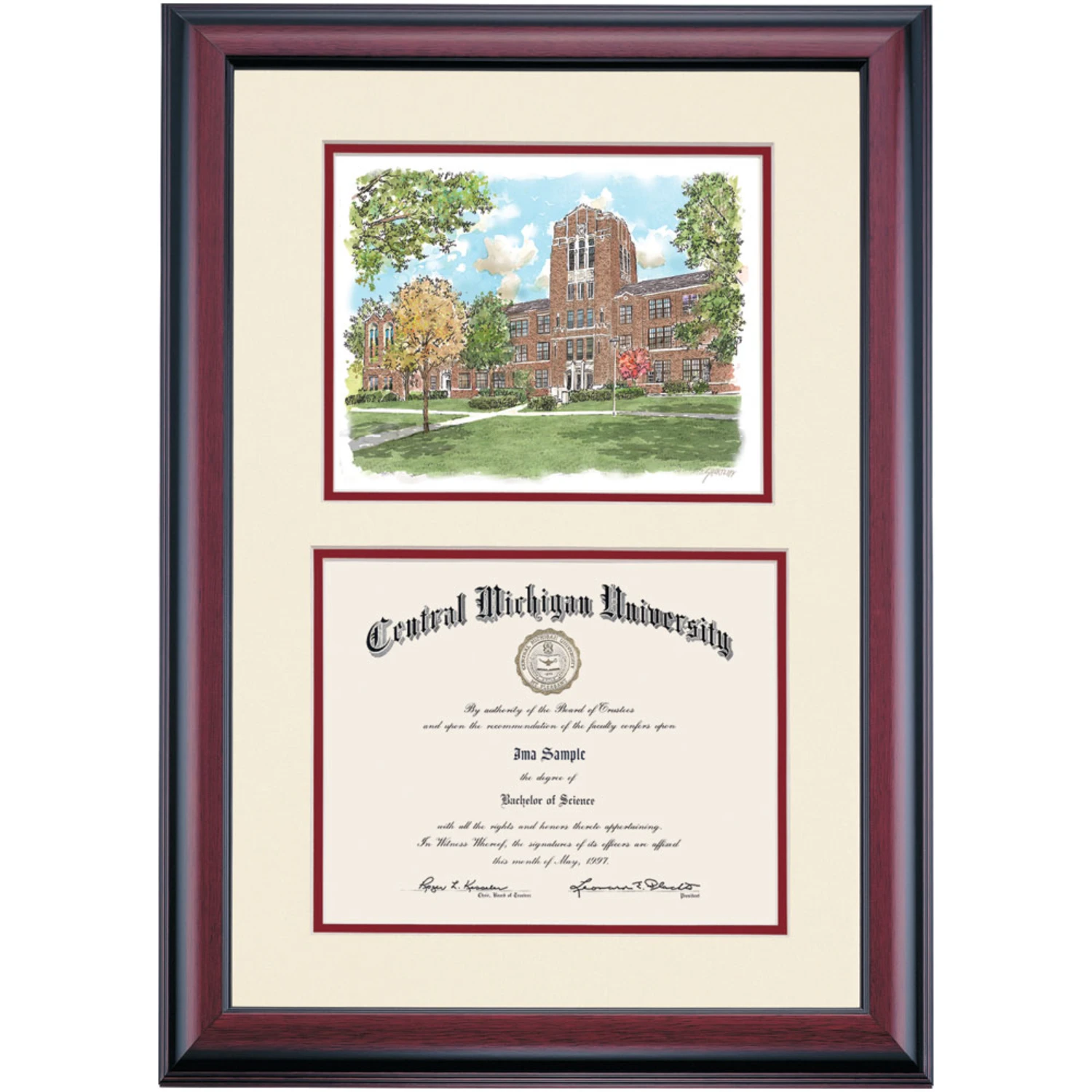 Celebrate your graduation in style with this handcrafted premier diploma frame which includes a Professional Print of Warriner Hall. Custom crafted to fit your Central Michigan University diploma, this frame features accent matting and high quality hardwood moulding.