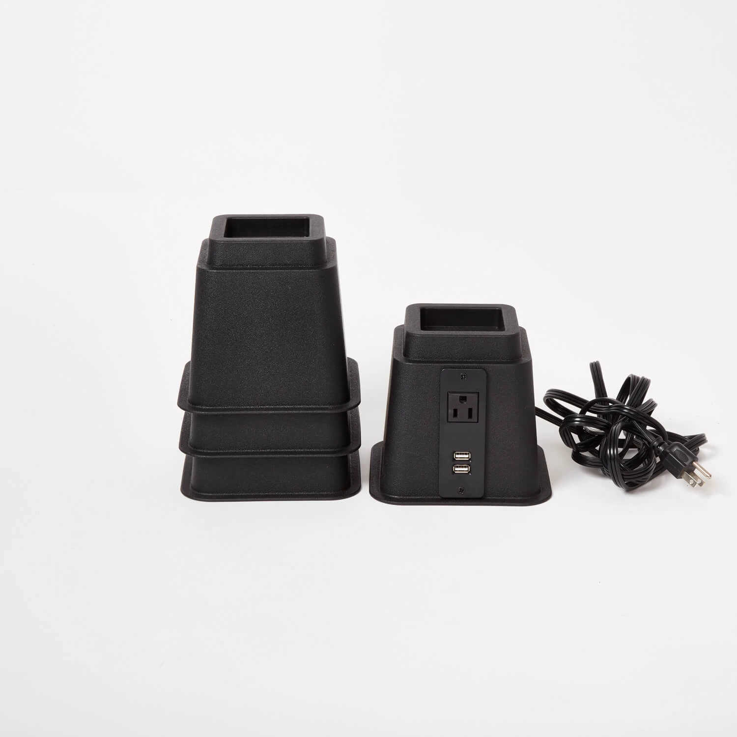 Provides a convenient outlet right next to your bed. Cover these with a Dormify bedskirt to keep all of your cords hidden away. Can support up to 300 lbs per riser. Made from plastic. Comes in a set of 4. Cord is 5ft long.