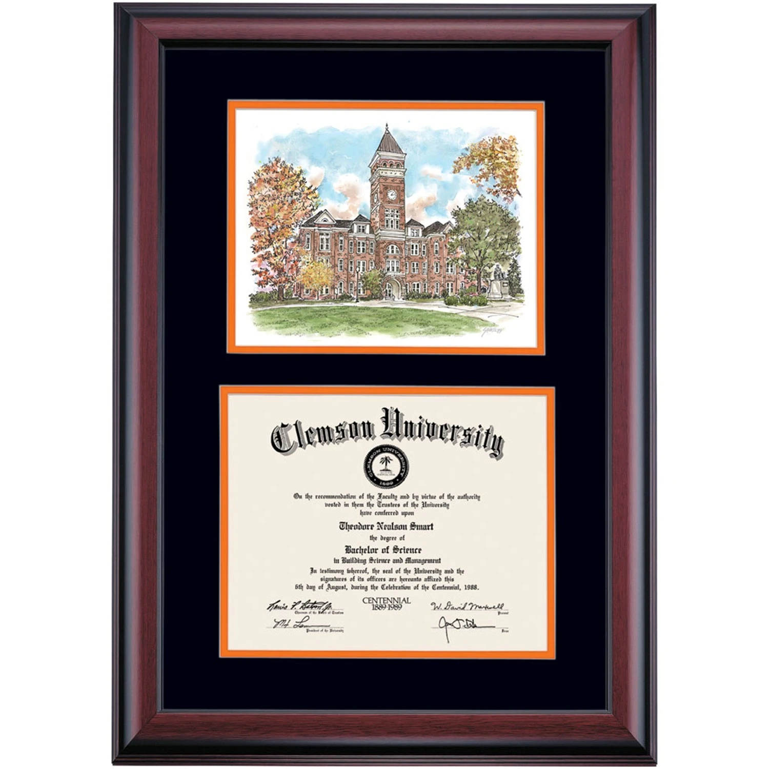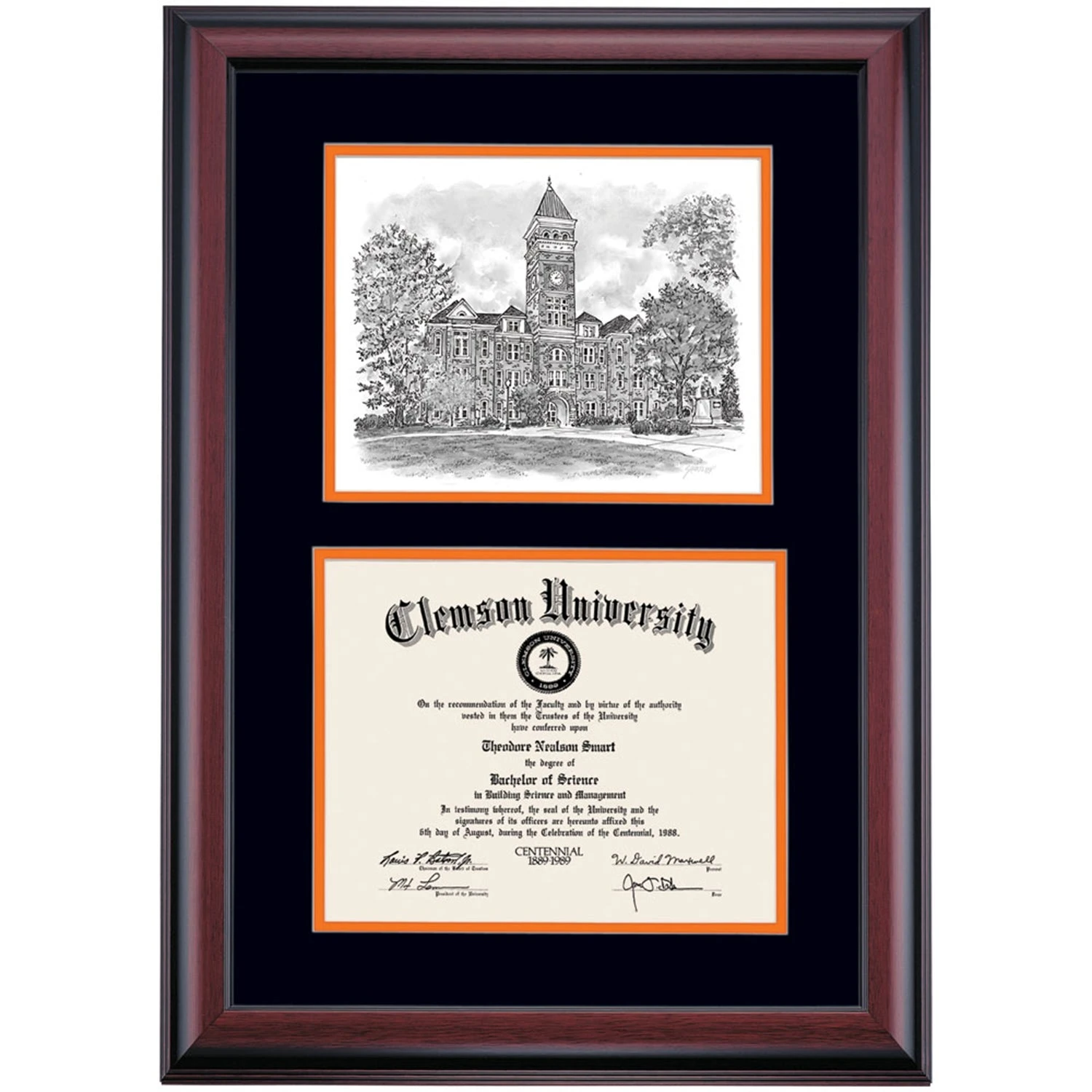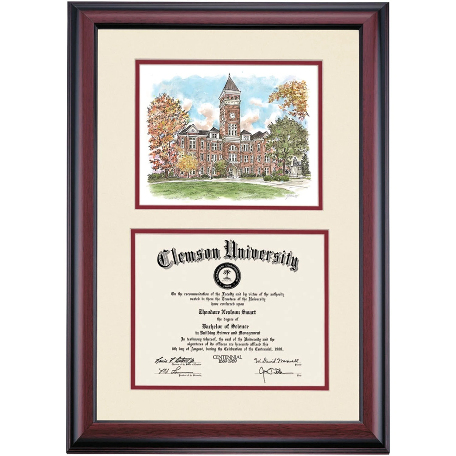 Celebrate your graduation in style with this handcrafted premier diploma frame which includes a Professional Print of Tillman Hall. Custom crafted to fit your Clemson University diploma, this frame features accent matting and high quality hardwood moulding.