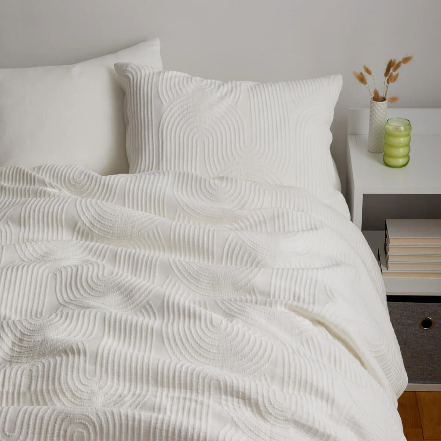 This boho vibe and easy to machine wash duvet cover and sham set is an effortless way to add texture to your bed. The top is made from 100% cotton and has arch detailing. The under side is 100% poly. Comes with 1 duvet cover and 1 standard sham set. Duvet insert sold separately.