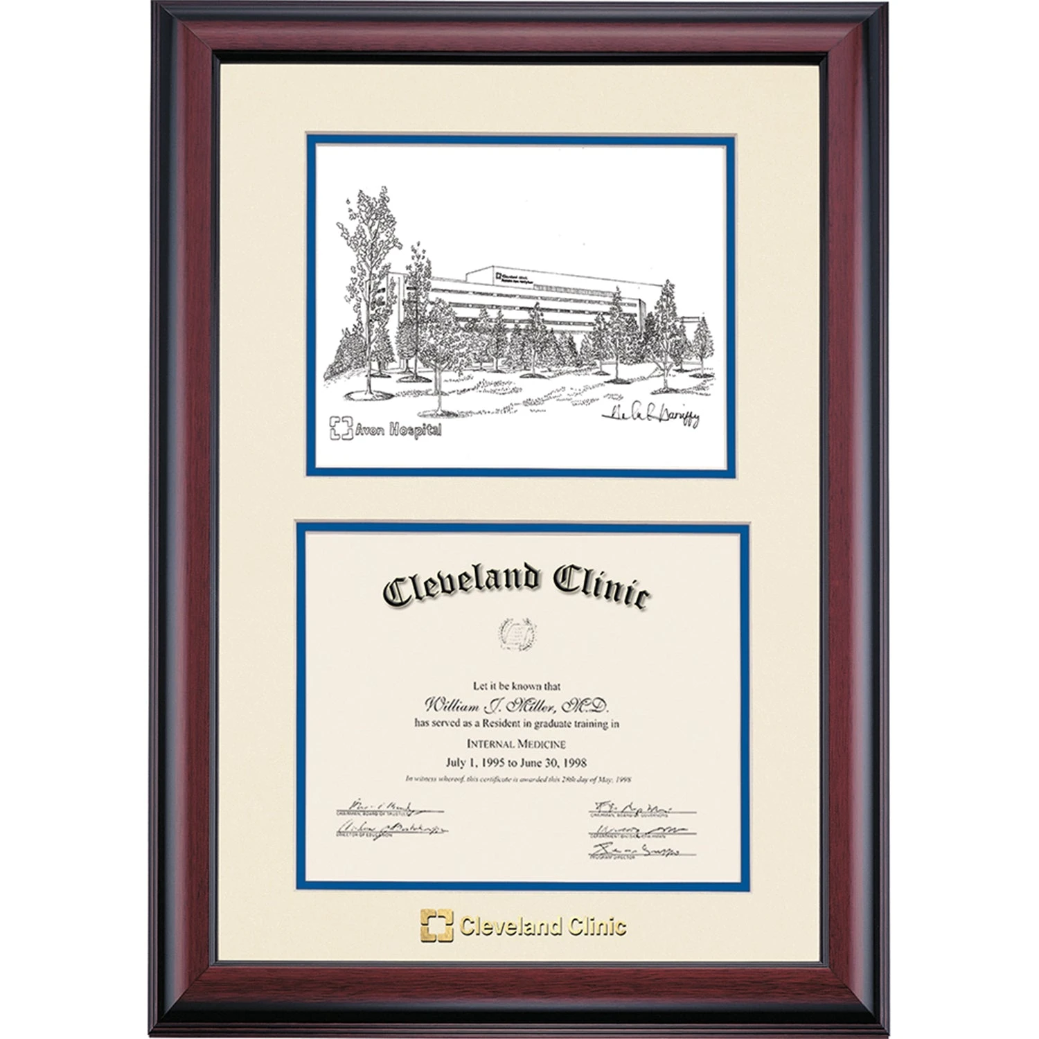 Celebrate your graduation in style with this handcrafted premier certificate frame, embossed with the school name and seal, which includes a Professional Pen & Ink Print of Cleveland Clinic Avon. Custom crafted to fit your Cleveland Clinic certificate, this frame features Ivory/Royal accent matting and high quality hardwood moulding.
