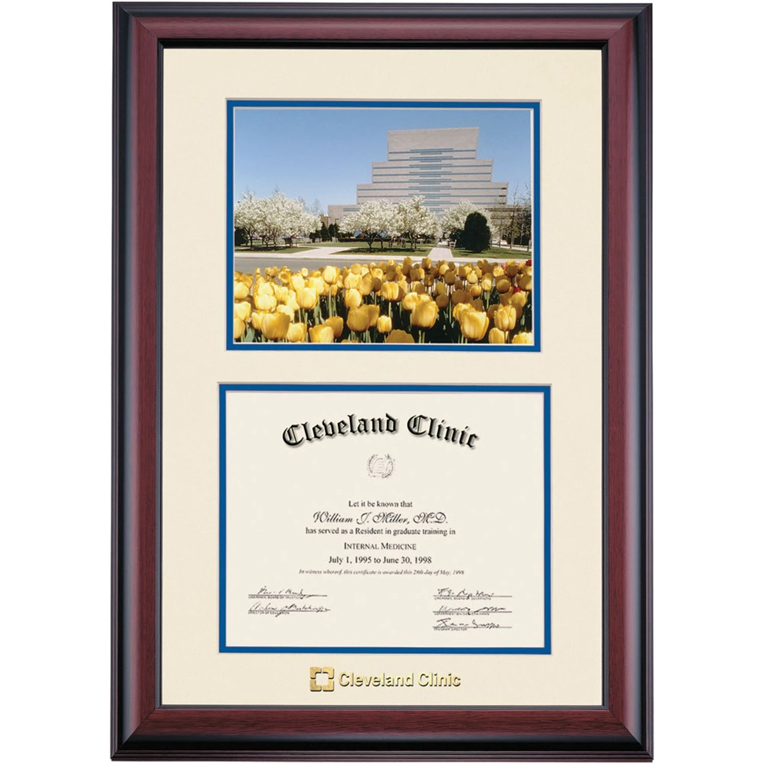 Celebrate your graduation in style with this handcrafted premier certificate frame, embossed with the school name and seal, which includes a Professional Photograph of the Crile Building. Custom crafted to fit your Cleveland Clinic certificate, this frame features Ivory/Royal accent matting and high quality hardwood moulding.