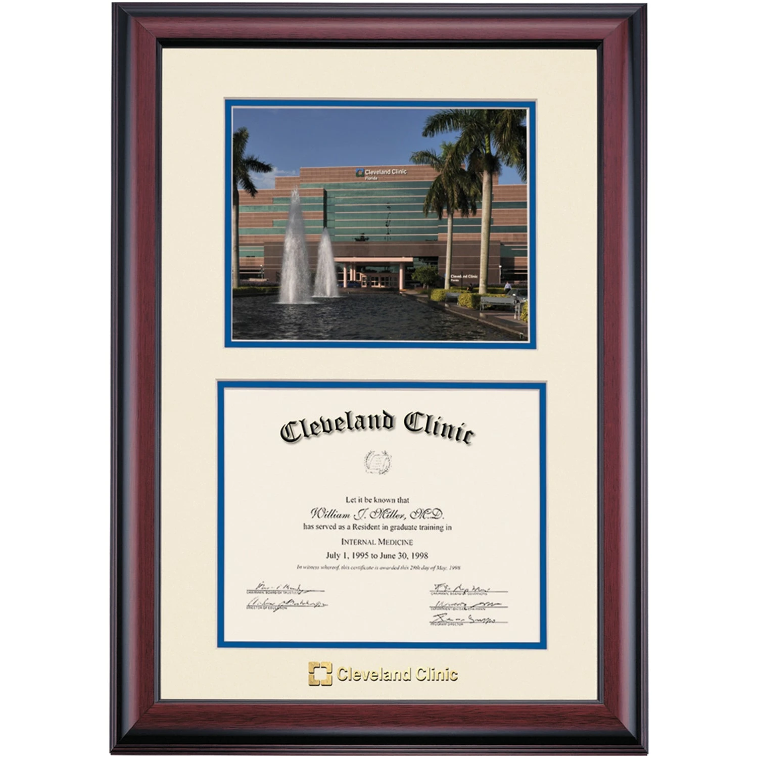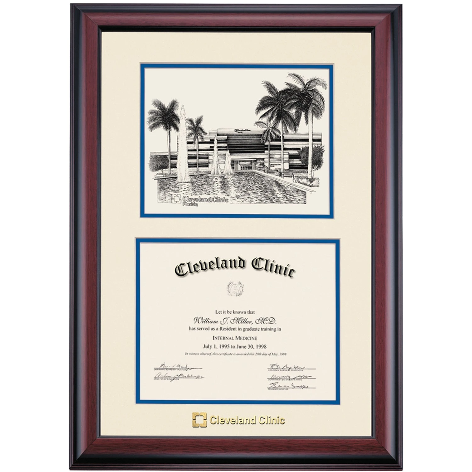 Celebrate your graduation in style with this handcrafted premier certificate frame, embossed with the school name and seal, which includes a Professional Print of Cleveland Clinic Florida. Custom crafted to fit your Cleveland Clinic certificate, this frame features accent matting and high quality hardwood moulding.