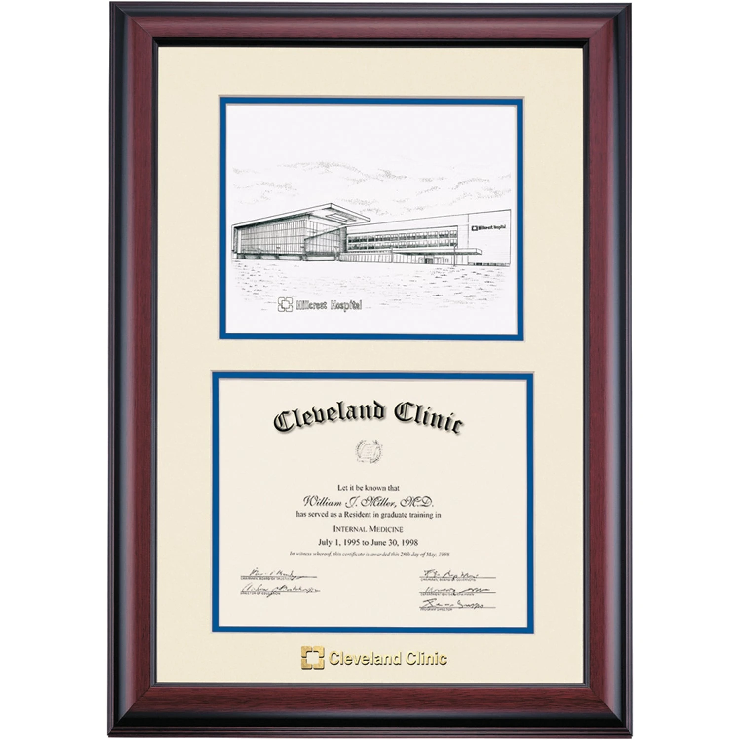 Celebrate your graduation in style with this handcrafted premier certificate frame, embossed with the school name and seal, which includes a Professional Pen & Ink Print of Cleveland Clinic Hillcrest. Custom crafted to fit your Cleveland Clinic certificate, this frame features Ivory/Royal accent matting and high quality hardwood moulding.