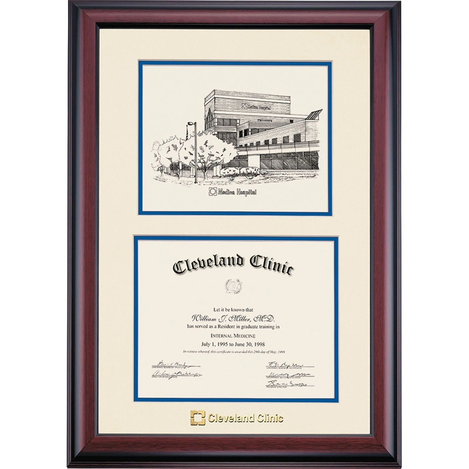 Celebrate your graduation in style with this handcrafted premier certificate frame, embossed with the school name and seal, which includes a Professional Pen & Ink Print of Cleveland Clinic Medina. Custom crafted to fit your Cleveland Clinic certificate, this frame features Ivory/Royal accent matting and high quality hardwood moulding.