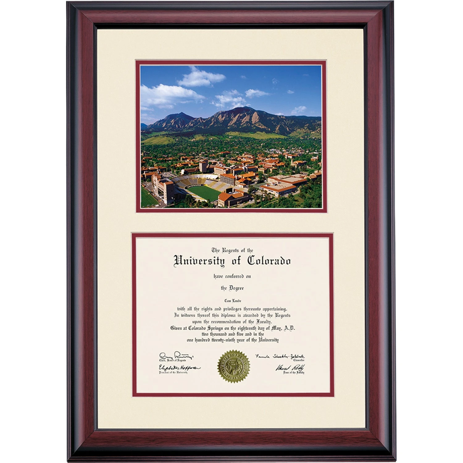 Celebrate your graduation in style with this handcrafted premier diploma frame which includes a Professional Campus Aerial View Photograph. Custom crafted to fit your University of Colorado diploma, this frame features accent matting and high quality hardwood moulding.