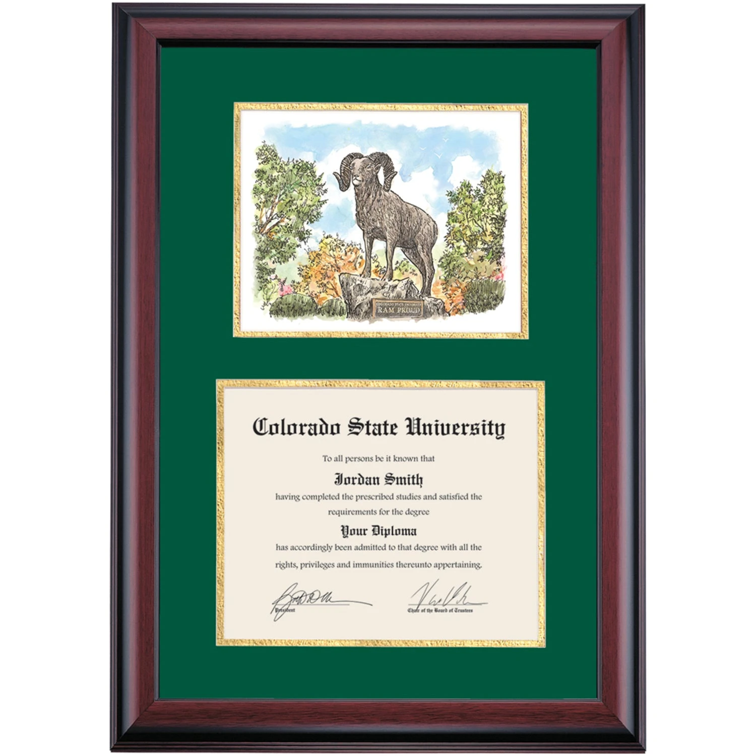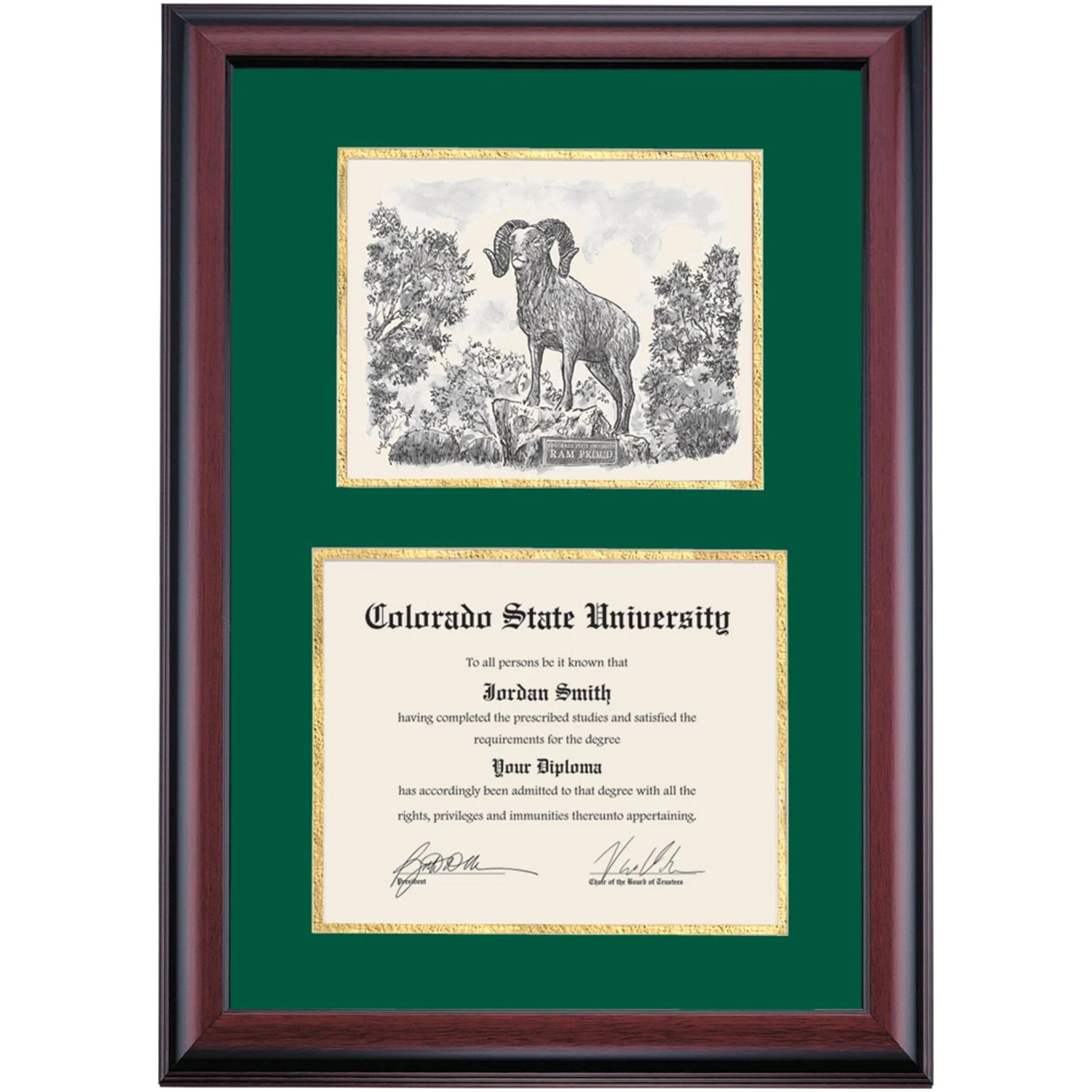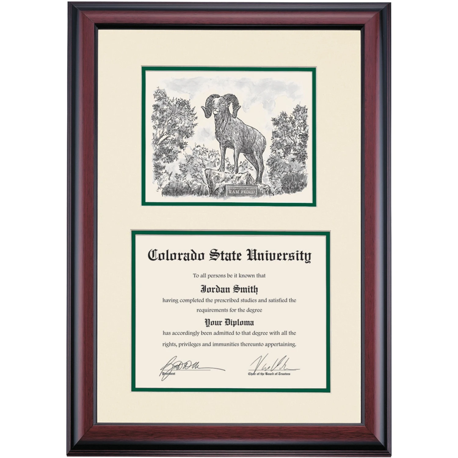 Celebrate your graduation in style with this handcrafted premier diploma frame which includes a Professional Print of the Ram Sculpture. Custom crafted to fit your Colorado State University diploma, this frame features accent matting and high quality hardwood moulding.