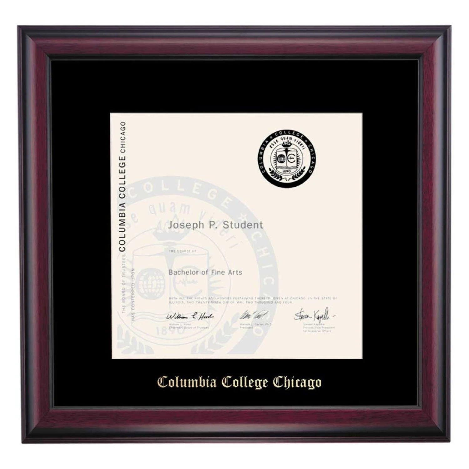 Celebrate your graduation in style with this handcrafted diploma frame. Custom crafted to fit your Columbia College Chicago diploma, this frame is embossed with your school name and features Black accent matting and high quality hardwood moulding.