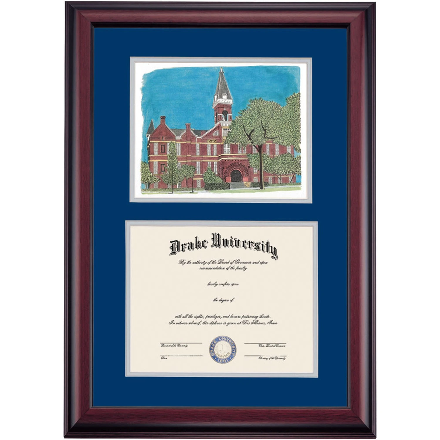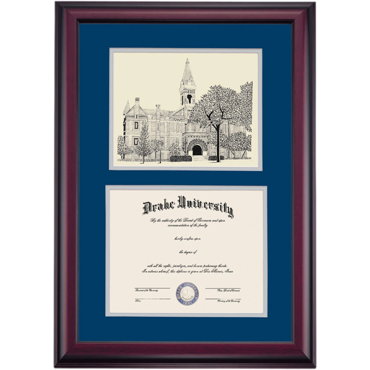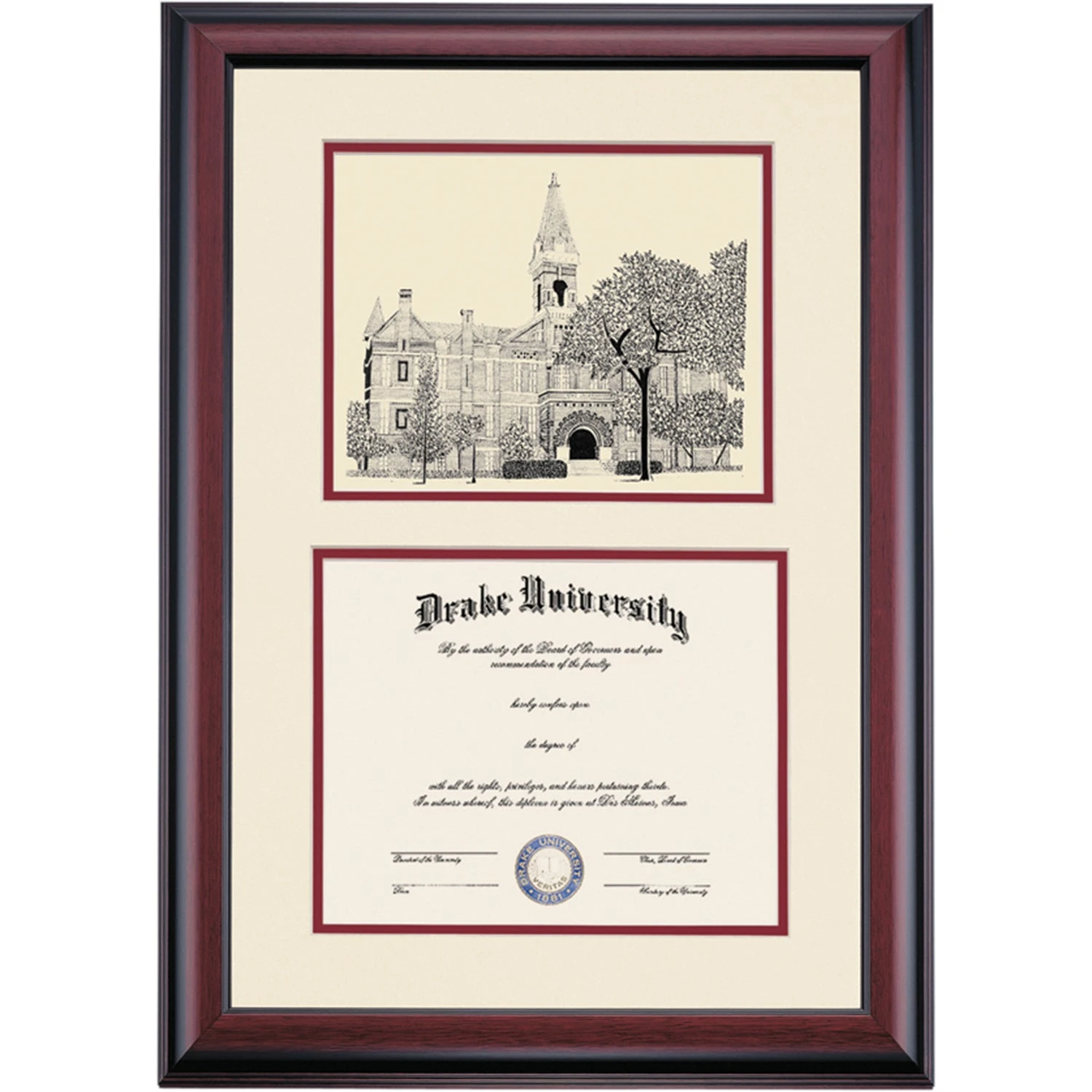 Celebrate your graduation in style with this handcrafted premier diploma frame which includes a Professional Print of Old Main. Custom crafted to fit your Drake University diploma, this frame features accent matting and high quality hardwood moulding.