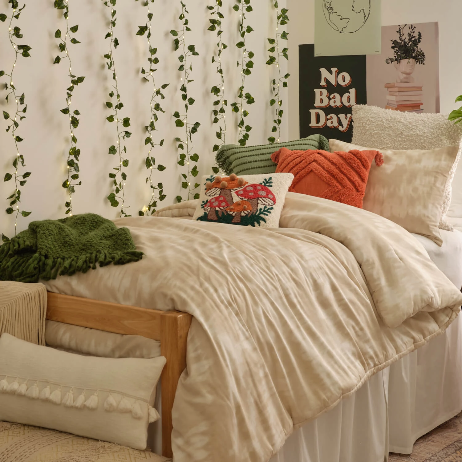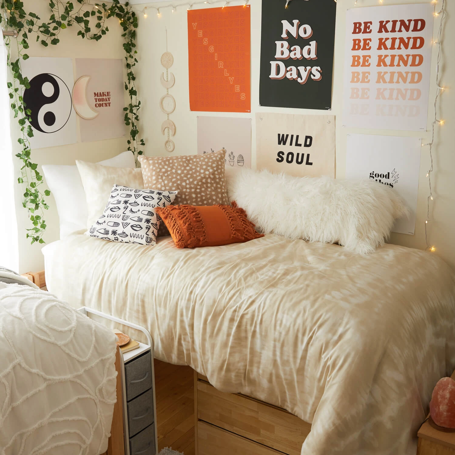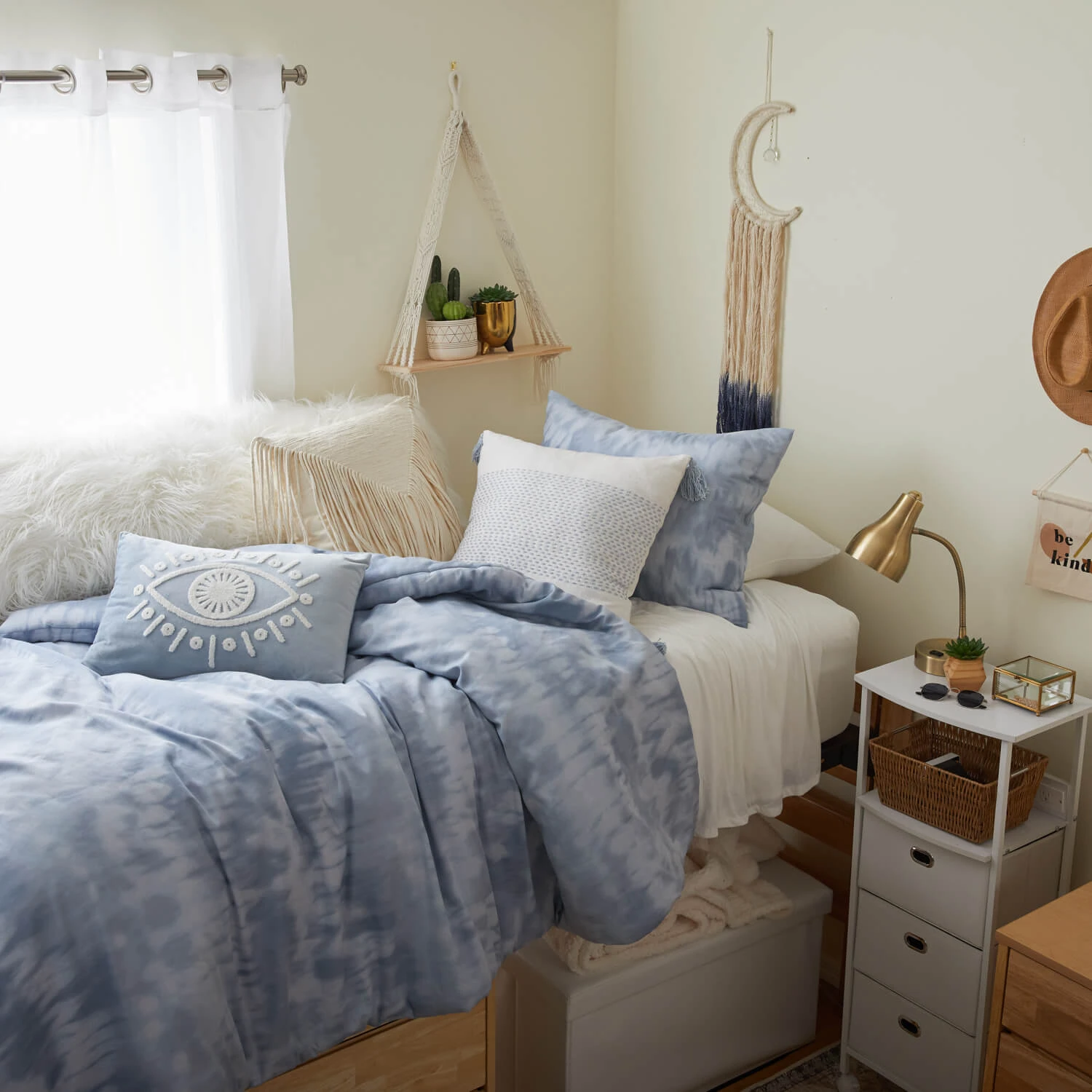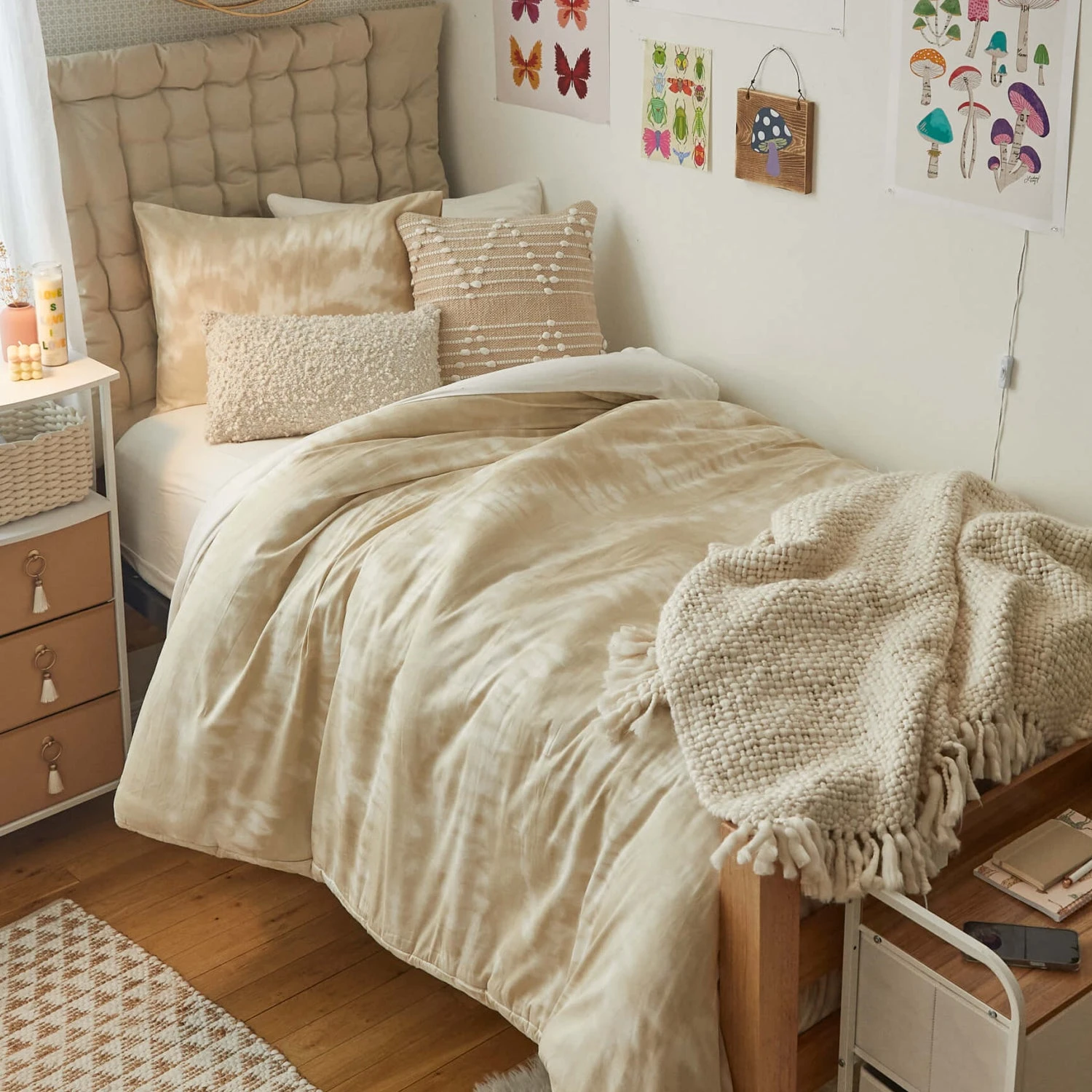 A dorm essential, The Dreamy Shibori Comforter and Sham set will make you want to stay in bed all day long. This luxuriously filled Shibori Comforter and Sham Set makes a serious case for hiding under the covers all afternoon. Your lazy weekends begin (and end) with this soothing neutral tie-dye dorm bedding.