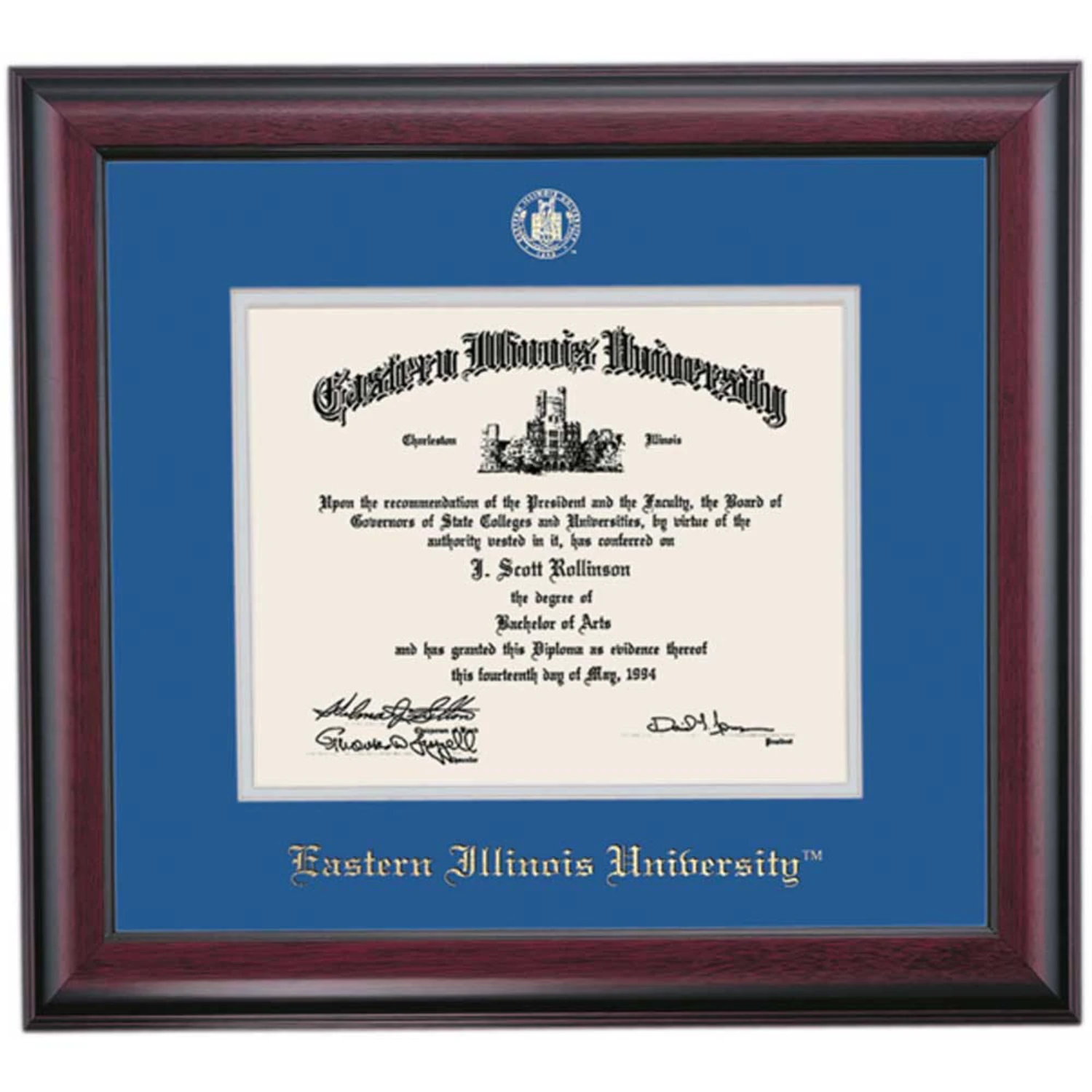 Celebrate your graduation in style with this handcrafted diploma frame. Custom crafted to fit your Eastern Illinois University diploma, this frame is embossed with your school name and seal and features Royal/Grey accent matting and high quality hardwood moulding.