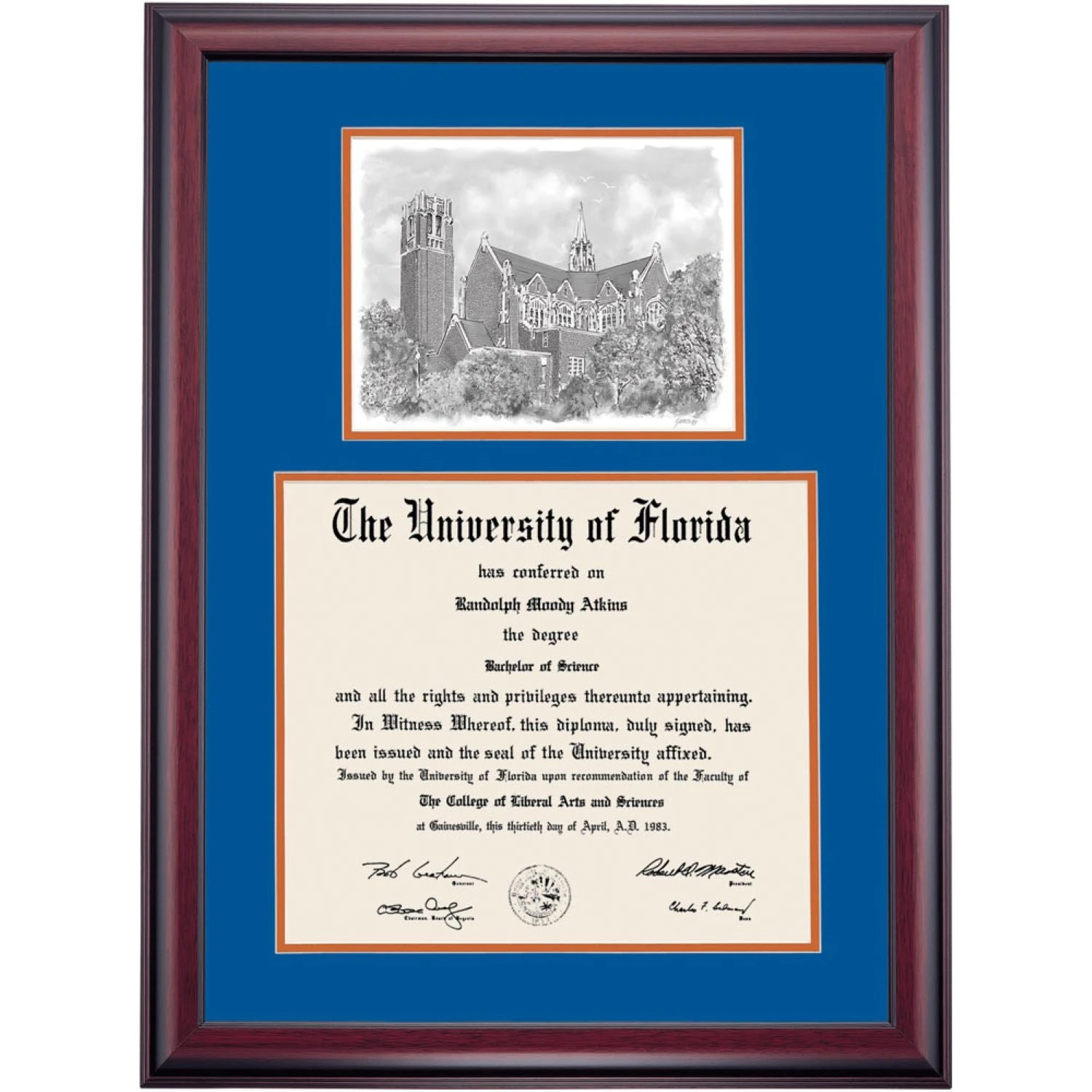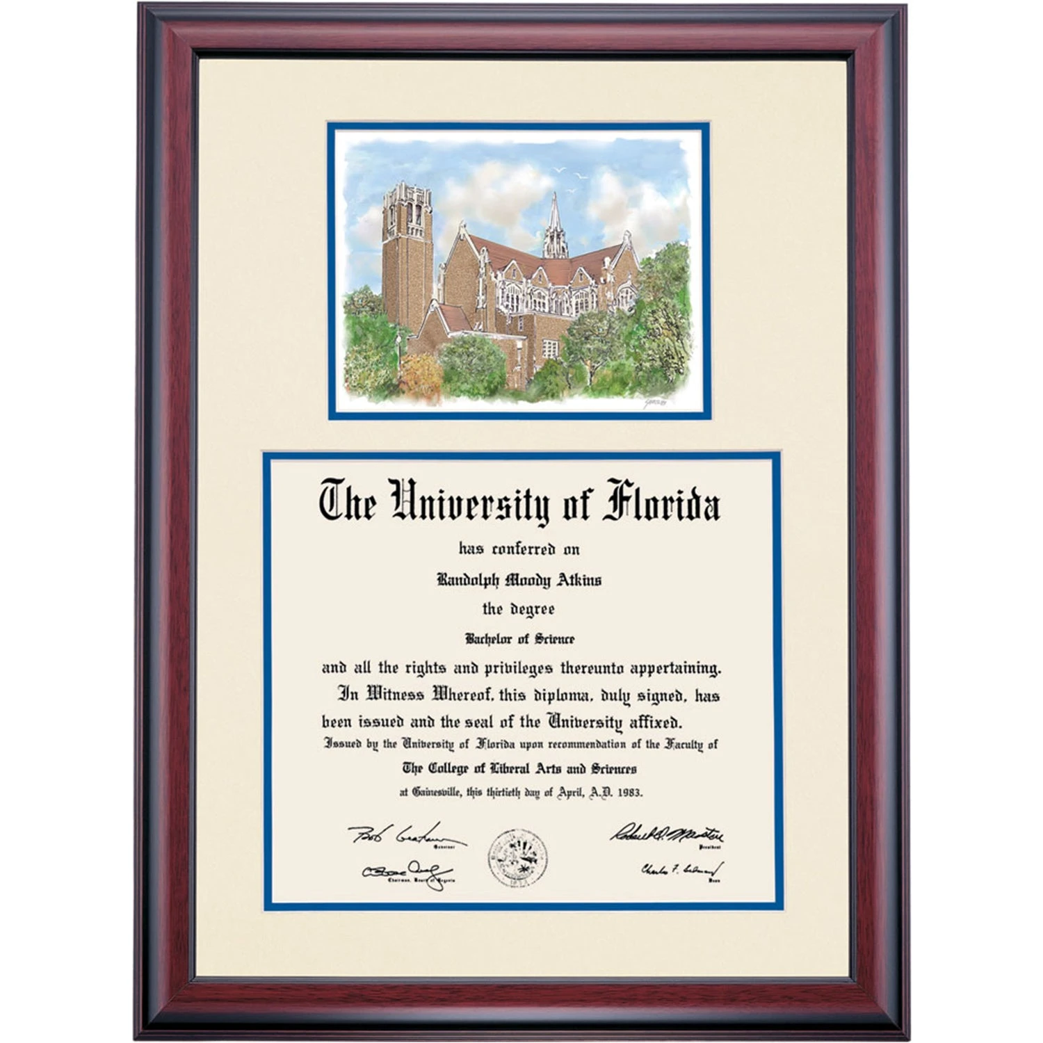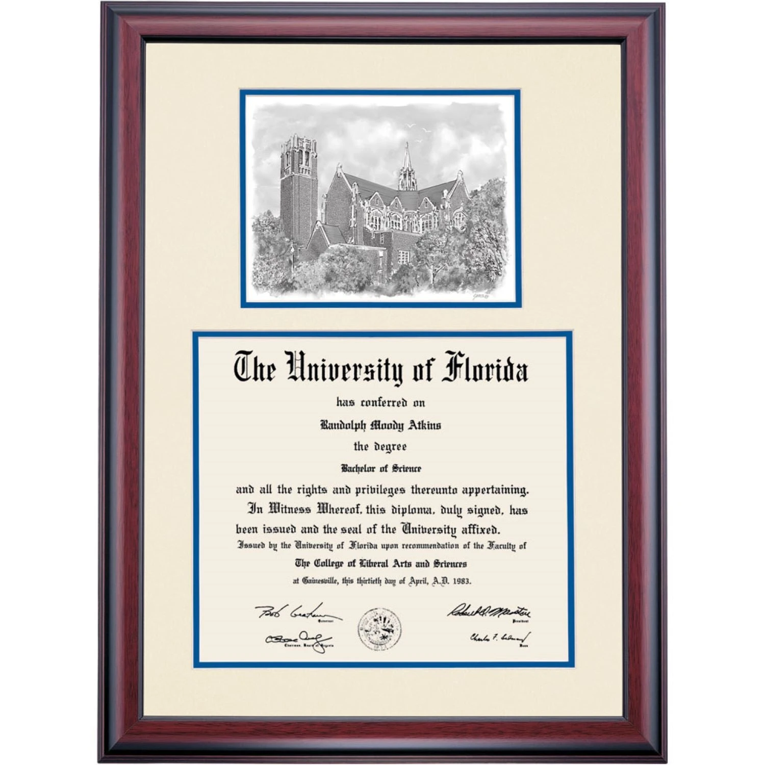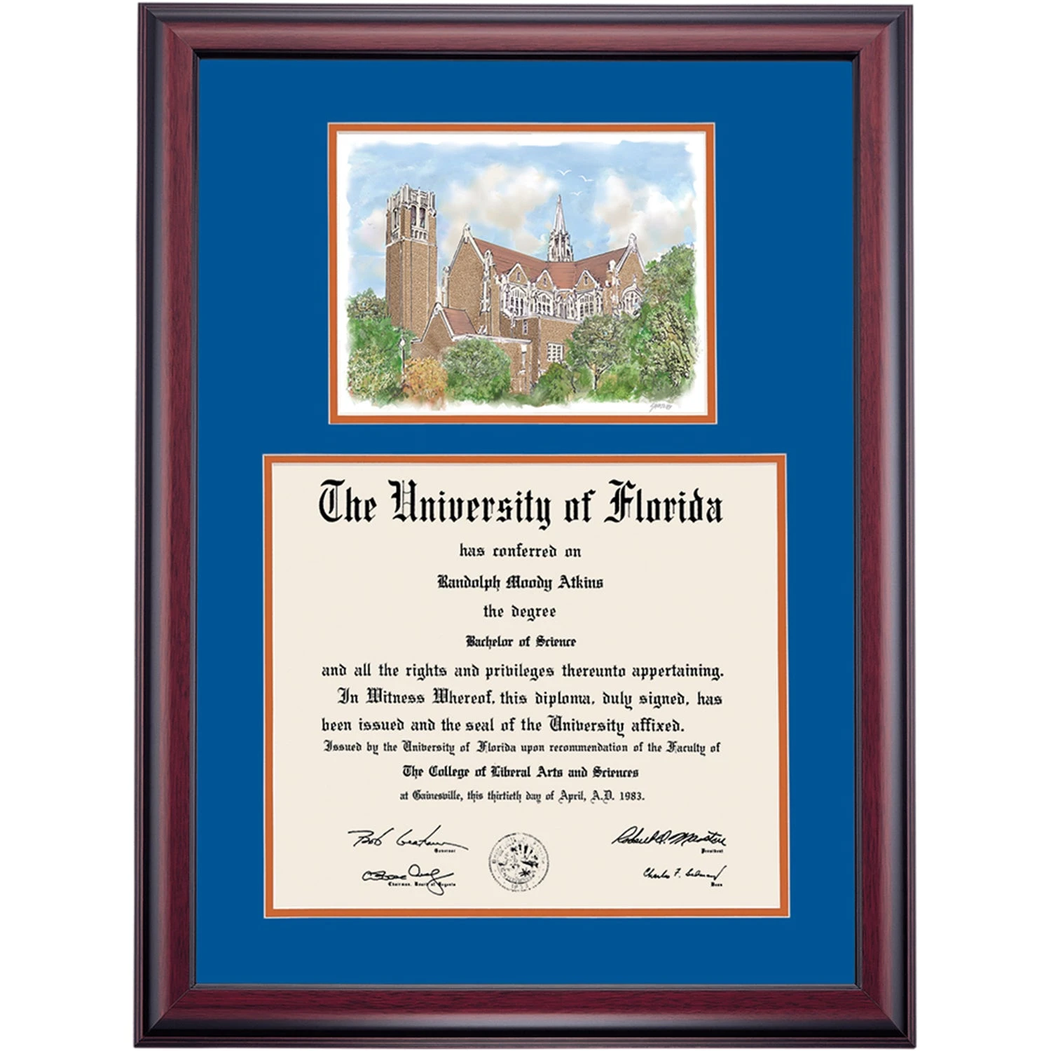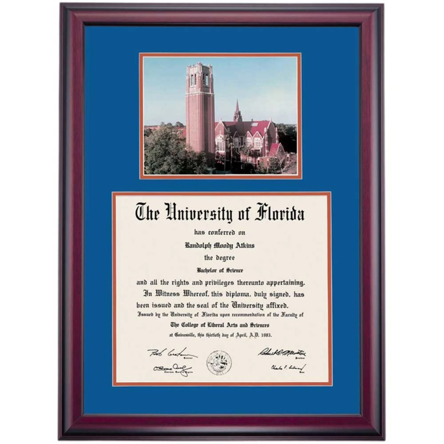 Celebrate your graduation in style with this handcrafted premier diploma frame which includes a Professional Print of the Century Tower. Custom crafted to fit your University of Florida diploma, this frame features accent matting and high quality hardwood moulding.