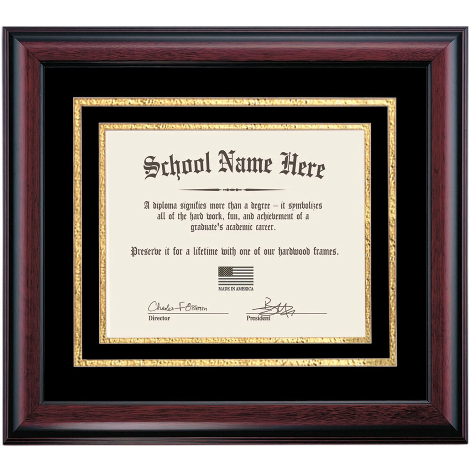 Celebrate your graduation in style with this handcrafted diploma frame. Custom crafted to fit your 8.5 x 11 horizontal diploma, this frame features Black and Gold accent matting and high quality hardwood moulding.