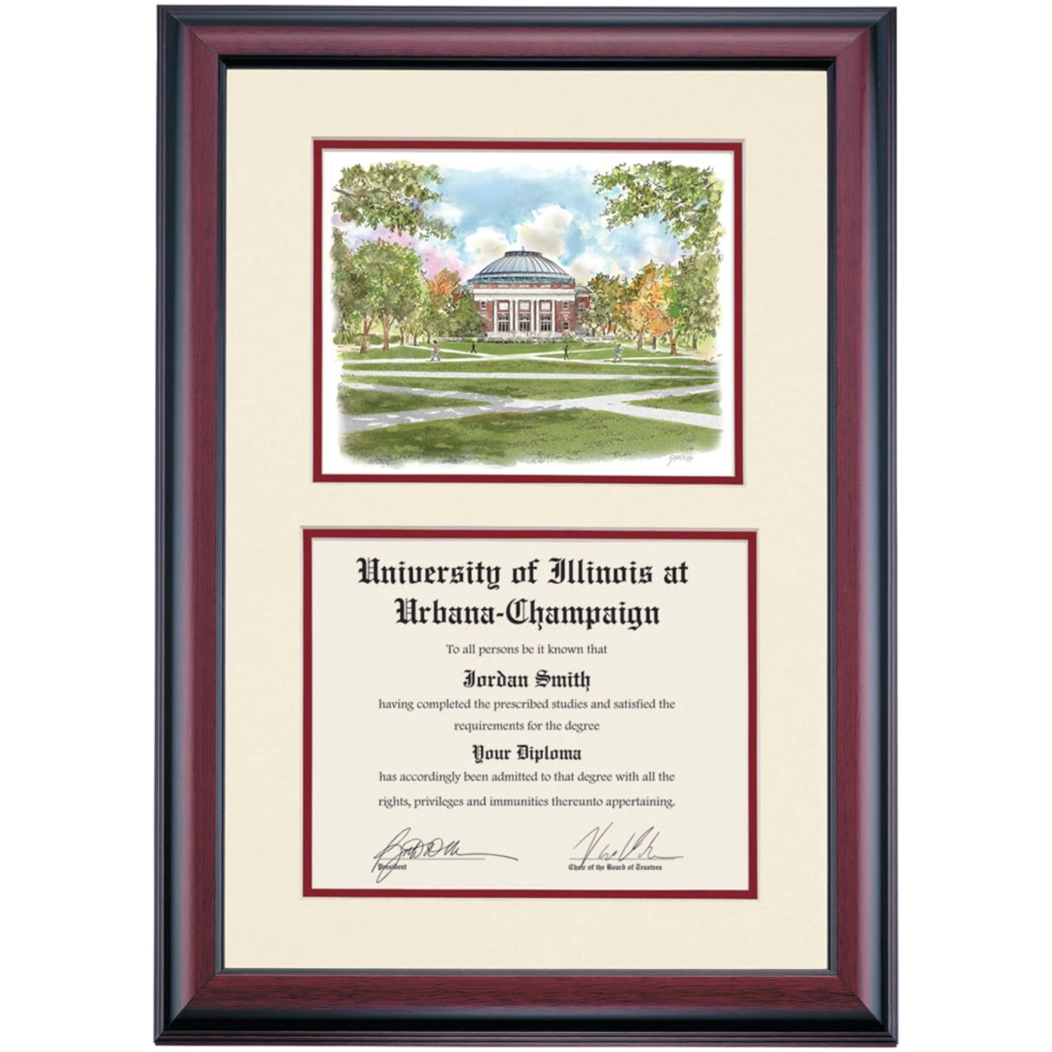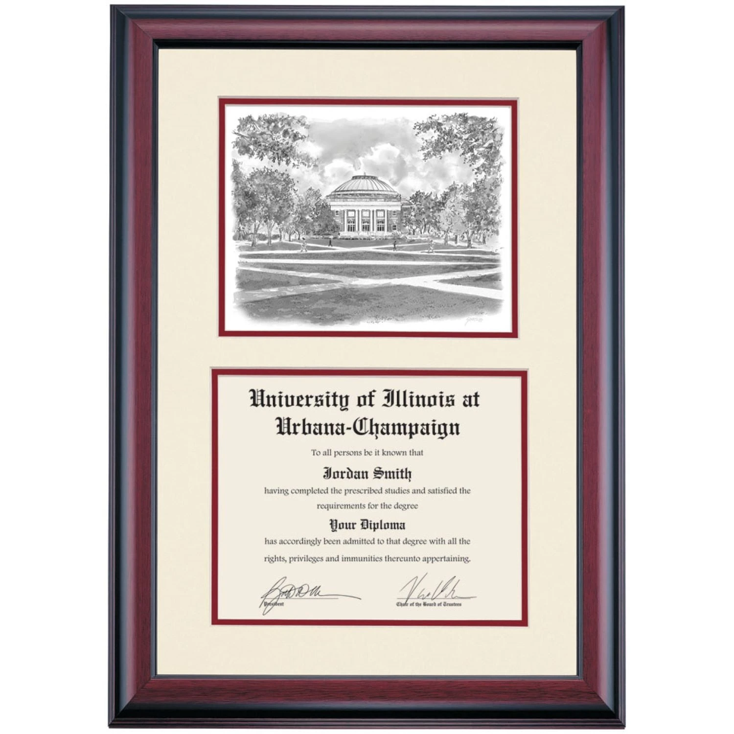 Celebrate your graduation in style with this handcrafted premier diploma frame which includes a Professional Print of an Aerial View of the Quad. Custom crafted to fit your University of Illinois at Urbana-Champaign diploma, this frame features accent matting and high quality hardwood moulding.