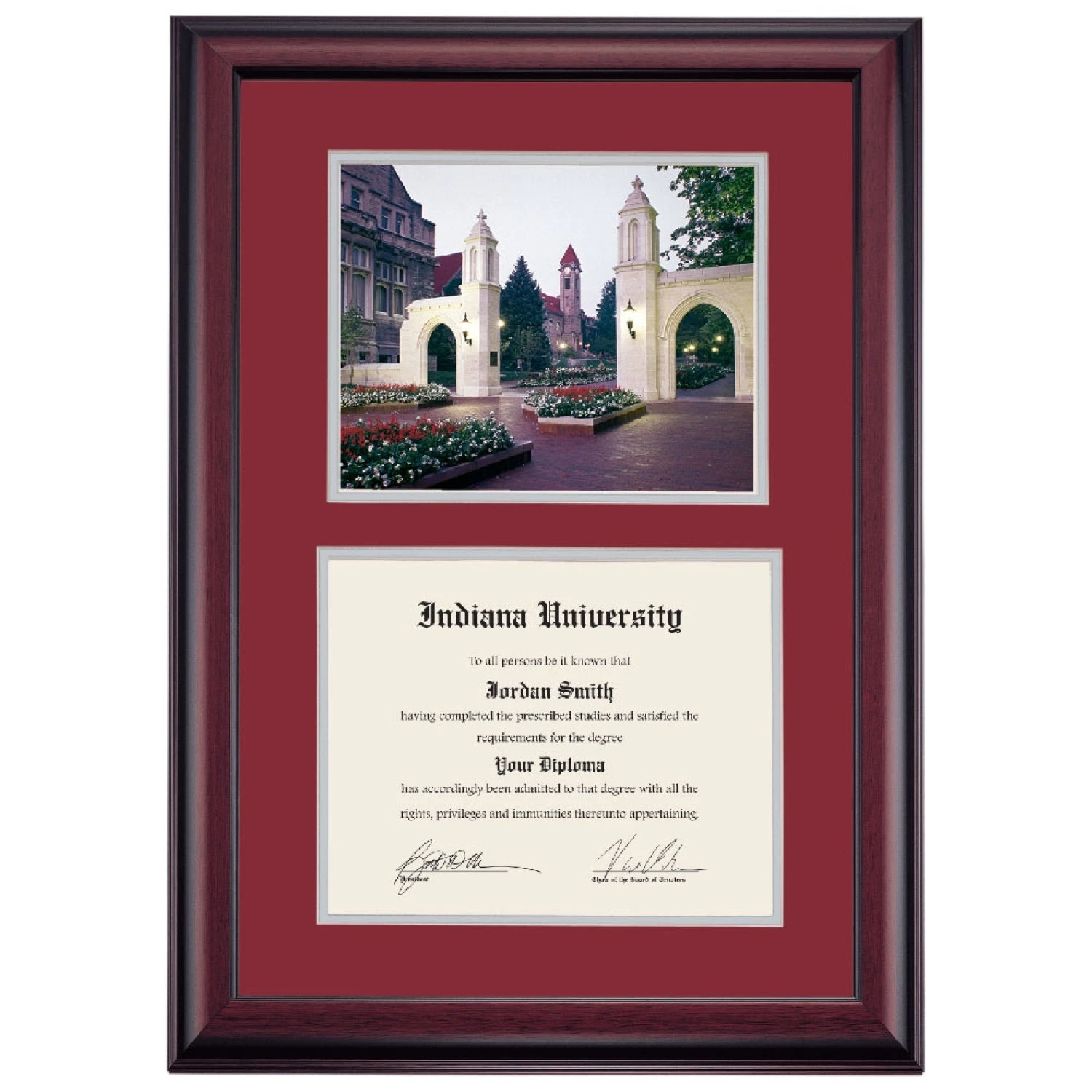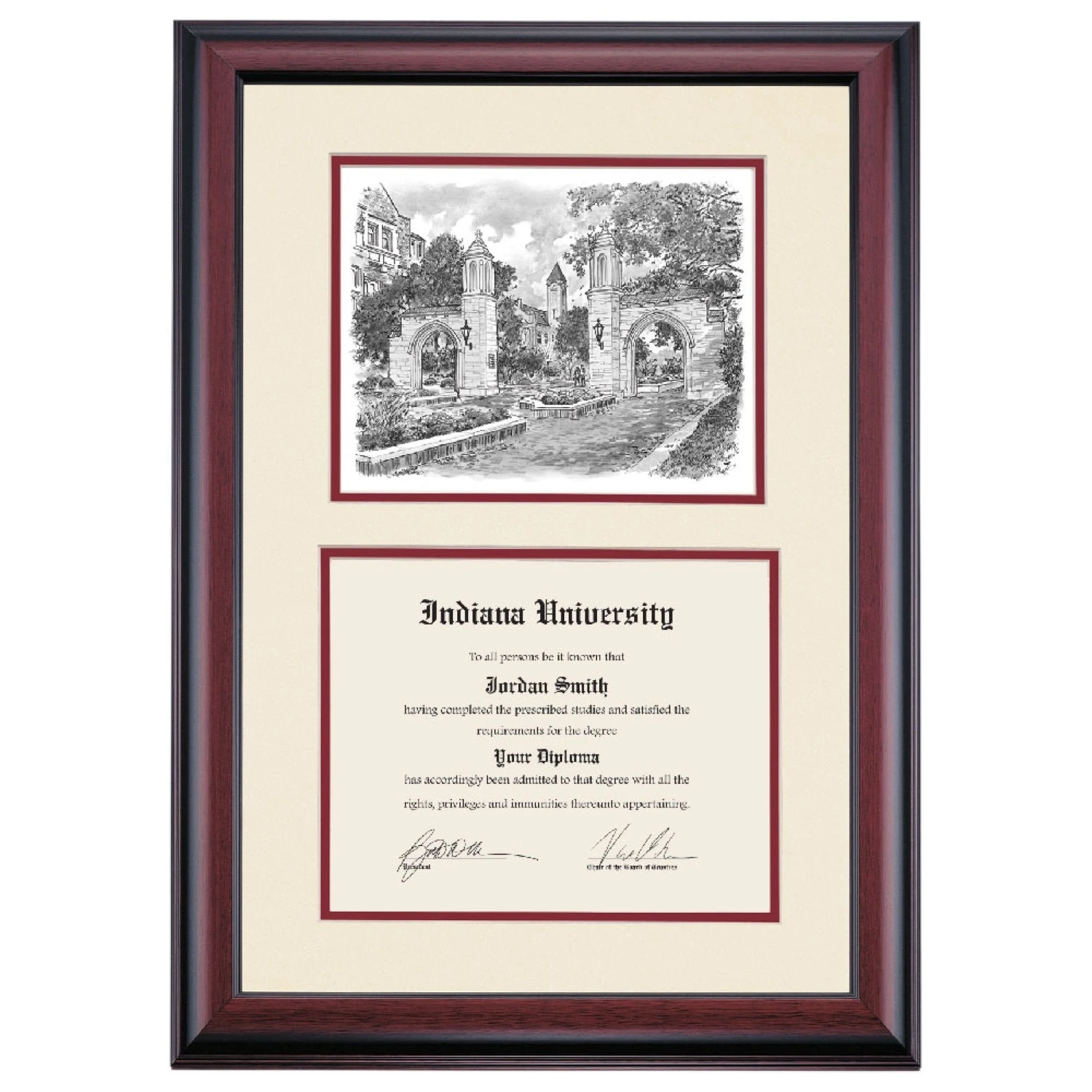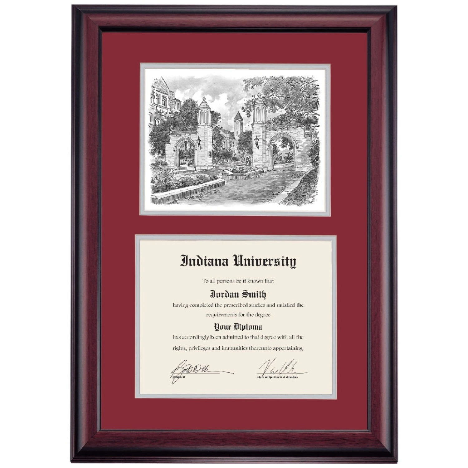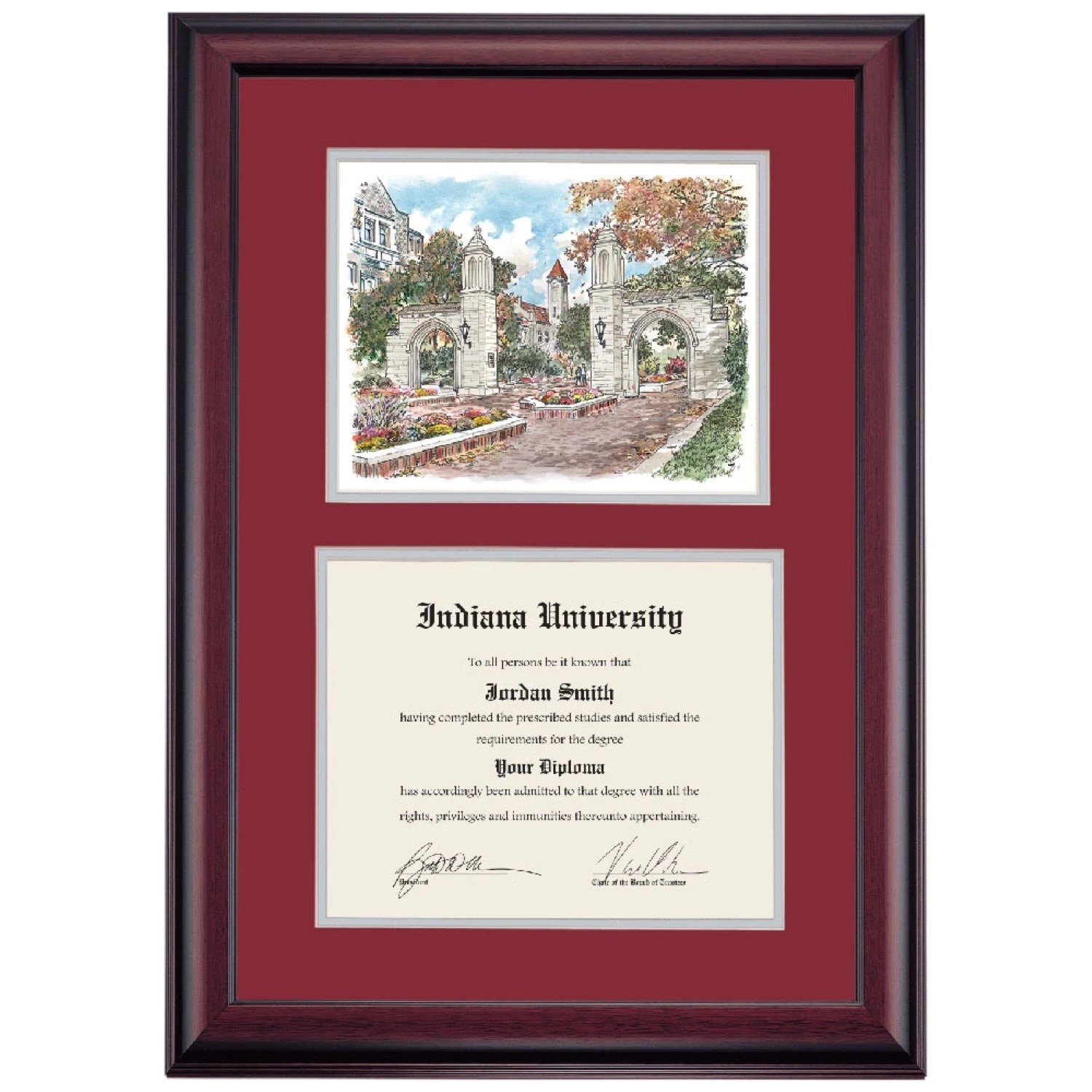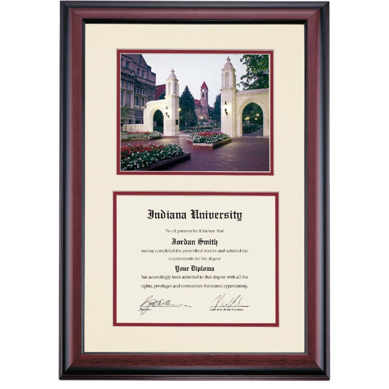 Celebrate your graduation in style with this handcrafted premier diploma frame which includes a Professional Print of the Sample Gates. Custom crafted to fit your Indiana University diploma, this frame features accent matting and high quality hardwood moulding.