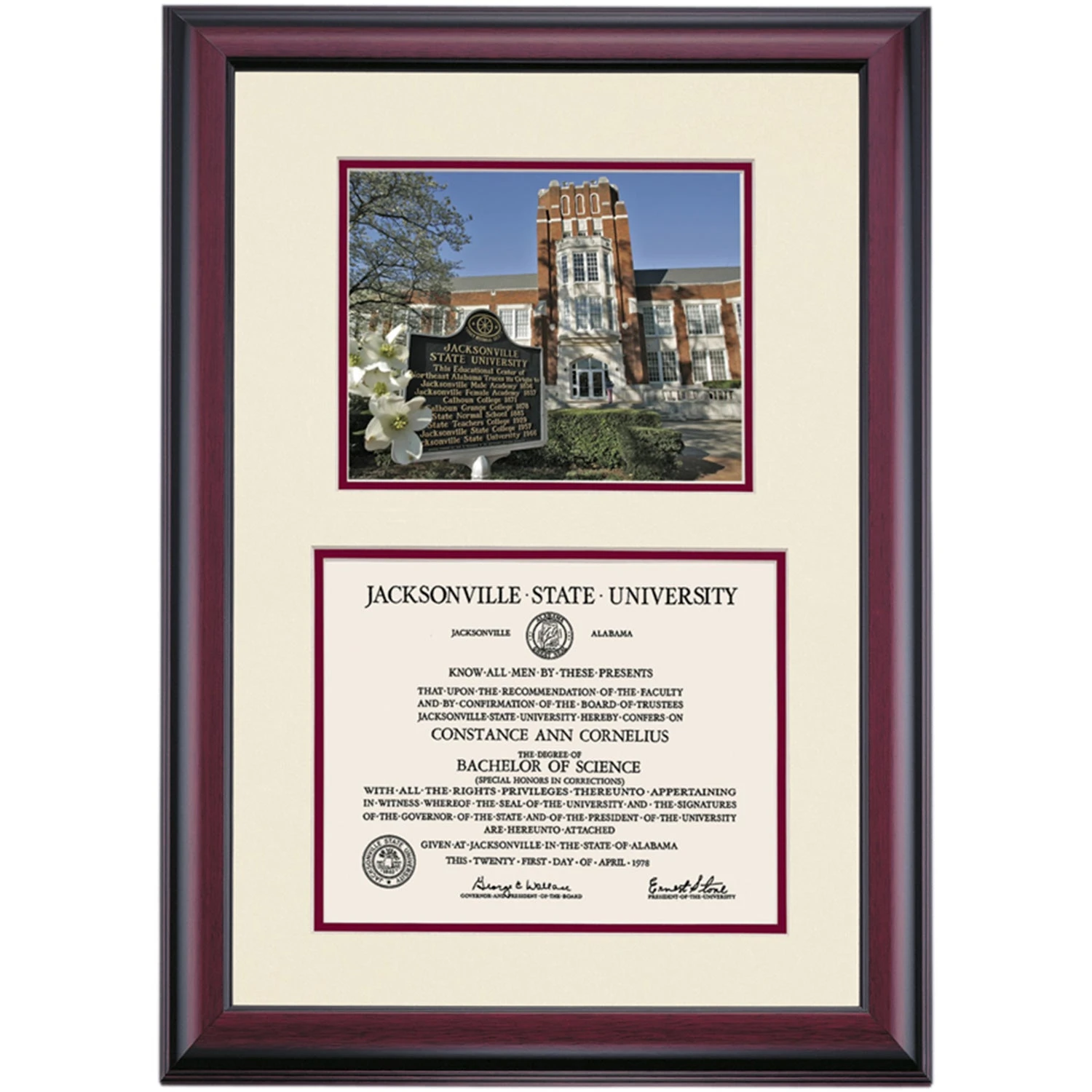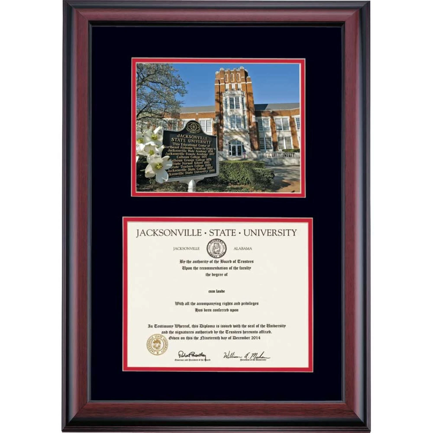Celebrate your graduation in style with this handcrafted premier diploma frame which includes a Professional Photograph of Angle Hall. Custom crafted to fit your Jacksonville State University diploma, this frame features accent matting and high quality hardwood moulding.