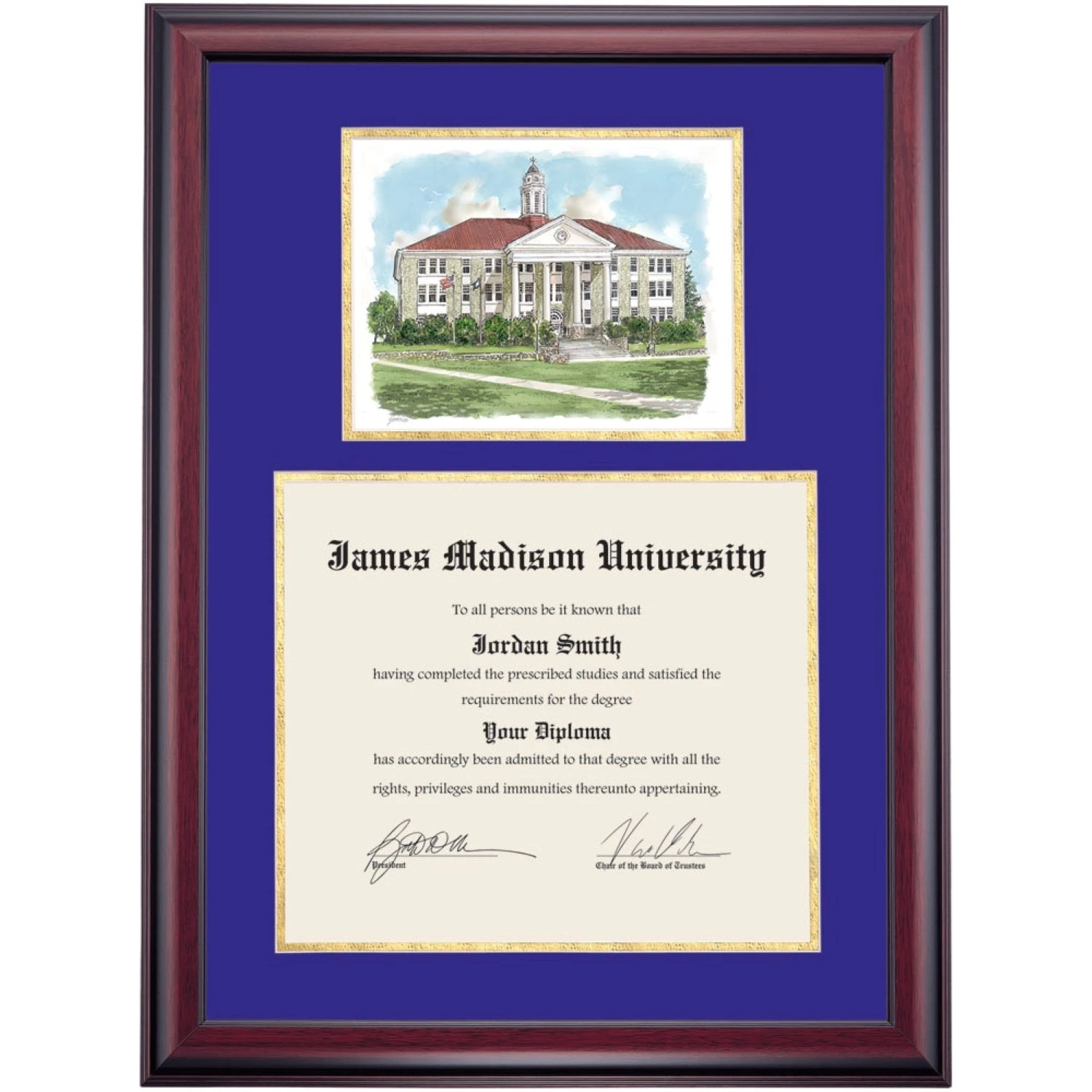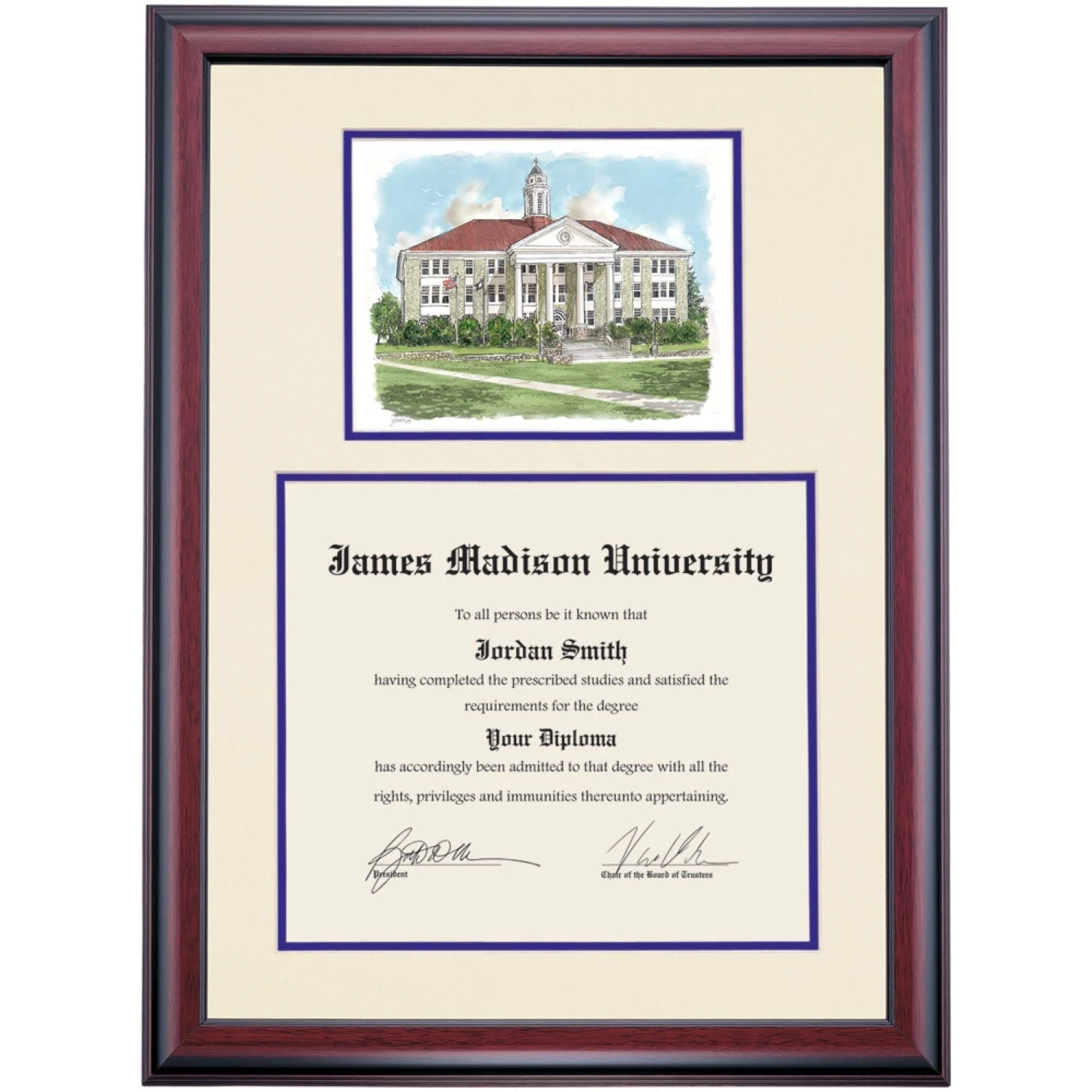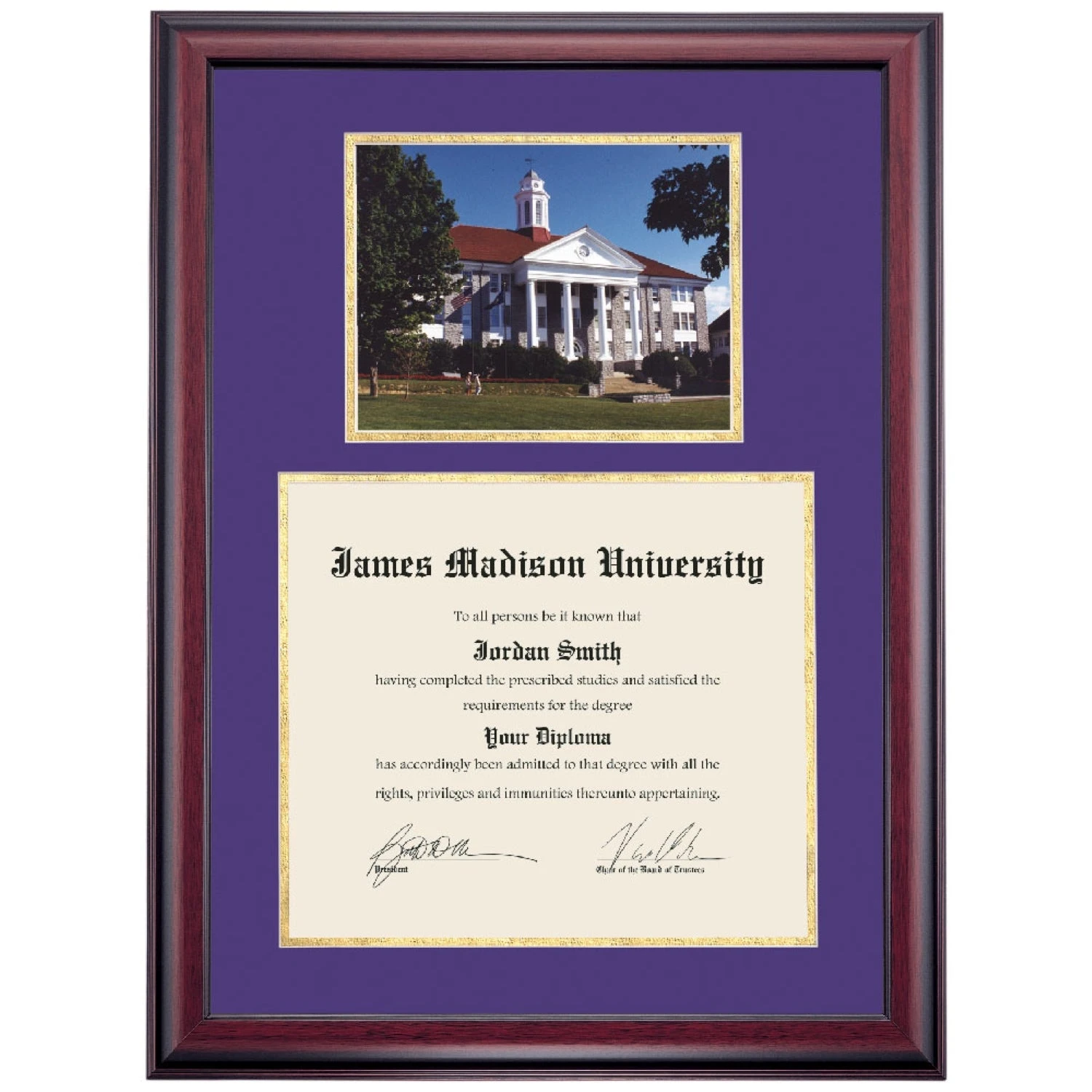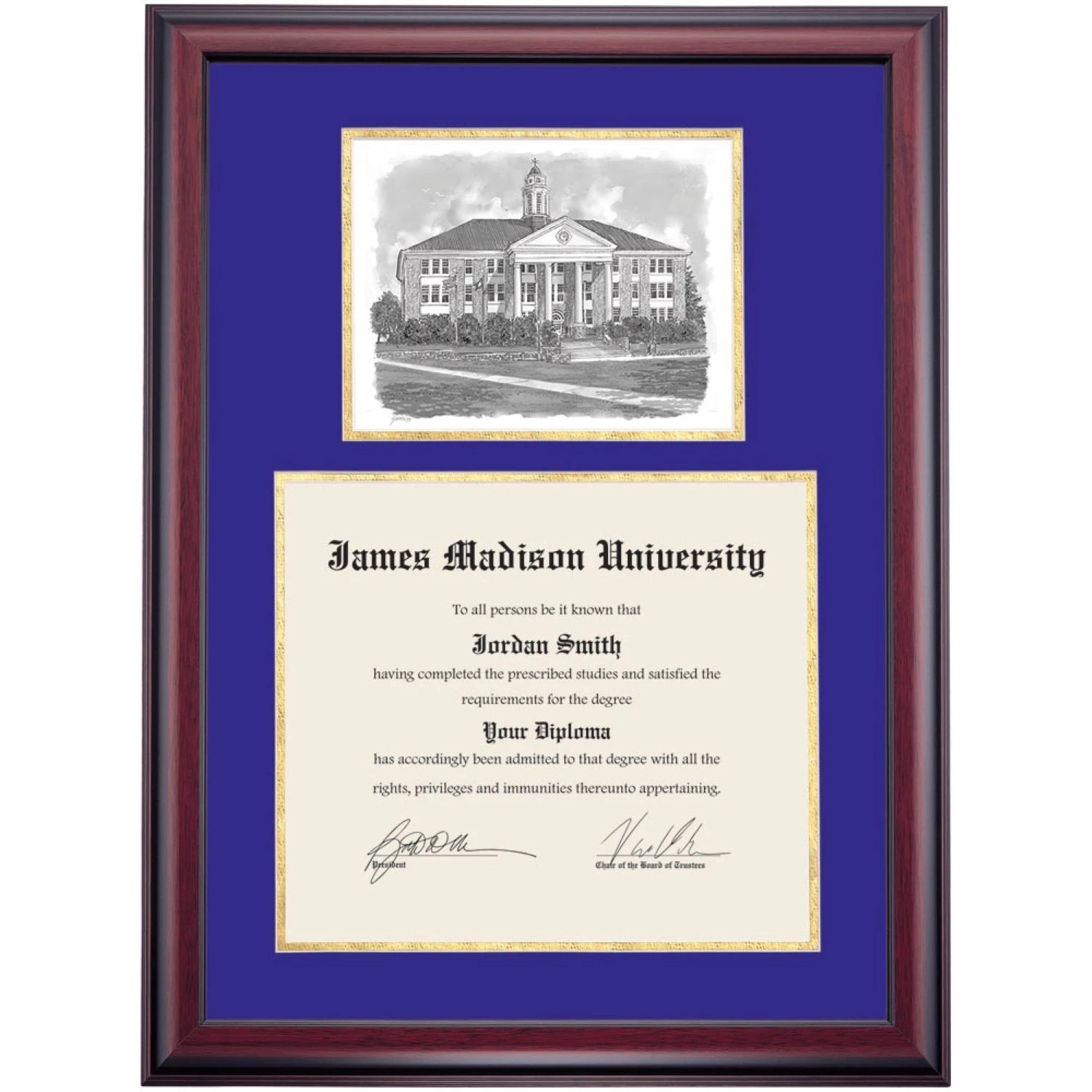 Celebrate your graduation in style with this handcrafted premier diploma frame which includes a Professional Print of Wilson Hall. Custom crafted to fit your James Madison University diploma, this frame features accent matting and high quality hardwood moulding.