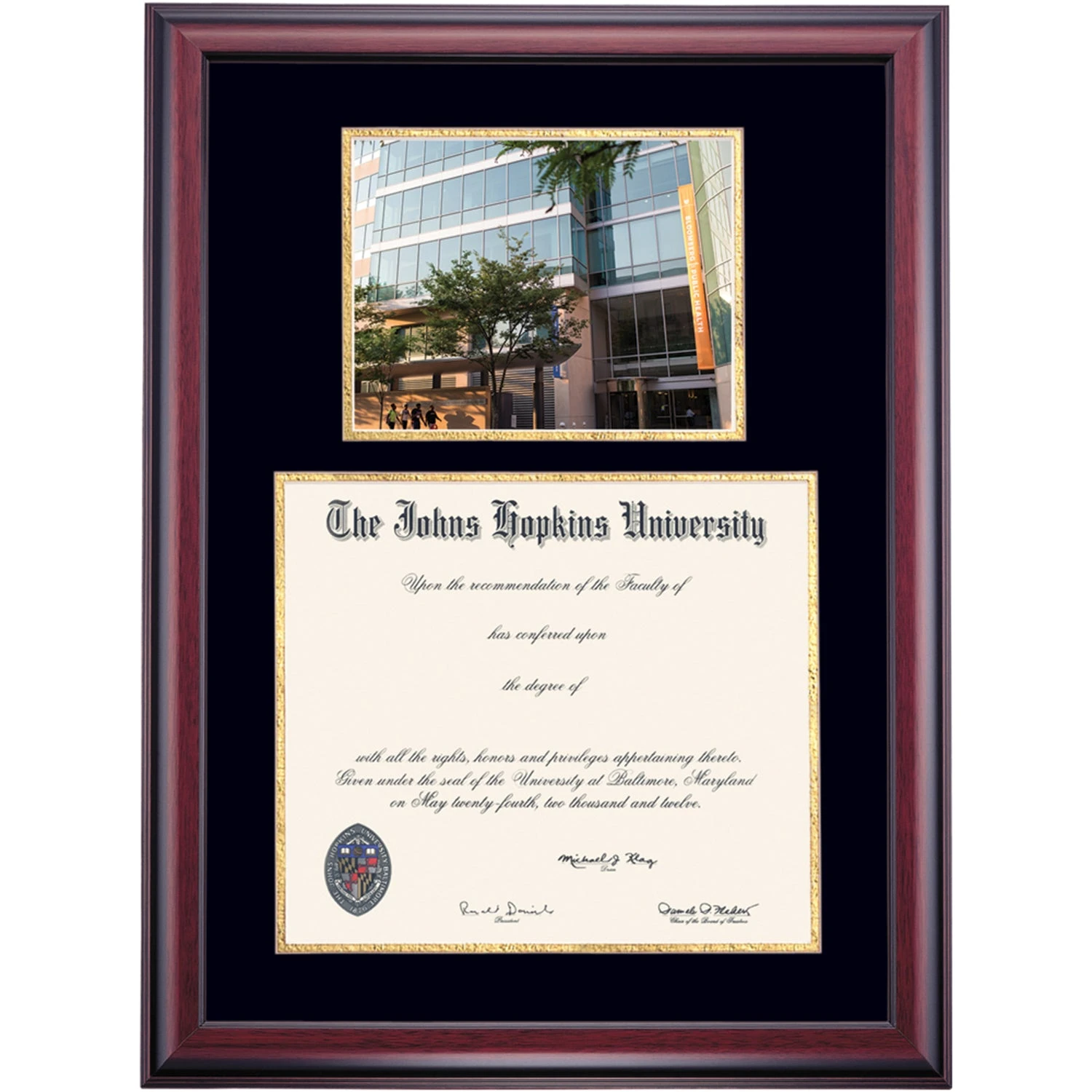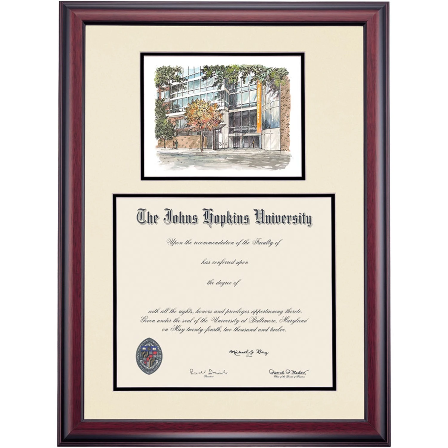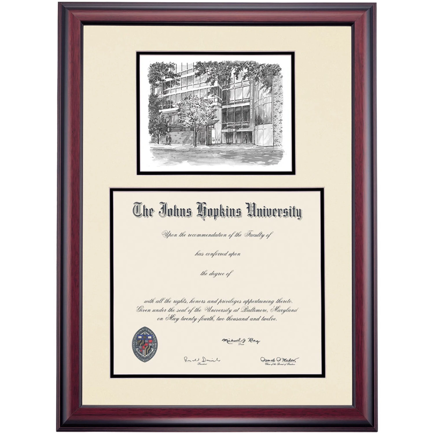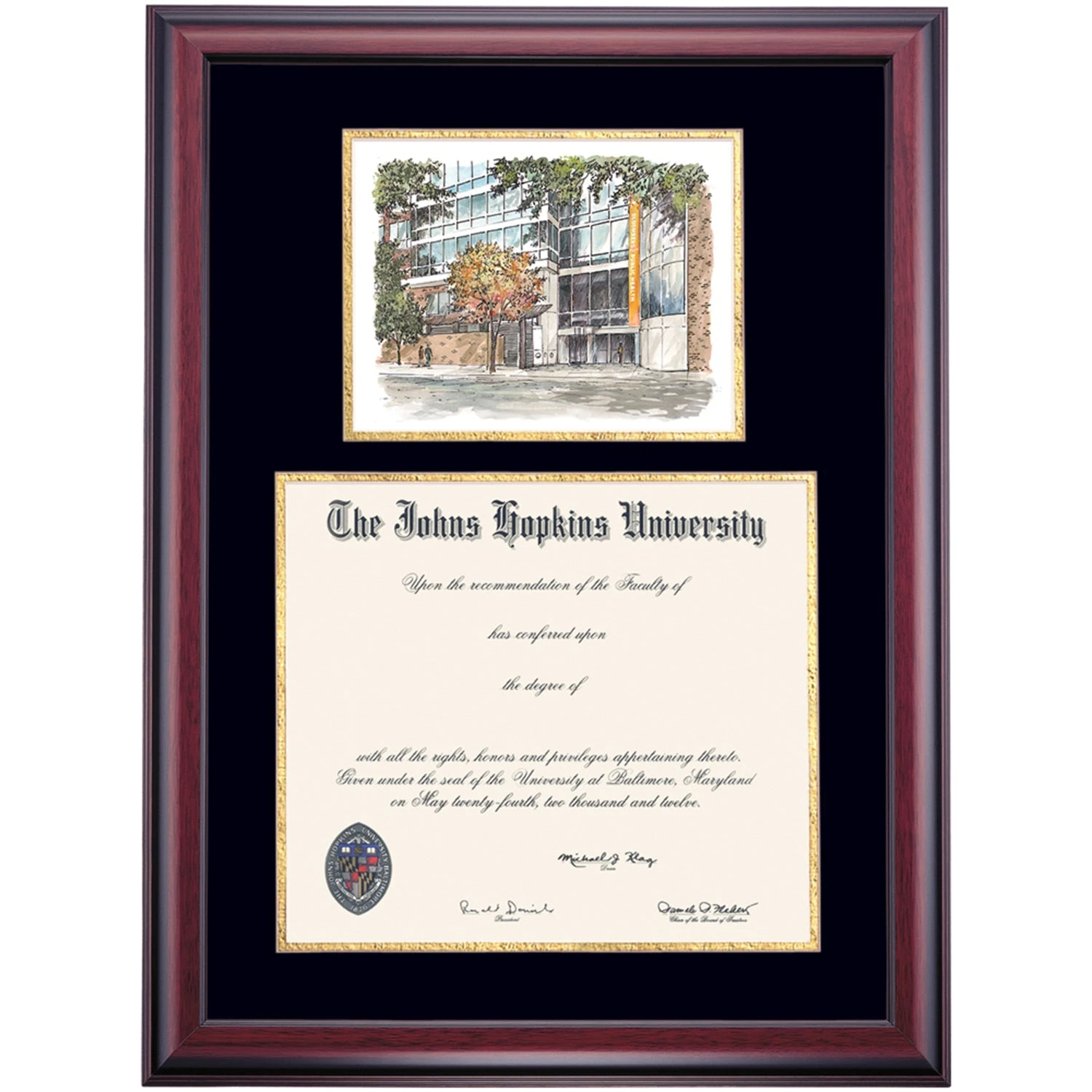 Celebrate your graduation in style with this handcrafted premier diploma frame which includes a Professional Print of the Bloomberg School of Public Health. Custom crafted to fit your Johns Hopkins University diploma, this frame features accent matting and high quality hardwood moulding.