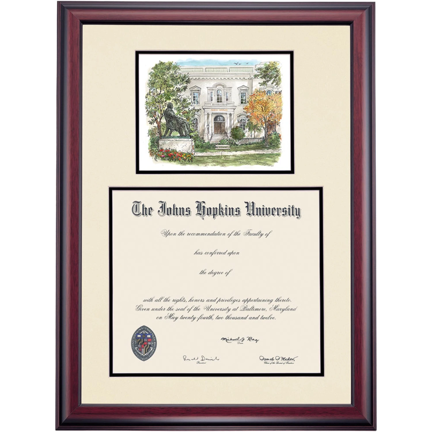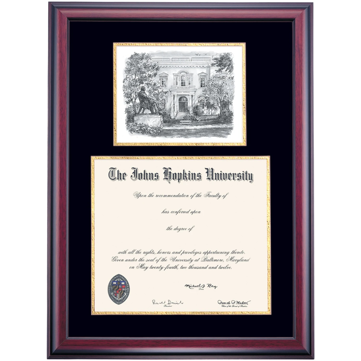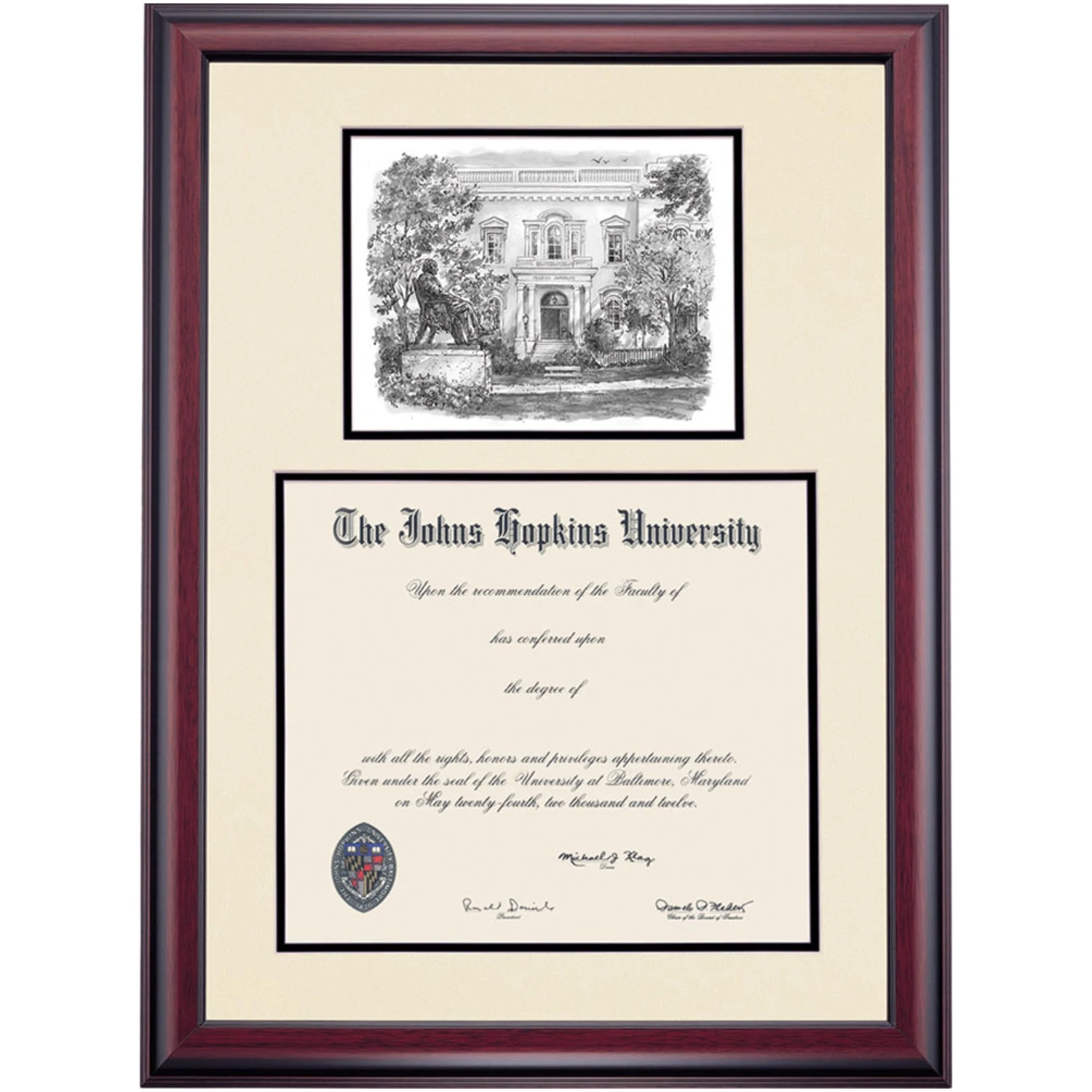 Celebrate your graduation in style with this handcrafted premier diploma frame which includes a Professional Print of Peabody Conservatory. Custom crafted to fit your Johns Hopkins University diploma, this frame features accent matting and high quality hardwood moulding.