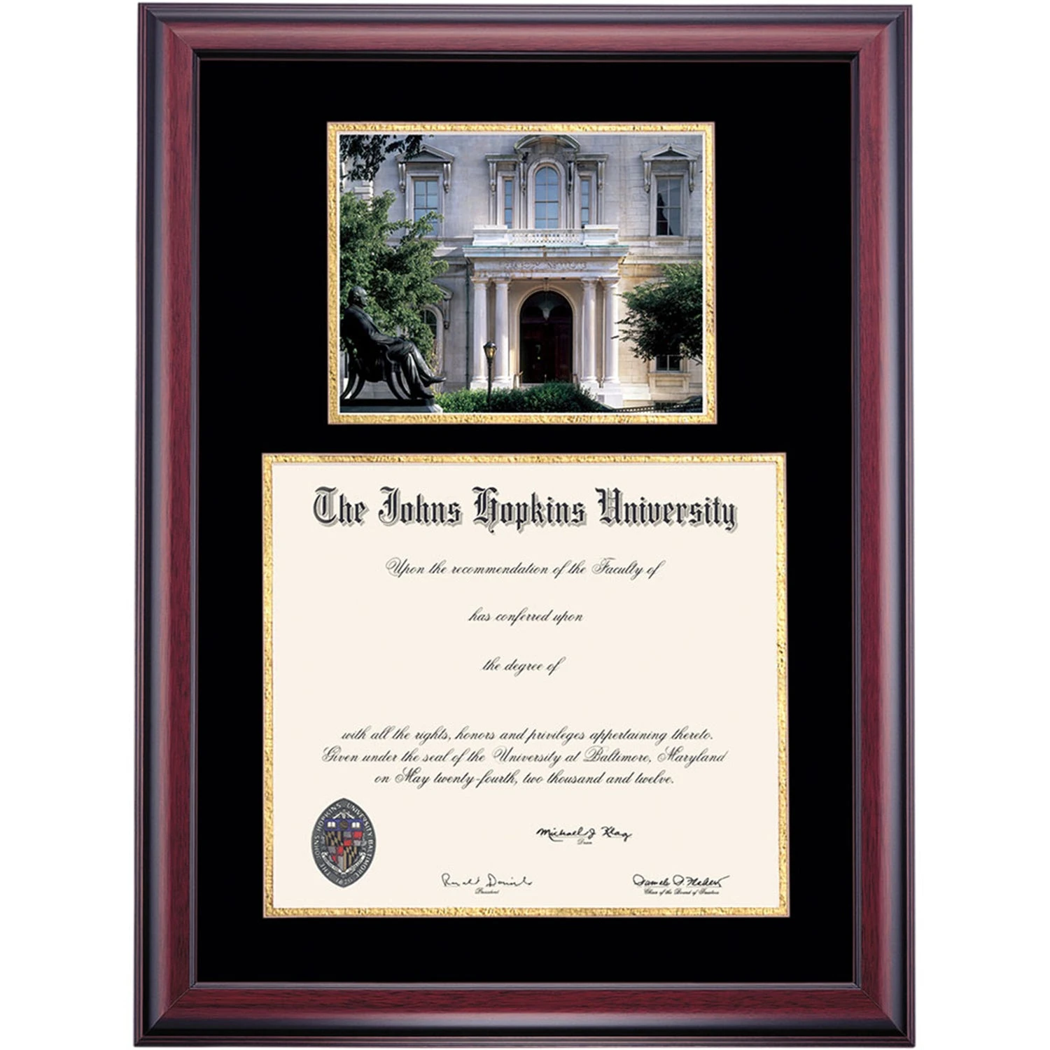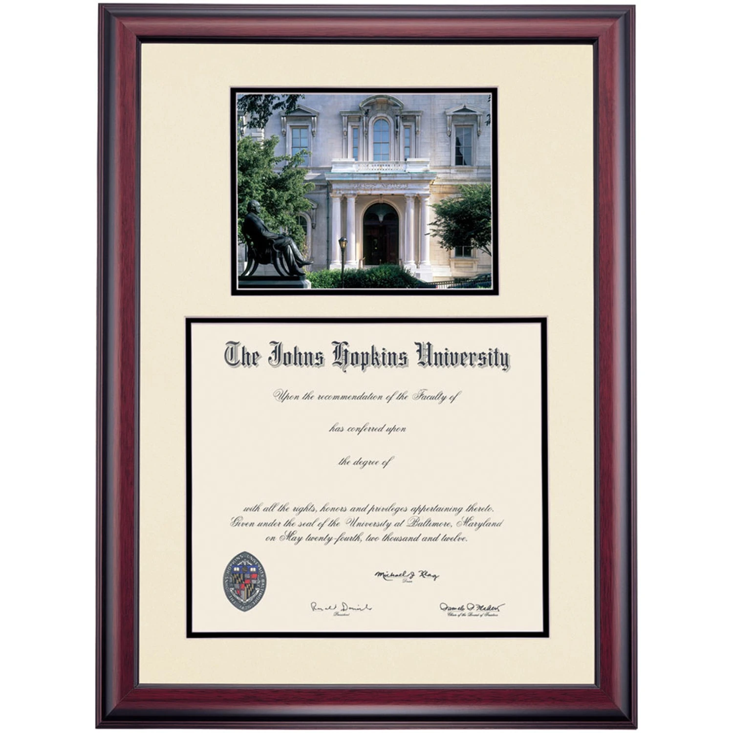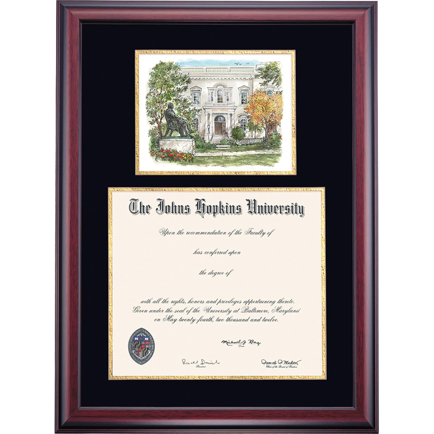 Celebrate your graduation in style with this handcrafted premier diploma frame which includes a Professional Print of Peabody Conservatory. Custom crafted to fit your Johns Hopkins University diploma, this frame features accent matting and high quality hardwood moulding.