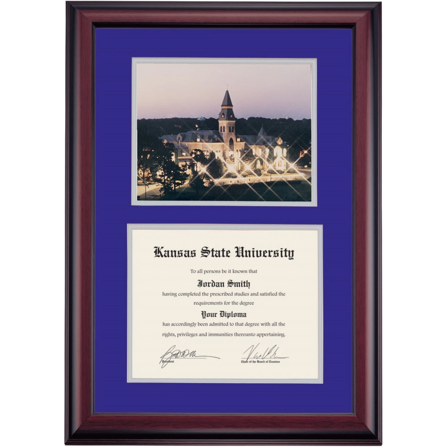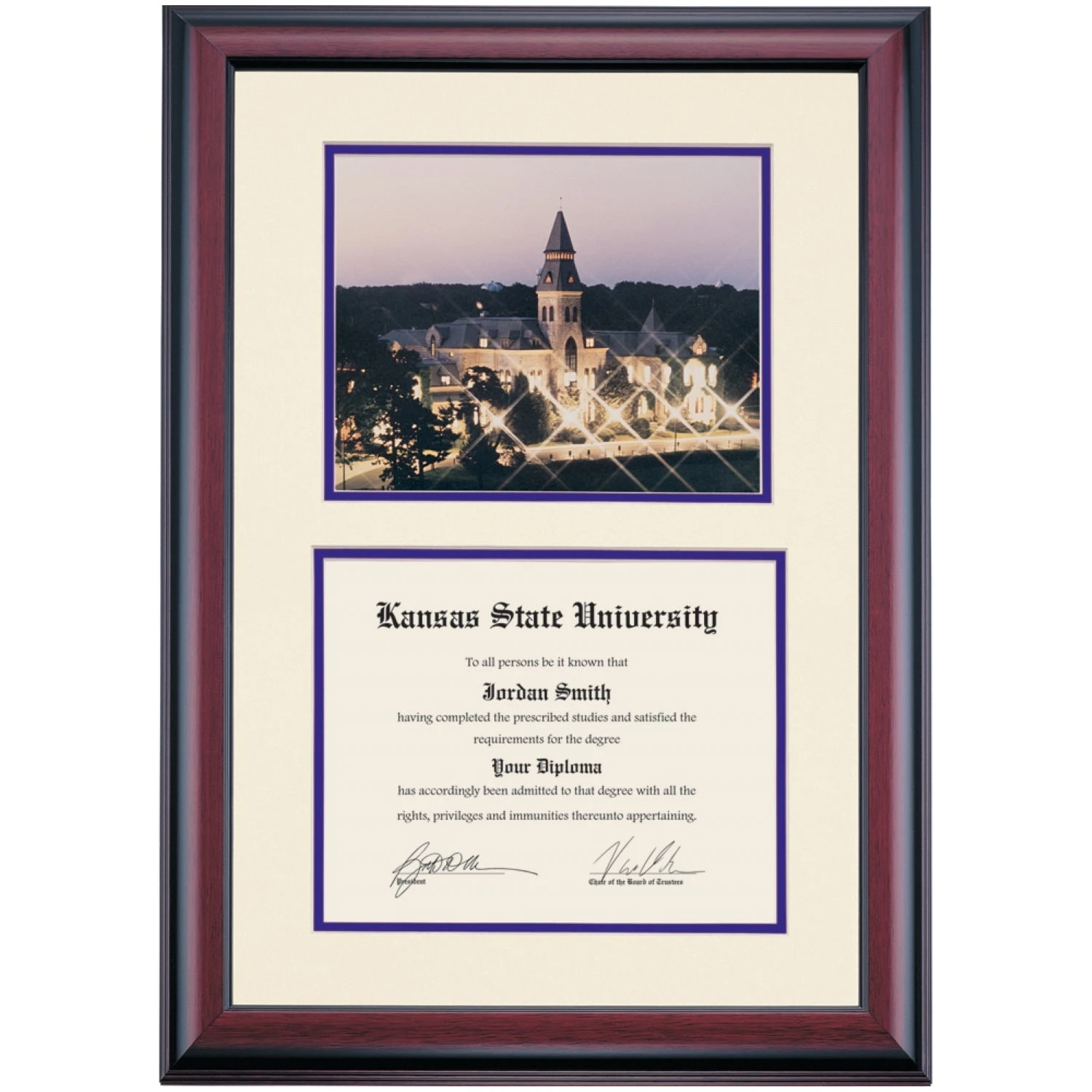 Celebrate your graduation in style with this handcrafted premier diploma frame which includes a Professional Photograph of Anderson Hall at Night. Custom crafted to fit your Kansas State University diploma, this frame features accent matting and high quality hardwood moulding.