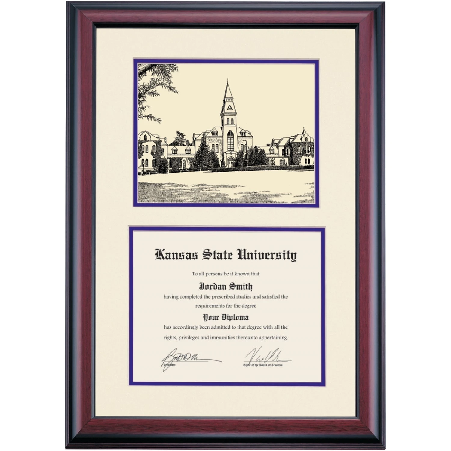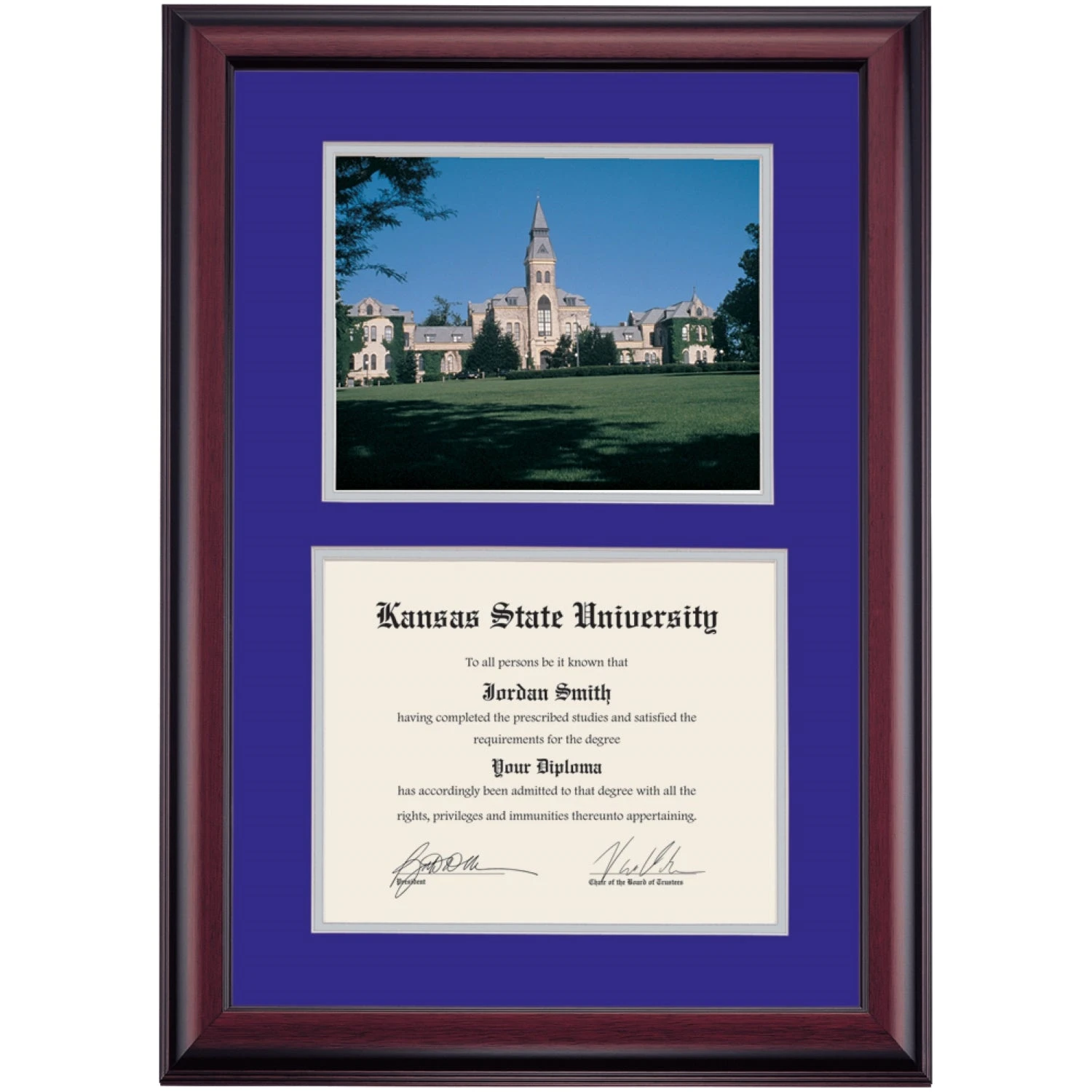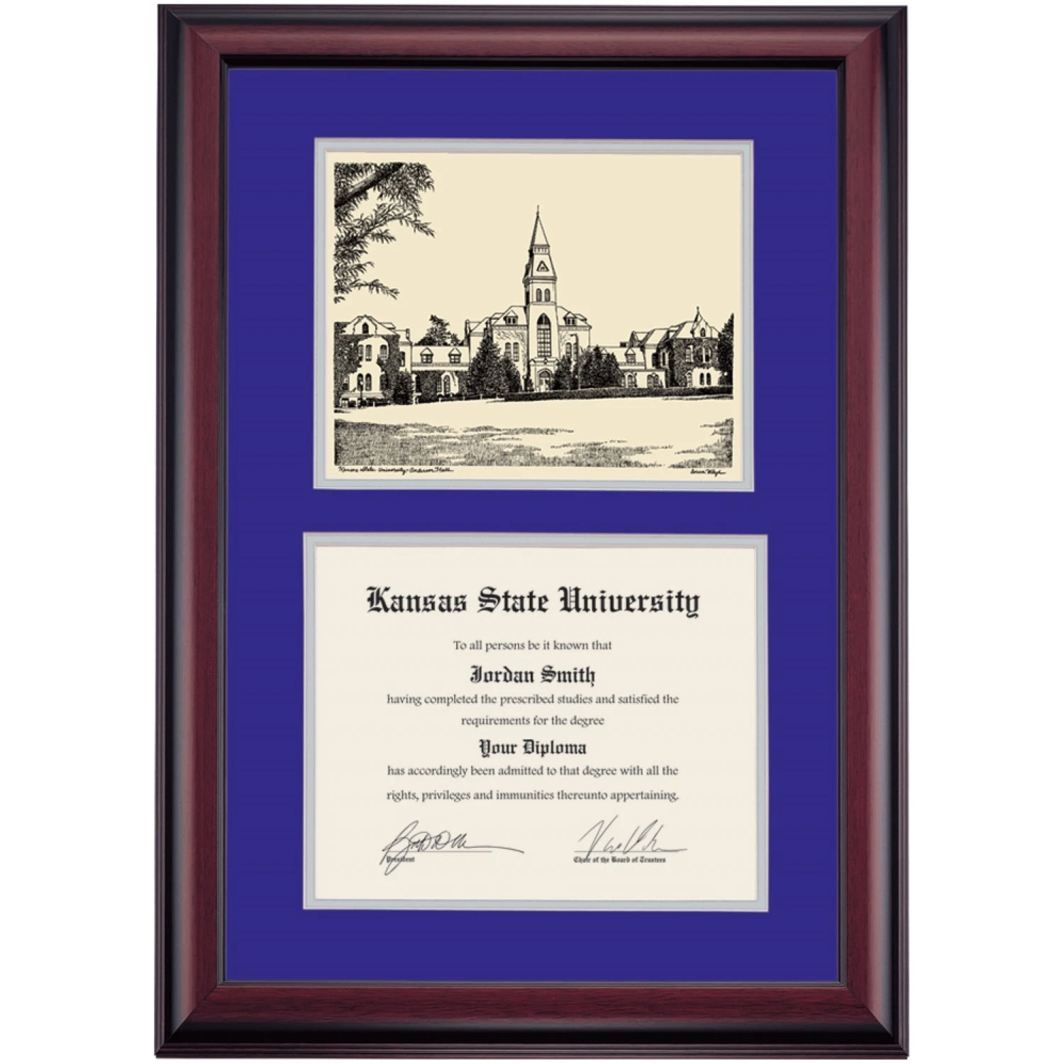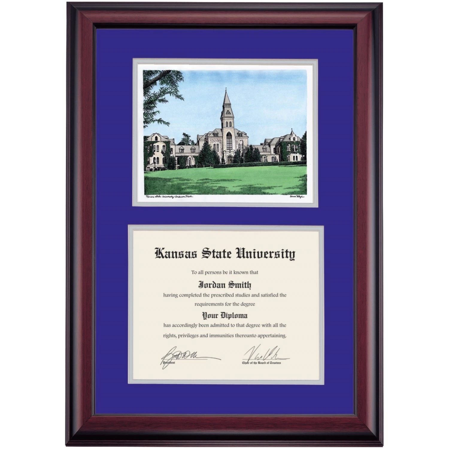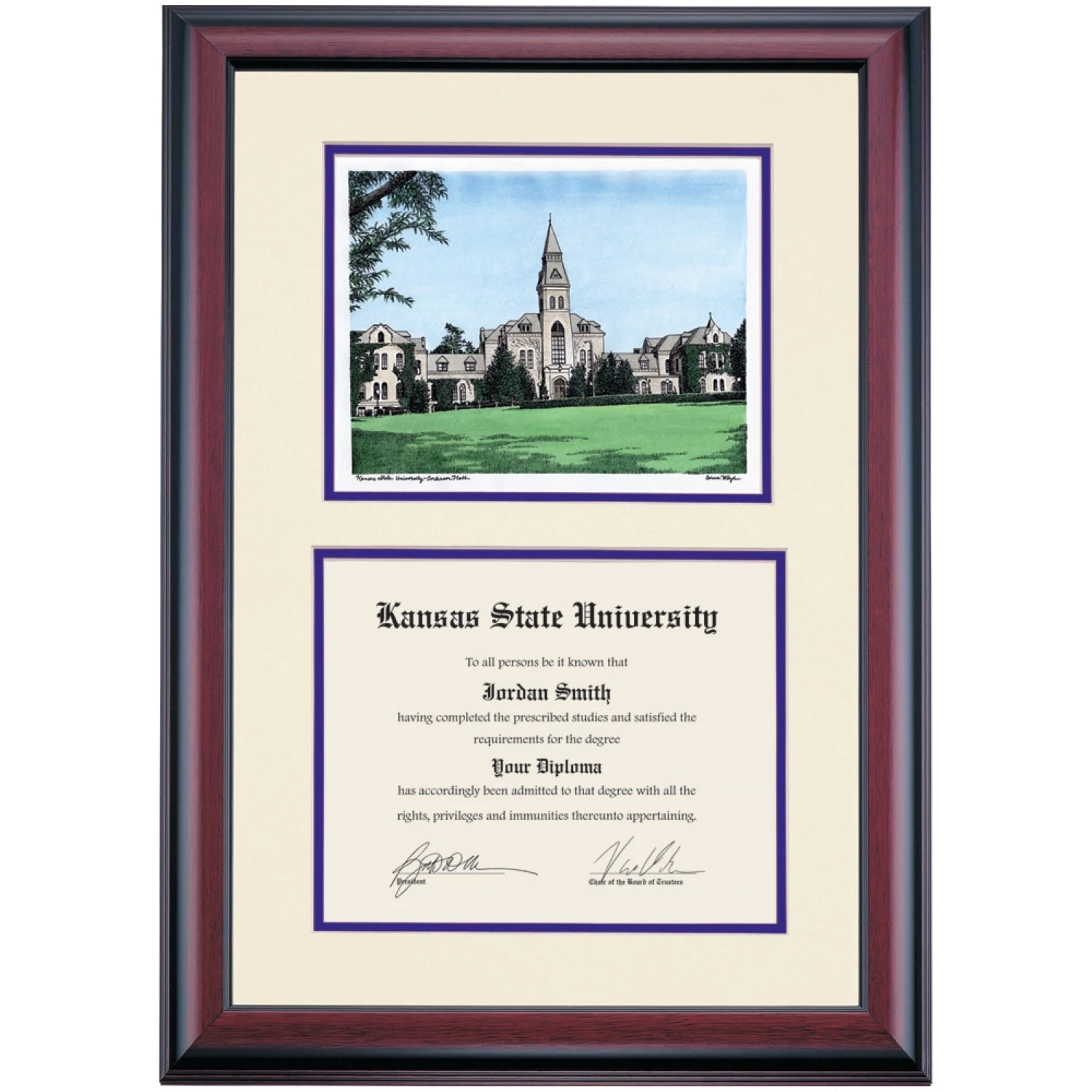 Celebrate your graduation in style with this handcrafted premier diploma frame which includes a Professional Print of Anderson Hall. Custom crafted to fit your Kansas State University diploma, this frame features accent matting and high quality hardwood moulding.
