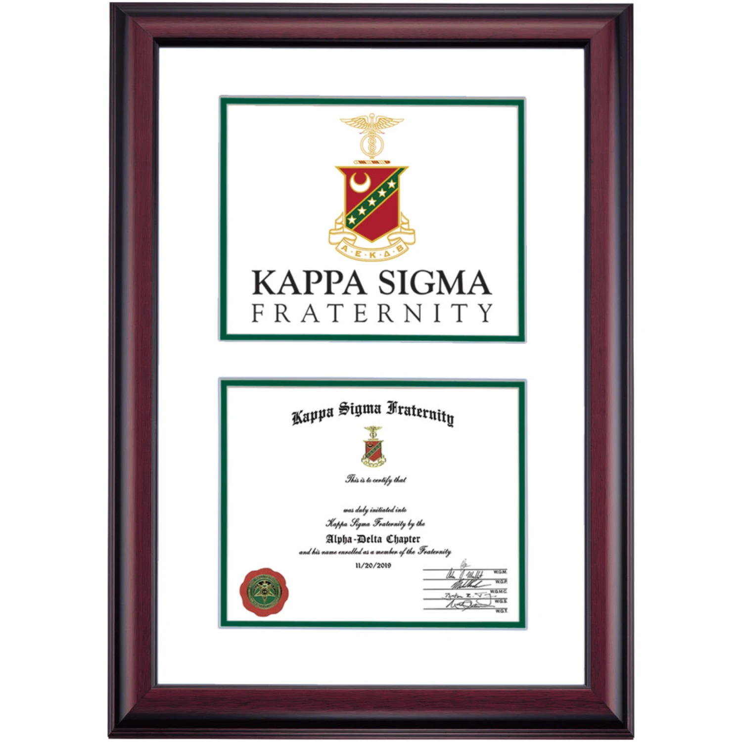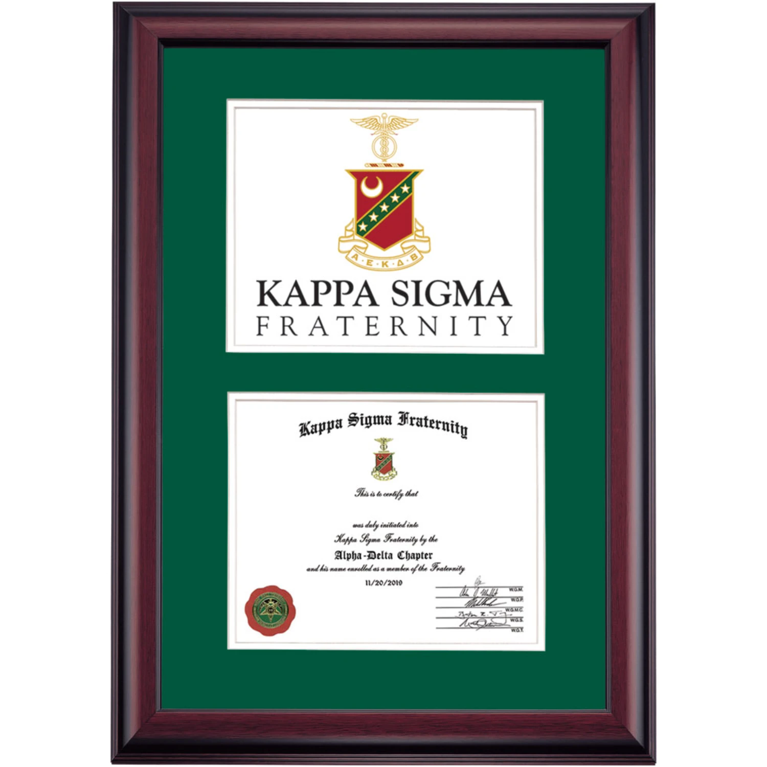 Celebrate with this handcrafted premier certificate frame which includes a Professional Photograph of the Kappa Sigma Fraternity Crest. Custom crafted to fit your Kappa Sigma Master of Ritual certificate, this frame features accent matting and high quality hardwood moulding.