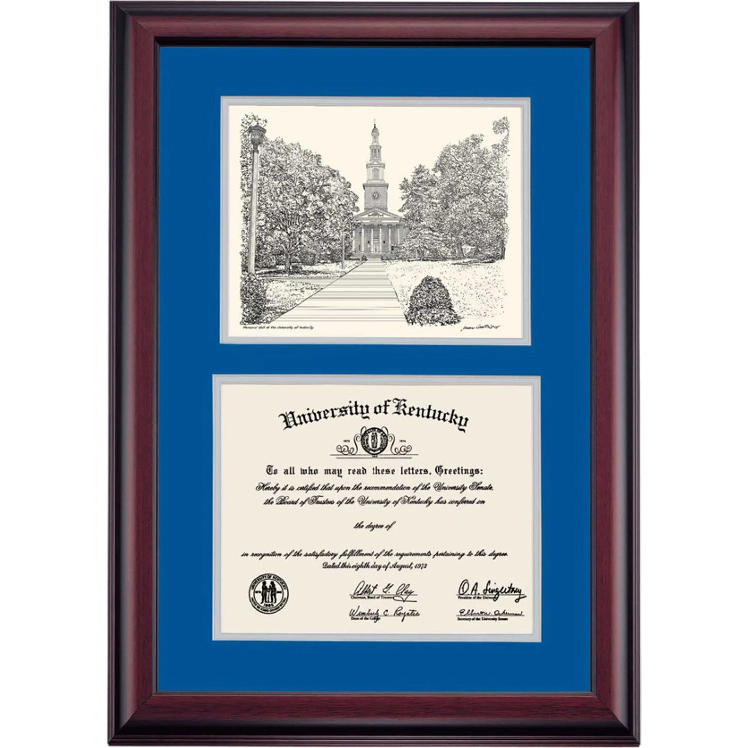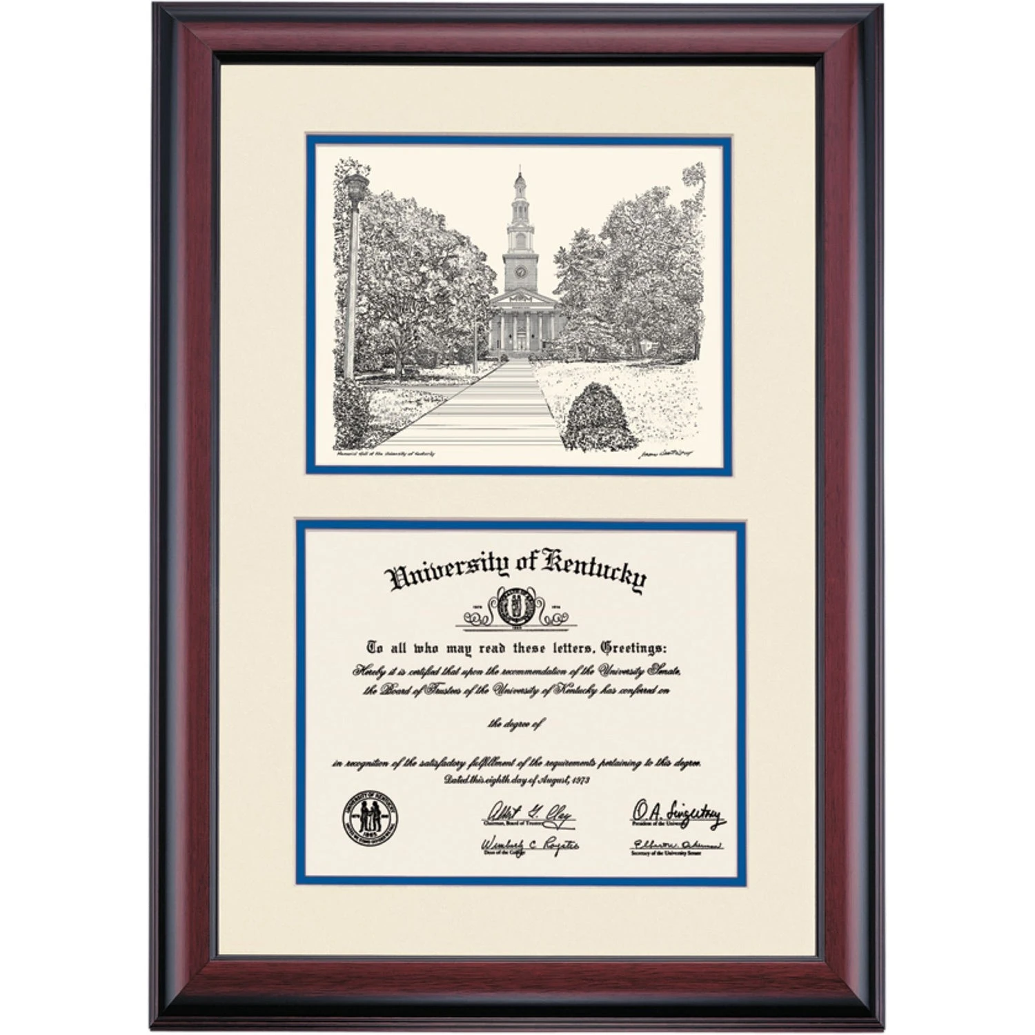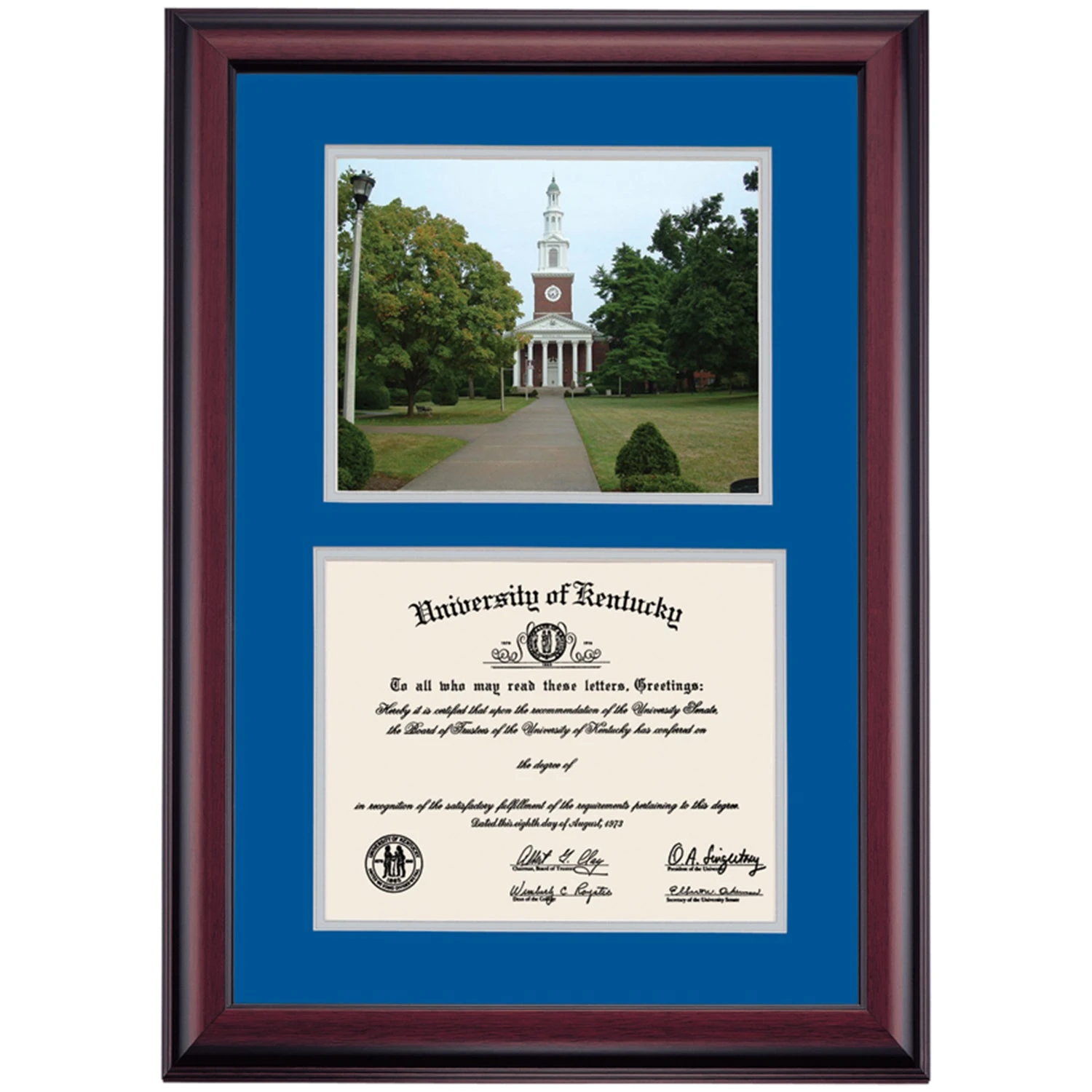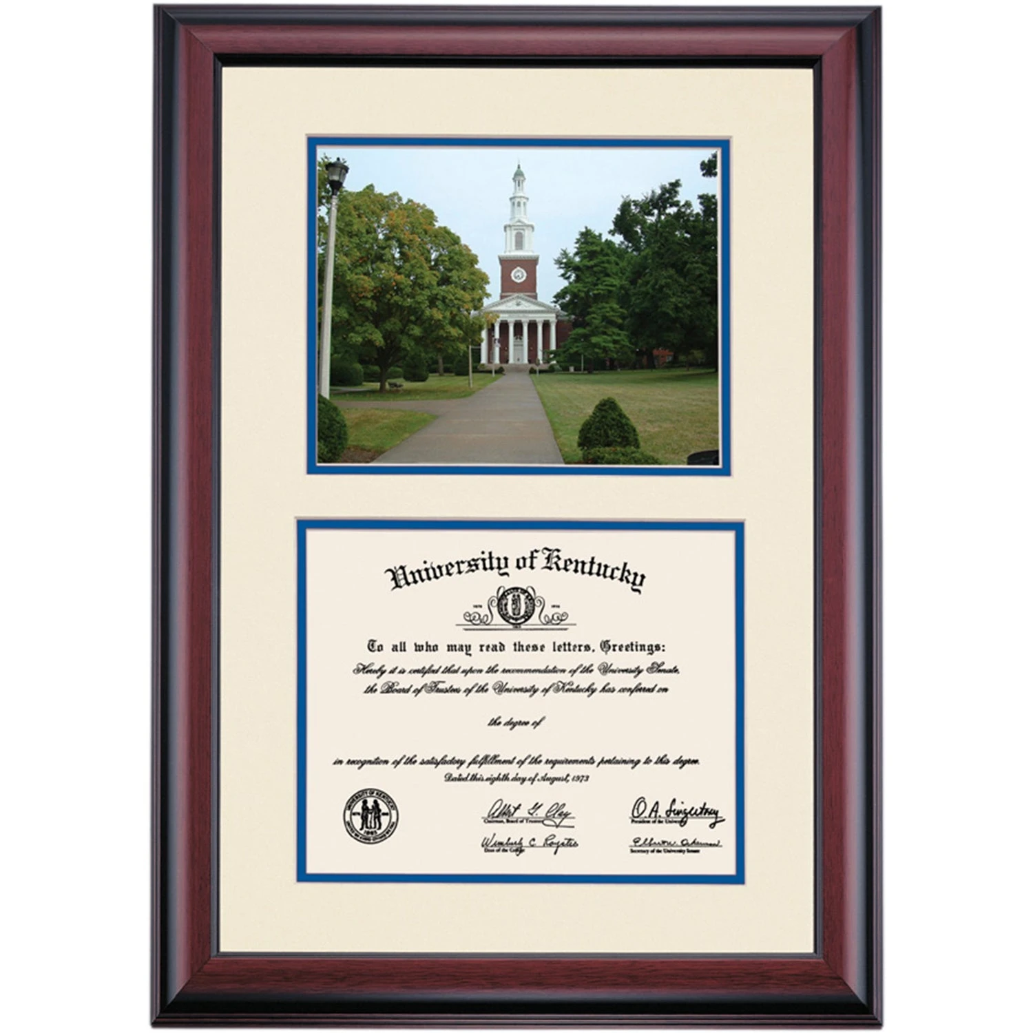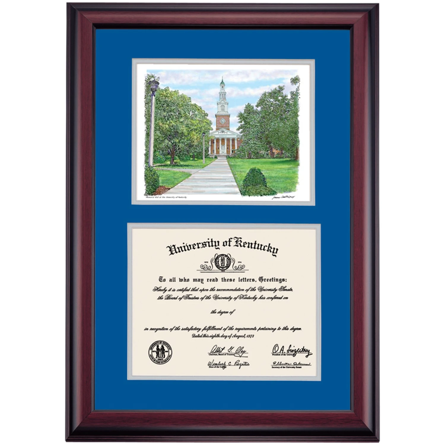 Celebrate your graduation in style with this handcrafted premier diploma frame which includes a Professional Print of Memorial Hall. Custom crafted to fit your University of Kentucky diploma, this frame features accent matting and high quality hardwood moulding.