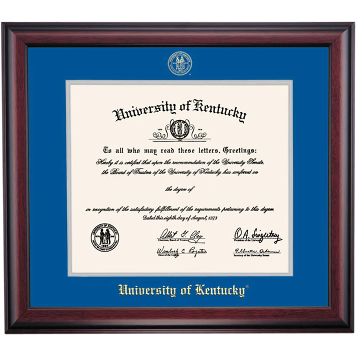 Celebrate your graduation in style with this handcrafted diploma frame. Custom crafted to fit your University of Kentucky College of Medicine diploma, this frame is embossed with your school name and seal and features Royal/Grey accent matting and high quality hardwood moulding.