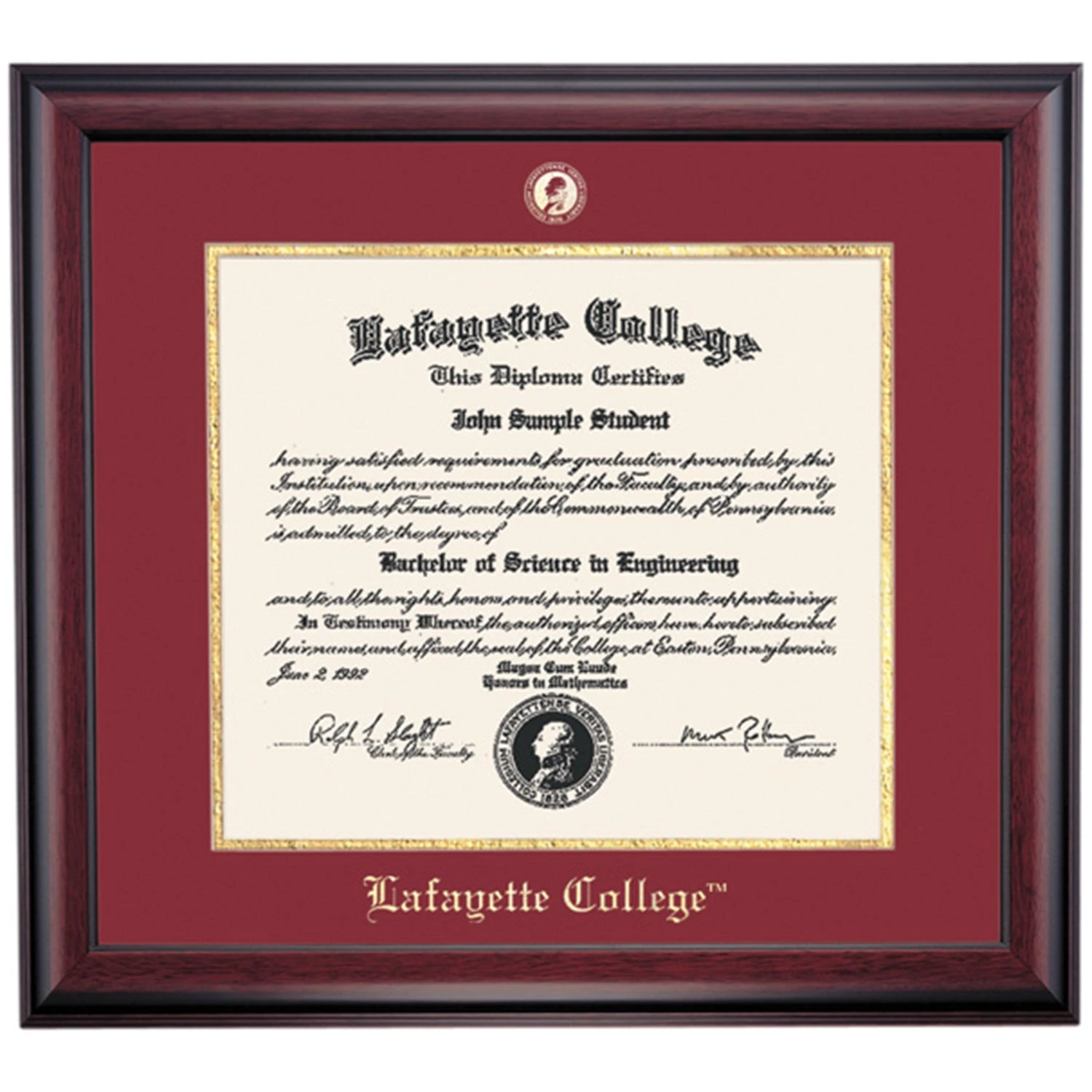 Celebrate your graduation in style with this handcrafted diploma frame. Custom crafted to fit your Lafayette College diploma, this frame is embossed with your school name and seal and features Maroon/Gold accent matting and high quality hardwood moulding.