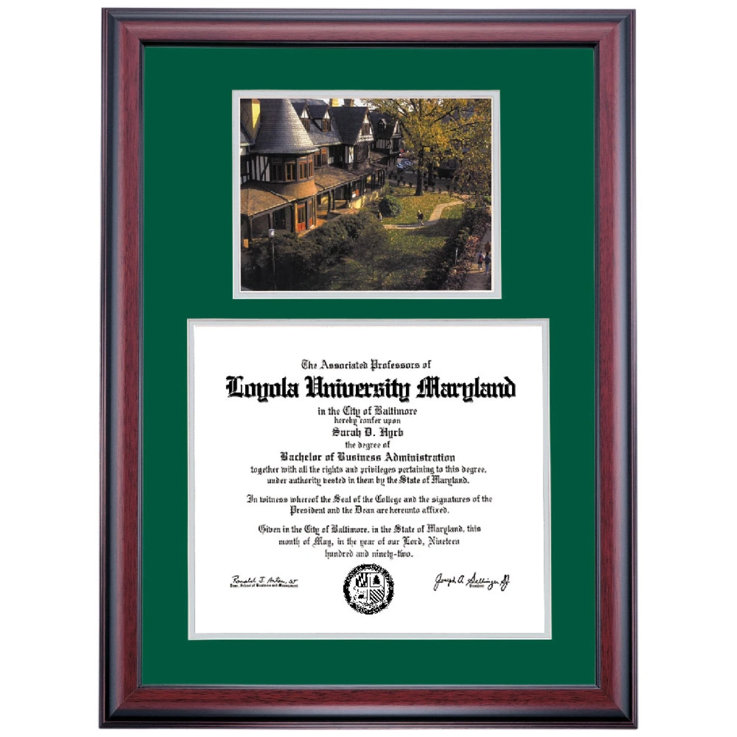 Celebrate your graduation in style with this handcrafted premier diploma frame which includes a Professional Print of the Humanities Building. Custom crafted to fit your Loyola University Maryland diploma, this frame features accent matting and high quality hardwood moulding.