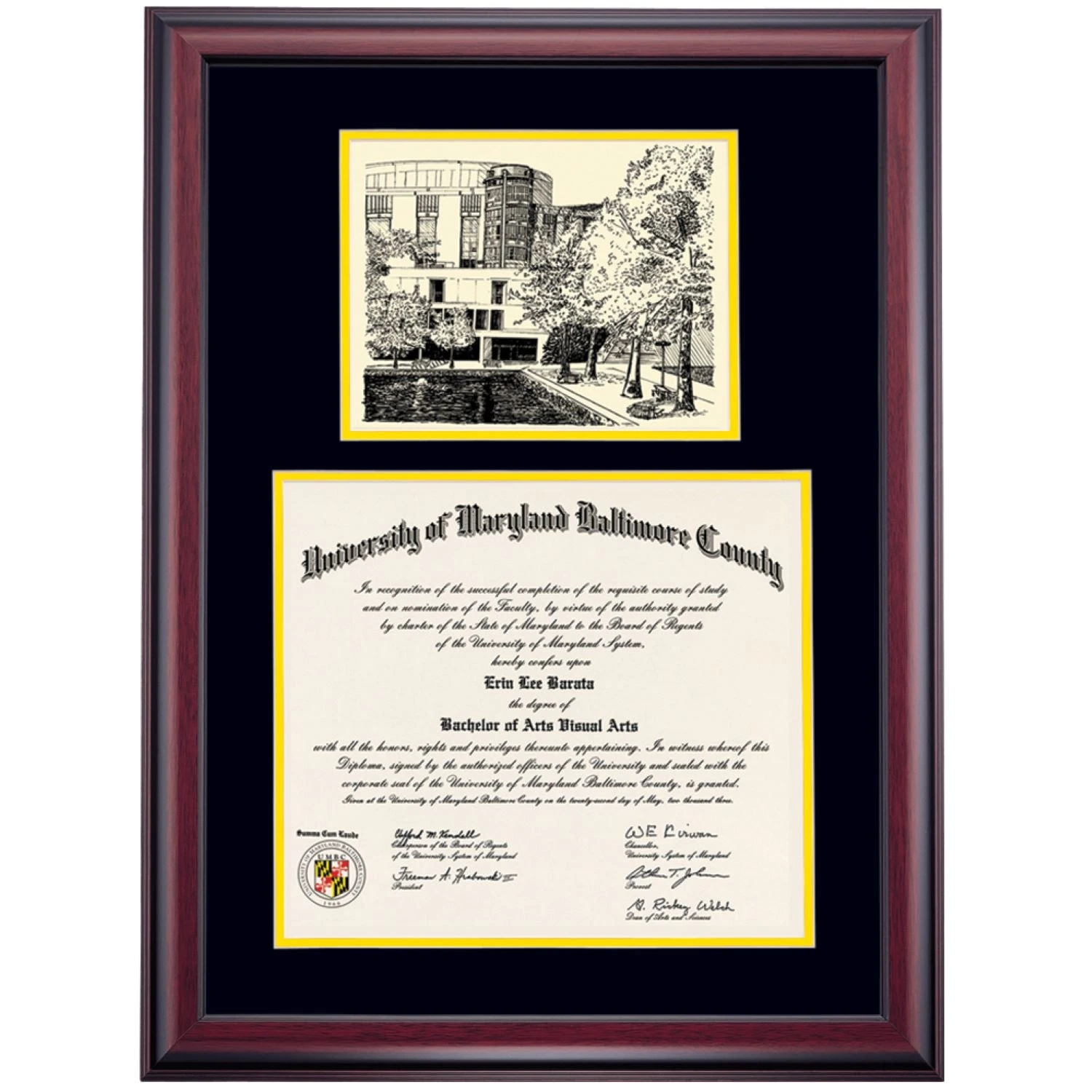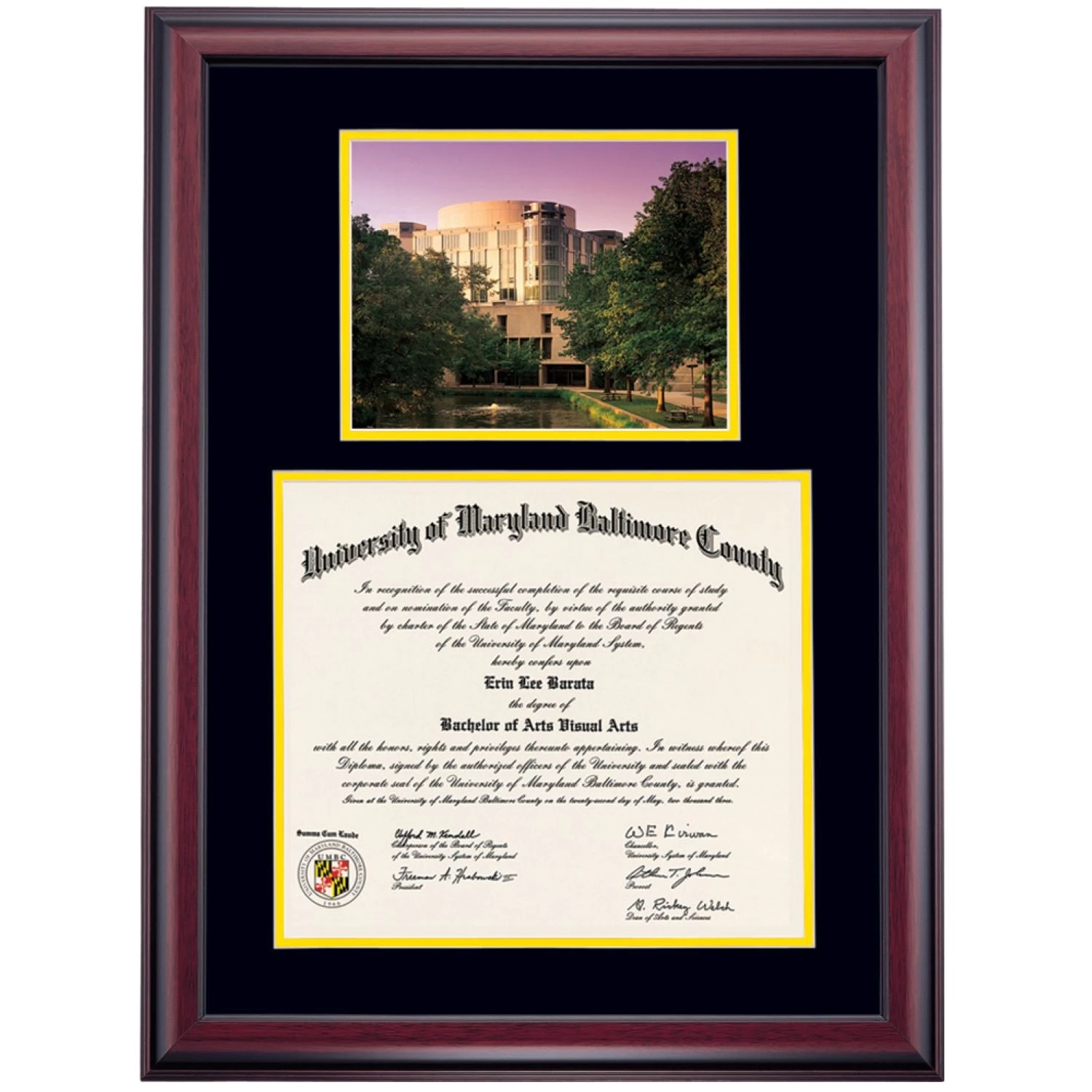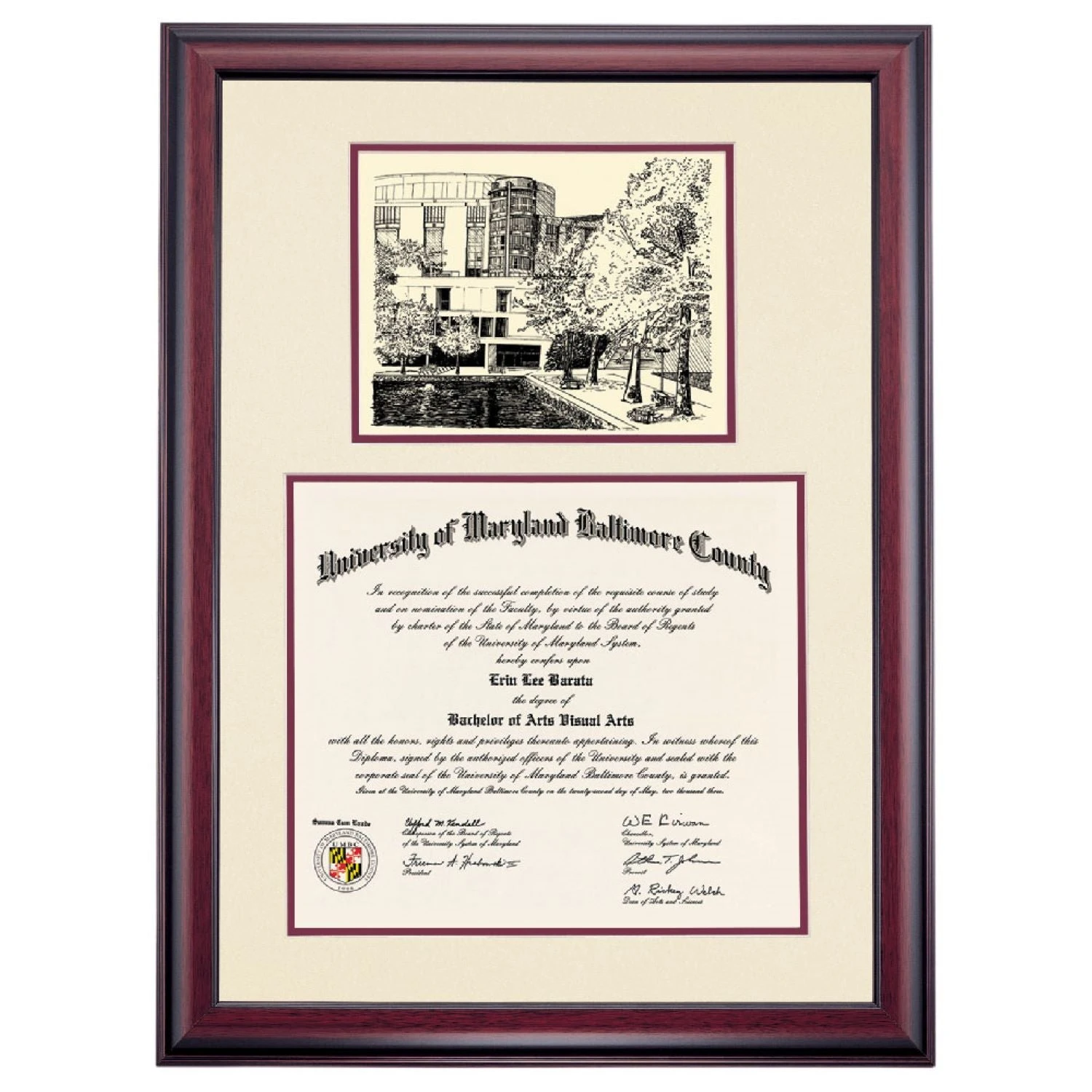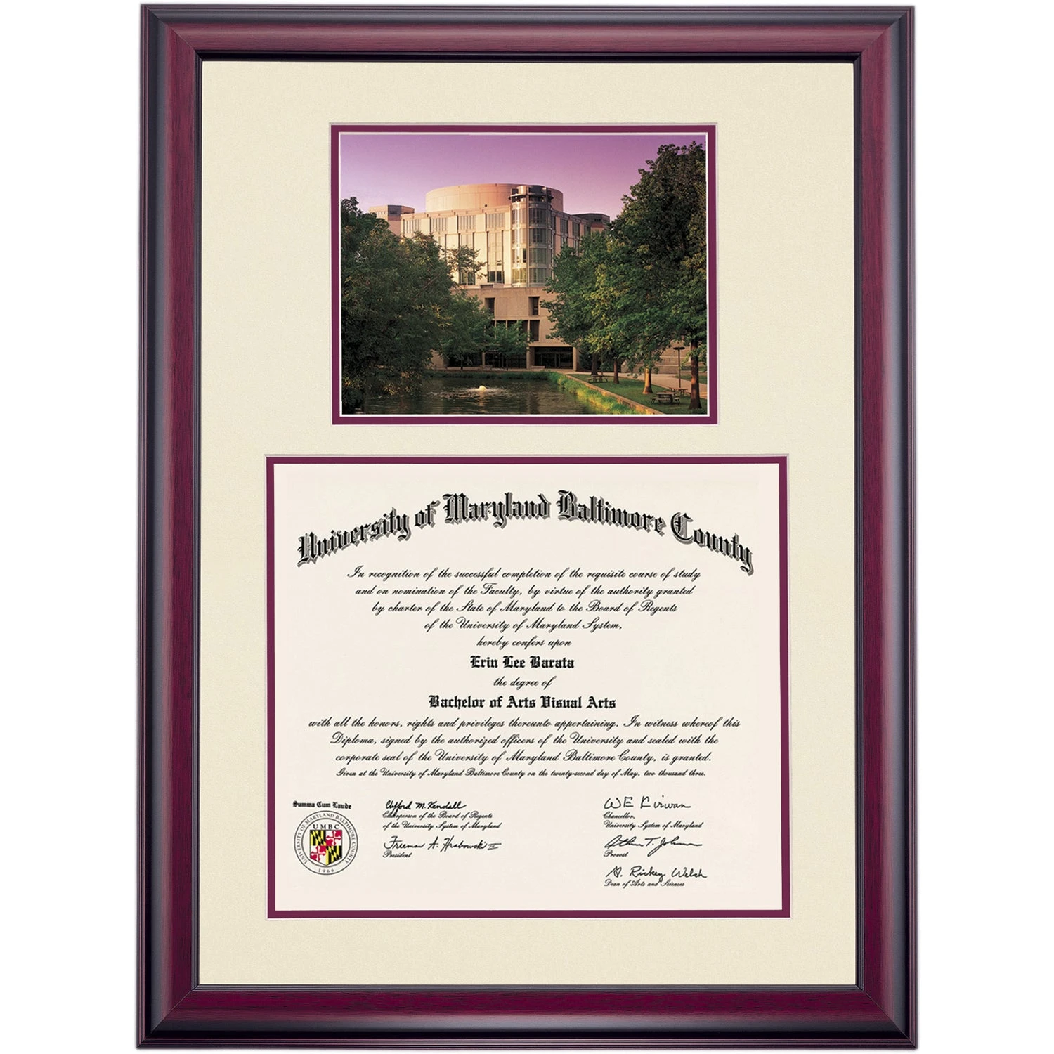 Celebrate your graduation in style with this handcrafted premier diploma frame which includes a Professional Print of the Albin O. Kuhn Library. Custom crafted to fit your University of Maryland-Baltimore County diploma, this frame features accent matting and high quality hardwood moulding.