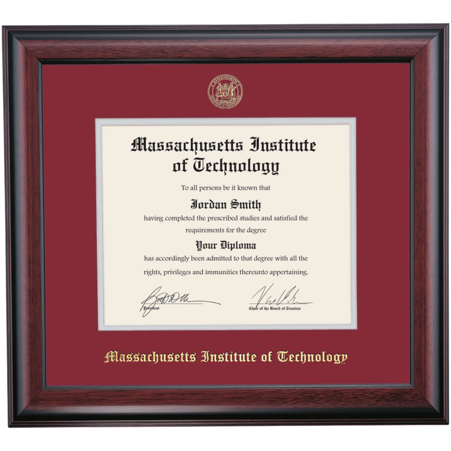 Celebrate your graduation in style with this handcrafted diploma frame. Custom crafted to fit your Massachusetts Institute of Technology diploma, this frame is embossed with your school name and seal and features Maroon/Grey accent matting and high quality hardwood moulding.