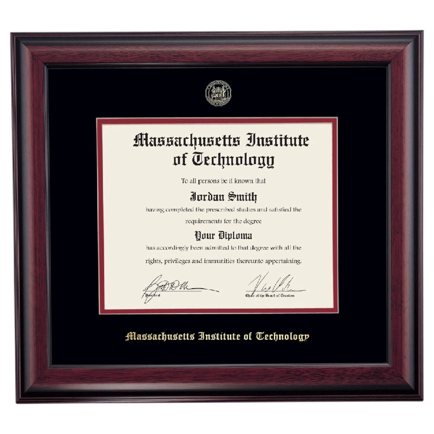 Celebrate your graduation in style with this handcrafted diploma frame. Custom crafted to fit your Massachusetts Institute of Technology diploma, this frame is embossed with your school name and seal and features Black/Maroon accent matting and high quality hardwood moulding.