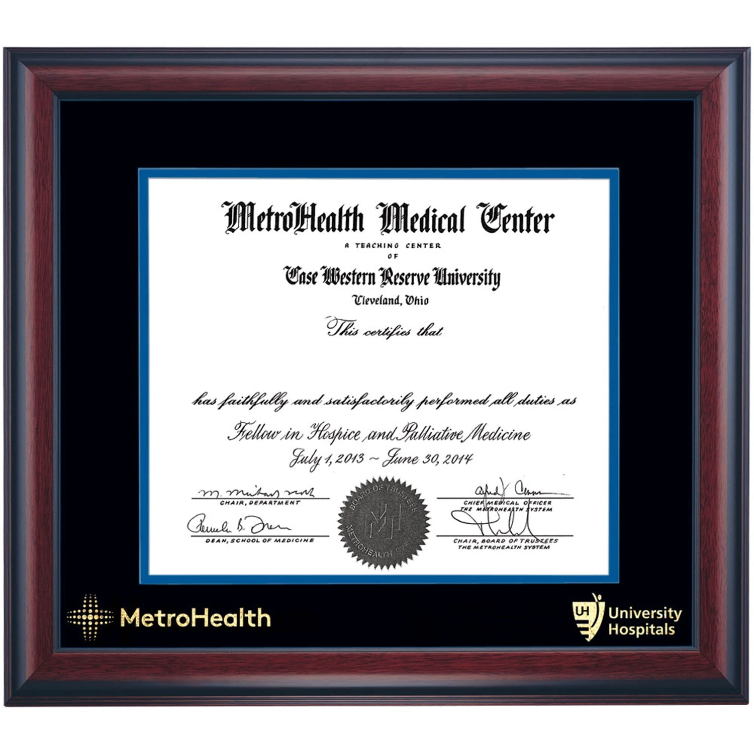 Celebrate your graduation in style with this handcrafted frame. Custom crafted to fit your MetroHealth Medical Center Certificate, this frame is embossed in gold leaf and features Royal/Black accent matting and high quality hardwood moulding.