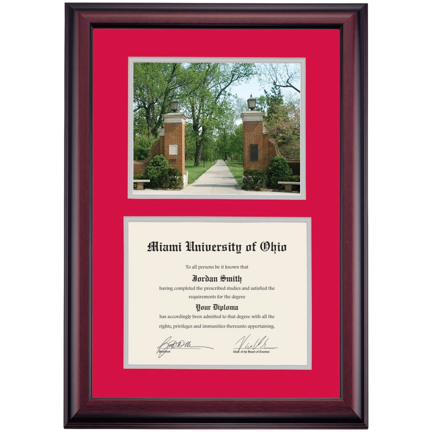 Celebrate your graduation in style with this handcrafted premier diploma frame which includes a Professional Print of Slant Walk. Custom crafted to fit your Miami University of Ohio diploma, this frame features accent matting and high quality hardwood moulding.