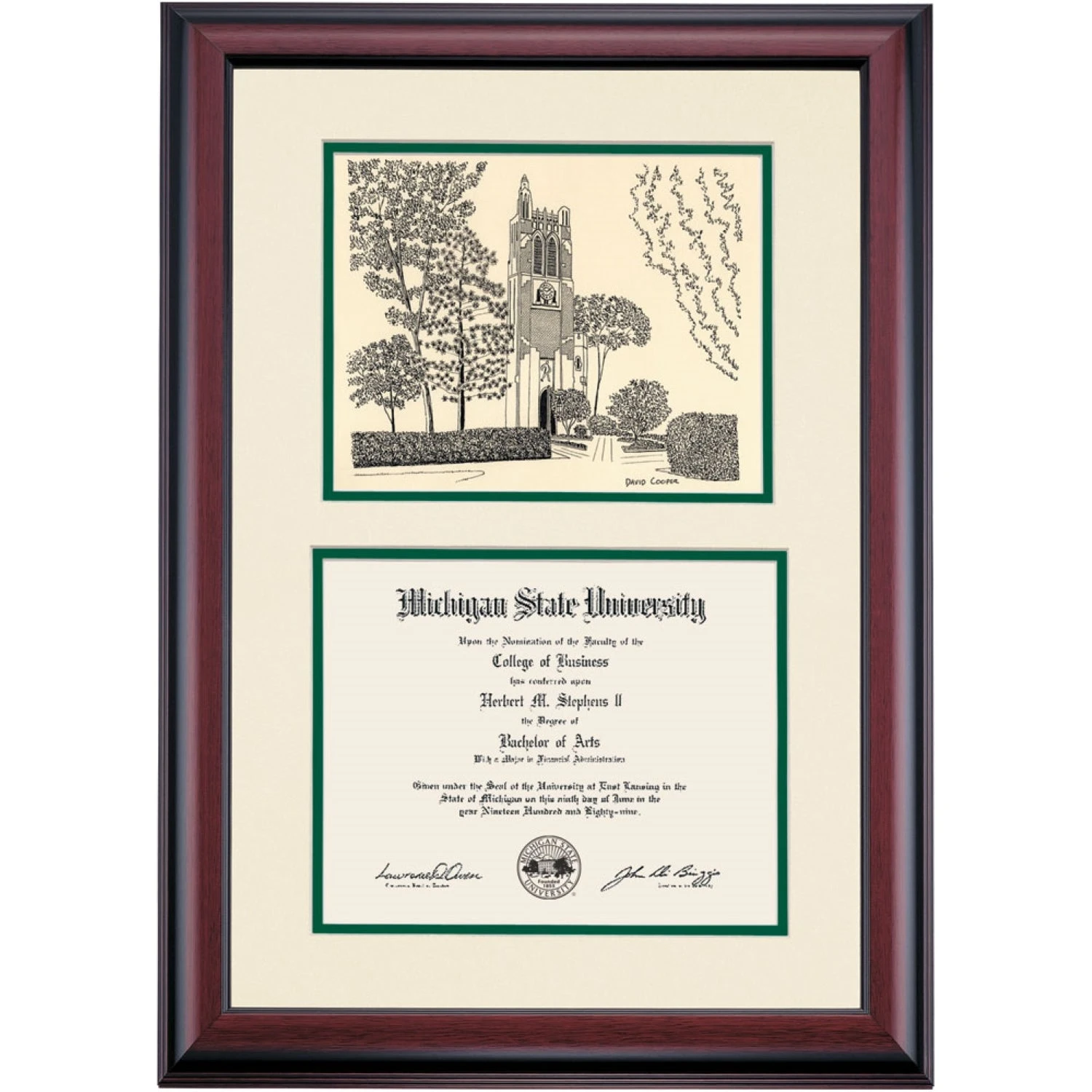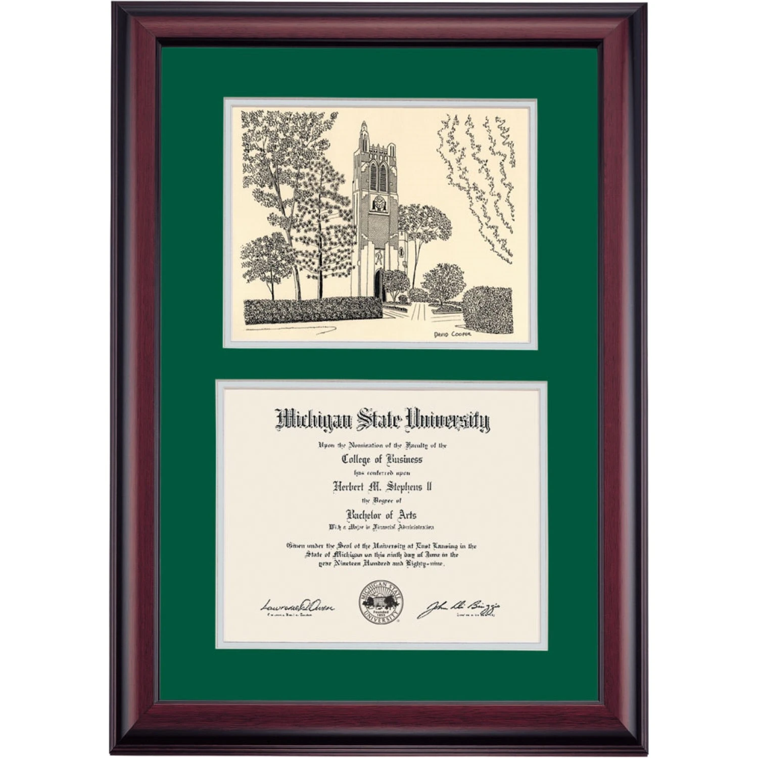 Celebrate your graduation in style with this handcrafted premier diploma frame which includes a Professional Print of Beaumont Tower. Custom crafted to fit your Michigan State University diploma, this frame features accent matting and high quality hardwood moulding.