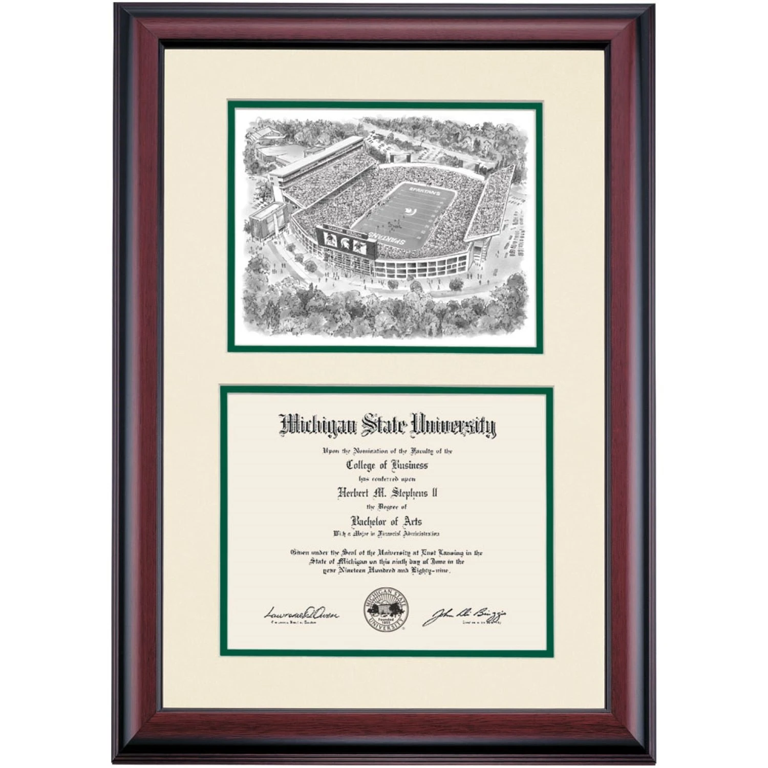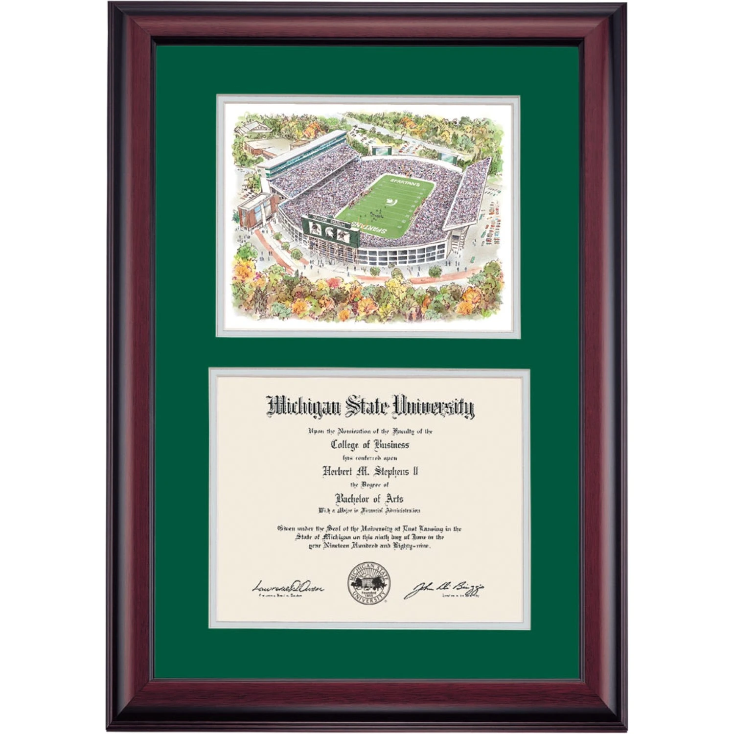 Celebrate your graduation in style with this handcrafted premier diploma frame which includes a Professional Print of Spartan Stadium. Custom crafted to fit your Michigan State University diploma, this frame features accent matting and high quality hardwood moulding.