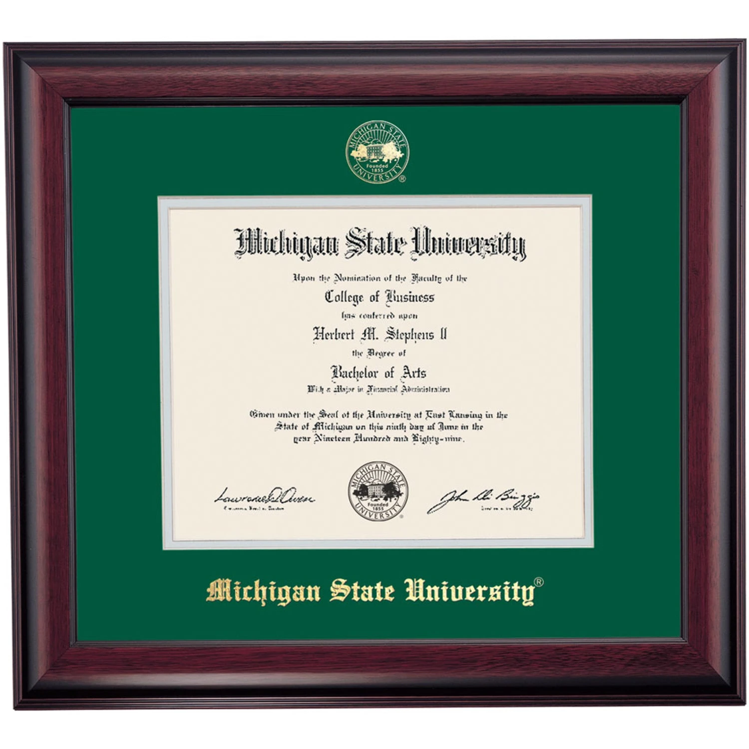 Celebrate your graduation in style with this handcrafted diploma frame. Custom crafted to fit your Michigan State University diploma, this frame is embossed with your school name and seal and features Hunter/Grey accent matting and high quality hardwood moulding.