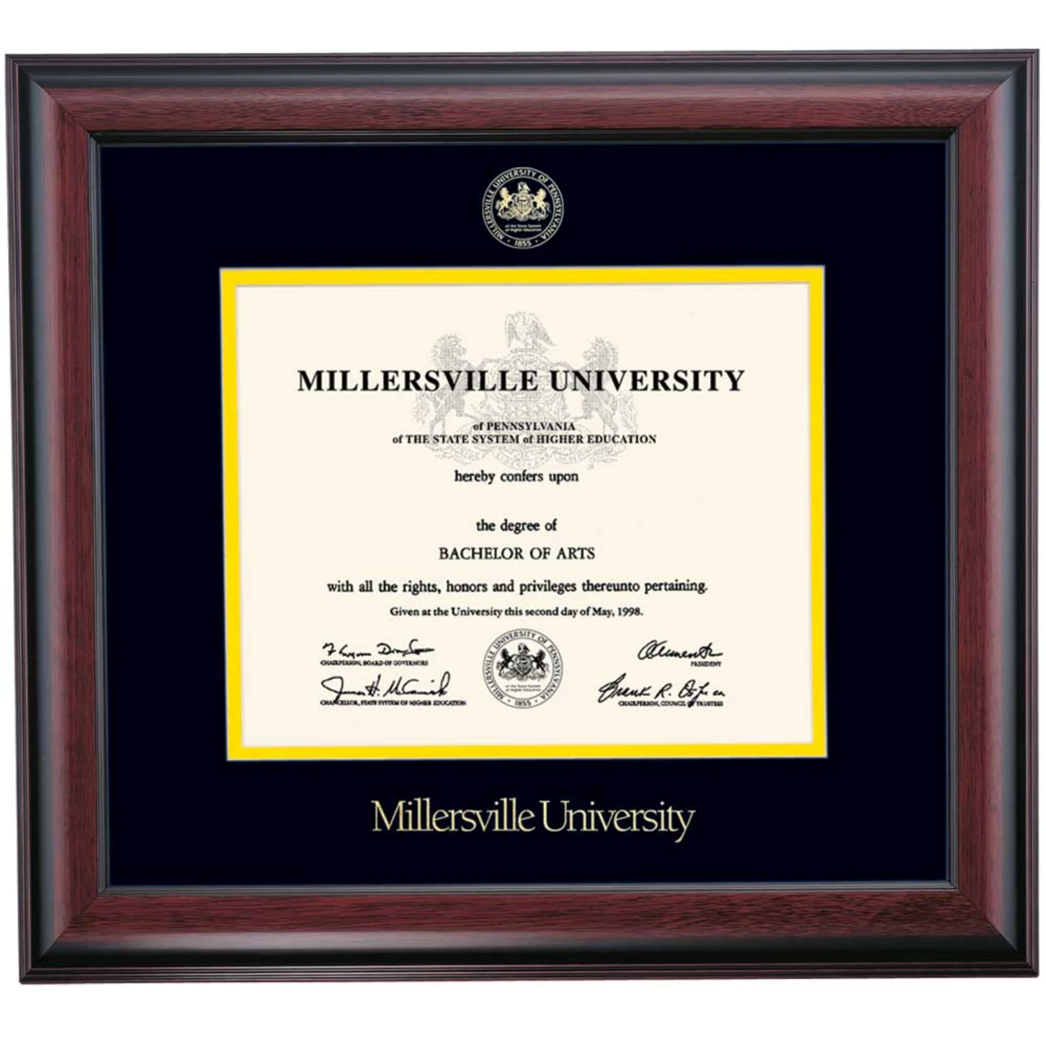 Celebrate your graduation in style with this handcrafted diploma frame. Custom crafted to fit your Millersville University diploma, this frame is embossed with your school name and seal and features Black/Yellow accent matting and high quality hardwood moulding.